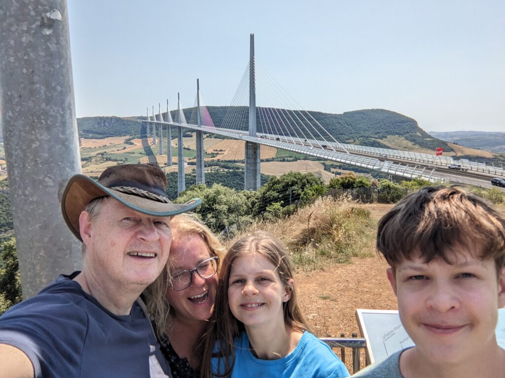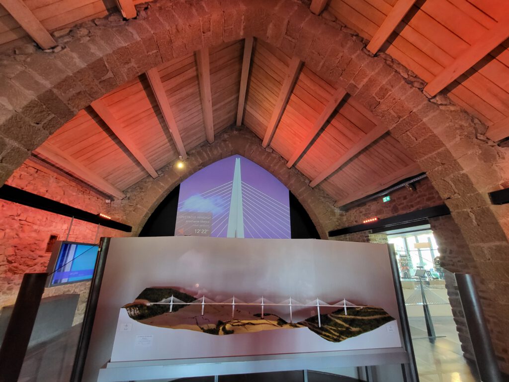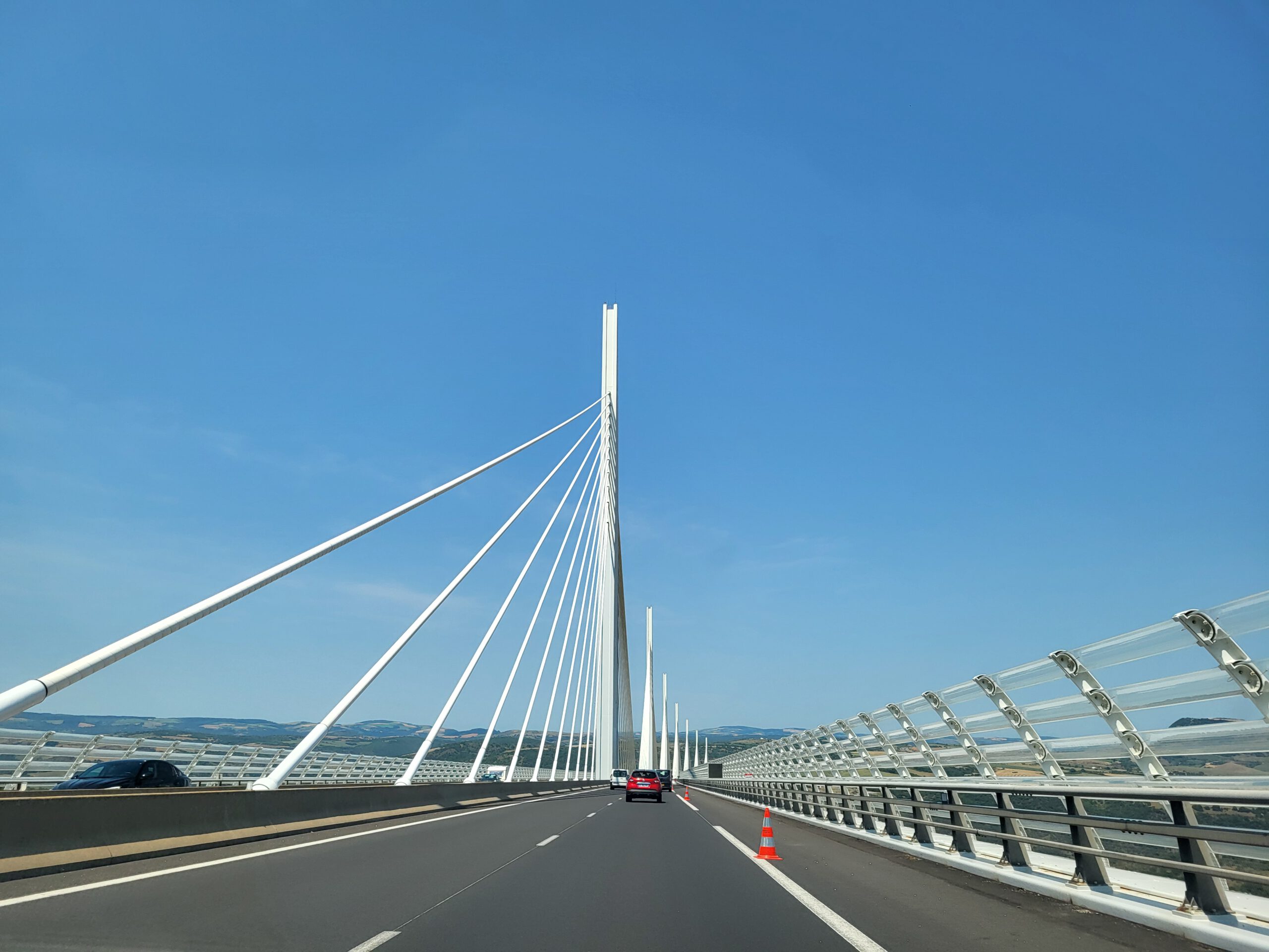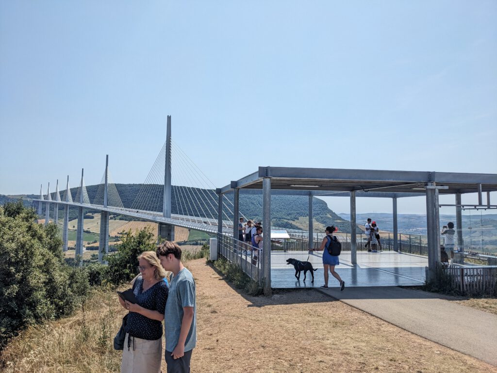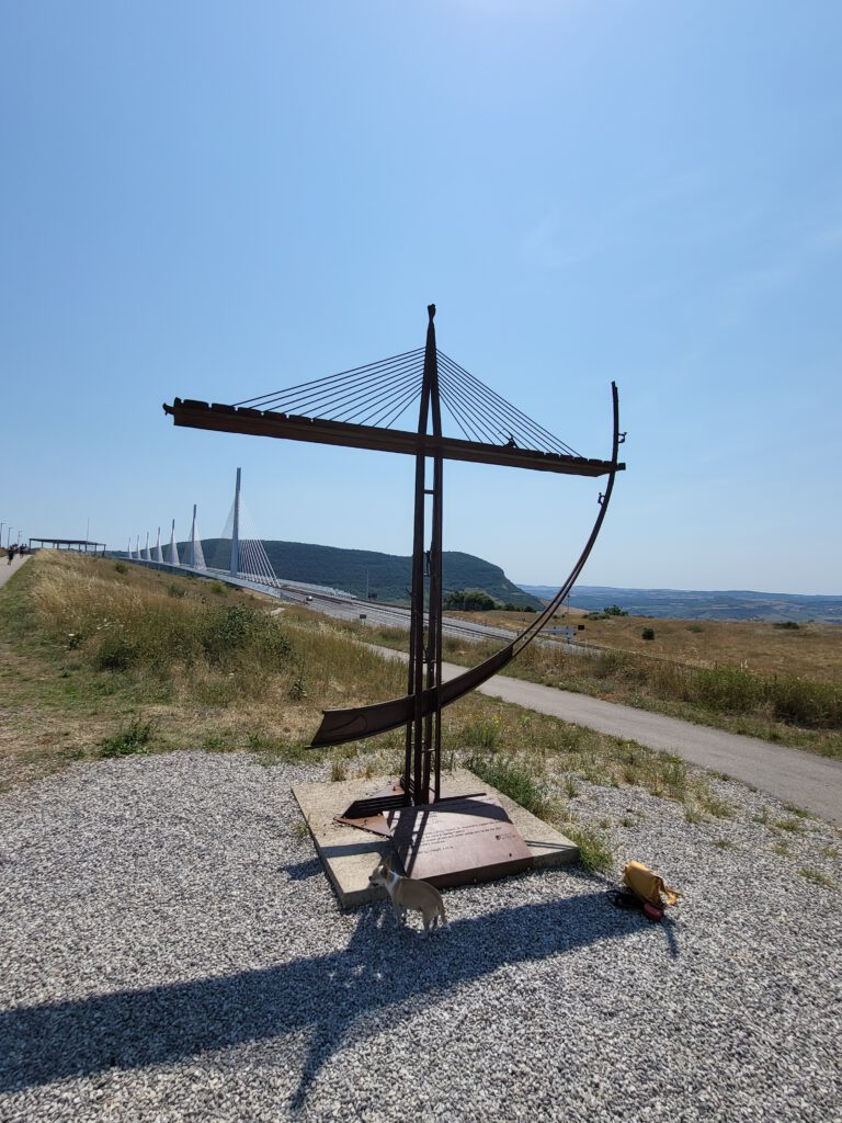 Gegen 14.30 Uhr eine längere Rast: Wir haben das beeindrucknde Viadukt von Millau gequert, die längste Schrägseilbrücke der Welt, höchstes Bauwerk Frankreichs, Gestaltung von Norman Foster, 2004 eröffnet (etc etc). Das wollen wir uns auch noch von der Aussichtsplattform ansehen. Die Hitze weht uns fast um, aber der Blick lohnt sich. Dazu gäbe es auch noch ein großes, schickes Info-Gebäude, das irgendwie nach EU-Fördermitteln aussieht. Immerhin gut investiert.