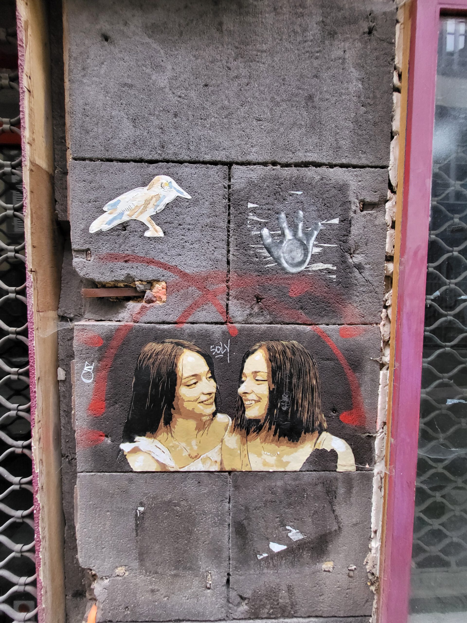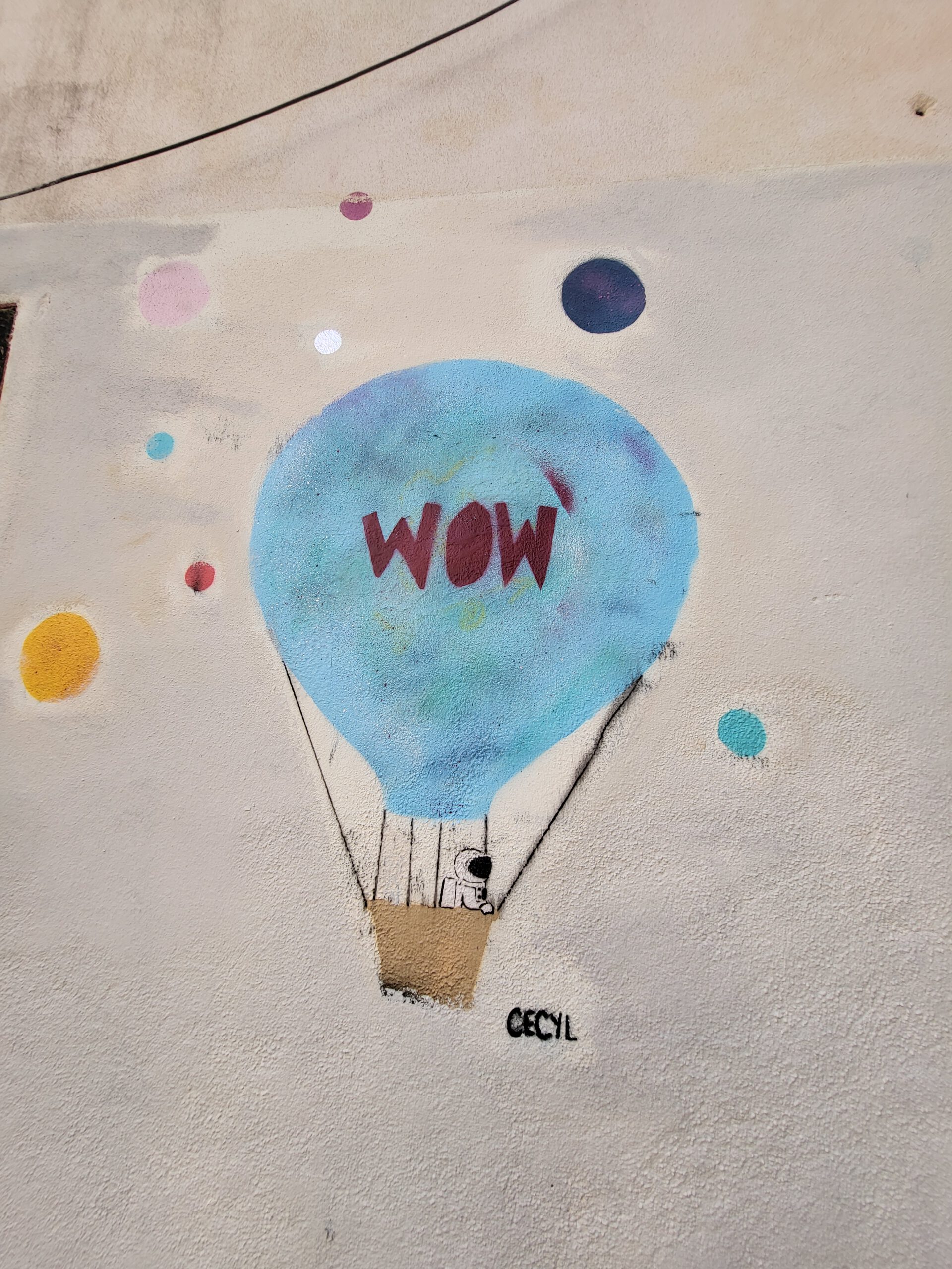 Auf den Wandertag folgt ein träger Vormittag. Doch irgendwann verlassen wir das Haus, weil im Kühlschrank zwar Dips und Frühstück, aber kein Mittagessen zu finden ist. Auf den Straßen weiter quasi keine Autos. Und während der Mittagshitze sind auch fast alle Rolläden unten und die meisten Cafés geschlossen. Die Reiseleitung kann ihr Glück hingegen kaum fassen: So viel Streetart auf Rollos, so viele Kacheln an Wänden, hach! Der Nachwuchs kann das alles natürlich wieder nicht würdigen, sondern will nur sitzen und essen. Okay, zu diesem Zeitpunkt hat es schon über 30 Grad ...