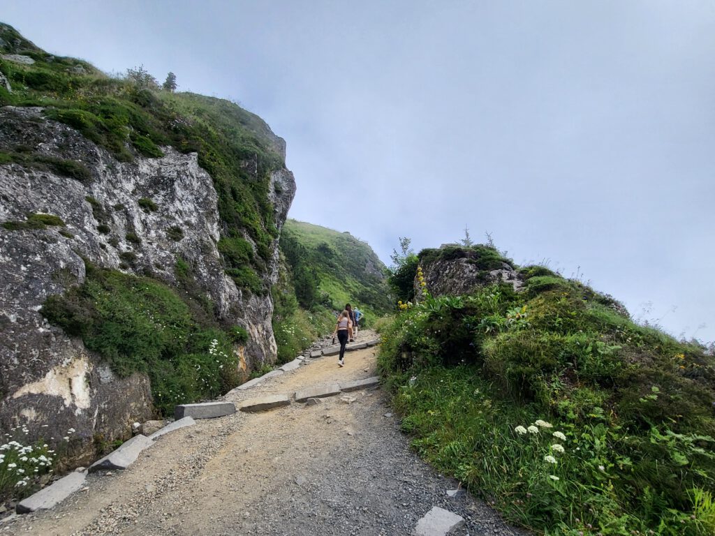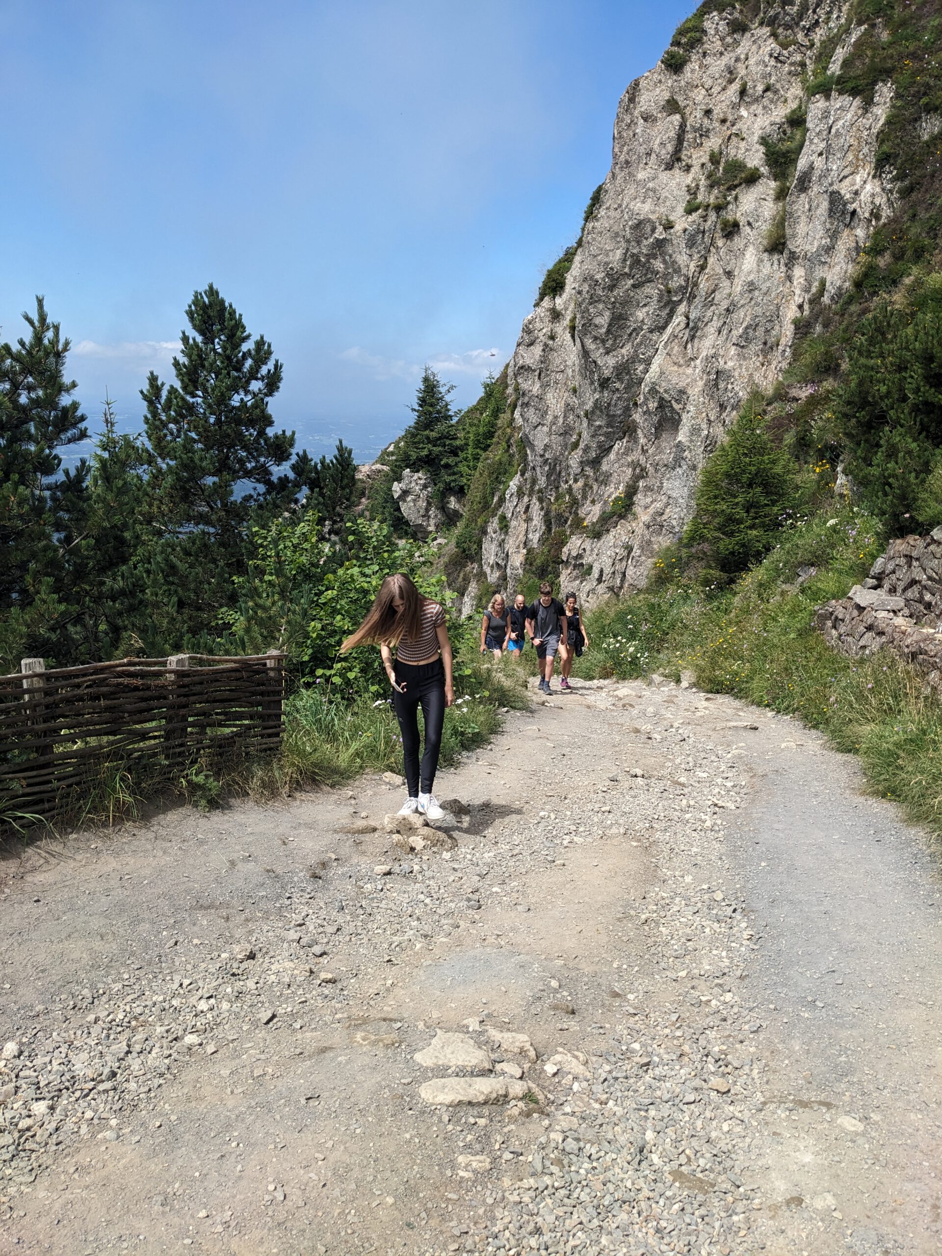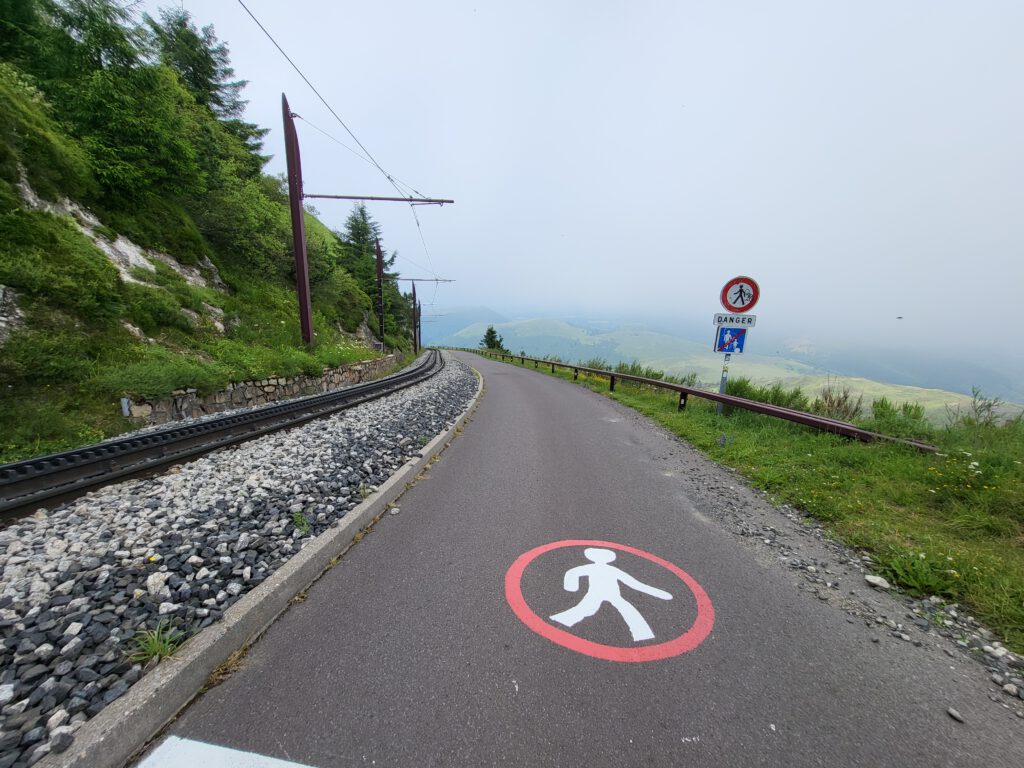 Noch Kaffee, Crepes und ein Diabolo (Sirupwasser) und wir machen uns auf den Rückweg. Zunächst an der Trasse der Zahnradbahn entlang, die man auch hätte nehmen können, wenn man sie hätte nehmen wollen. Doch dann ist der Weg auf einmal für Fußgänger gesperrt, es bleibt nur der steile Abstieg über den Weg der Ziegen. Was wäre grundsätzlich kein Problem, die Holzstufen sind bergab sehr komfortabel. Aber wir müssen ja zurück zu unserem Parkplatz.