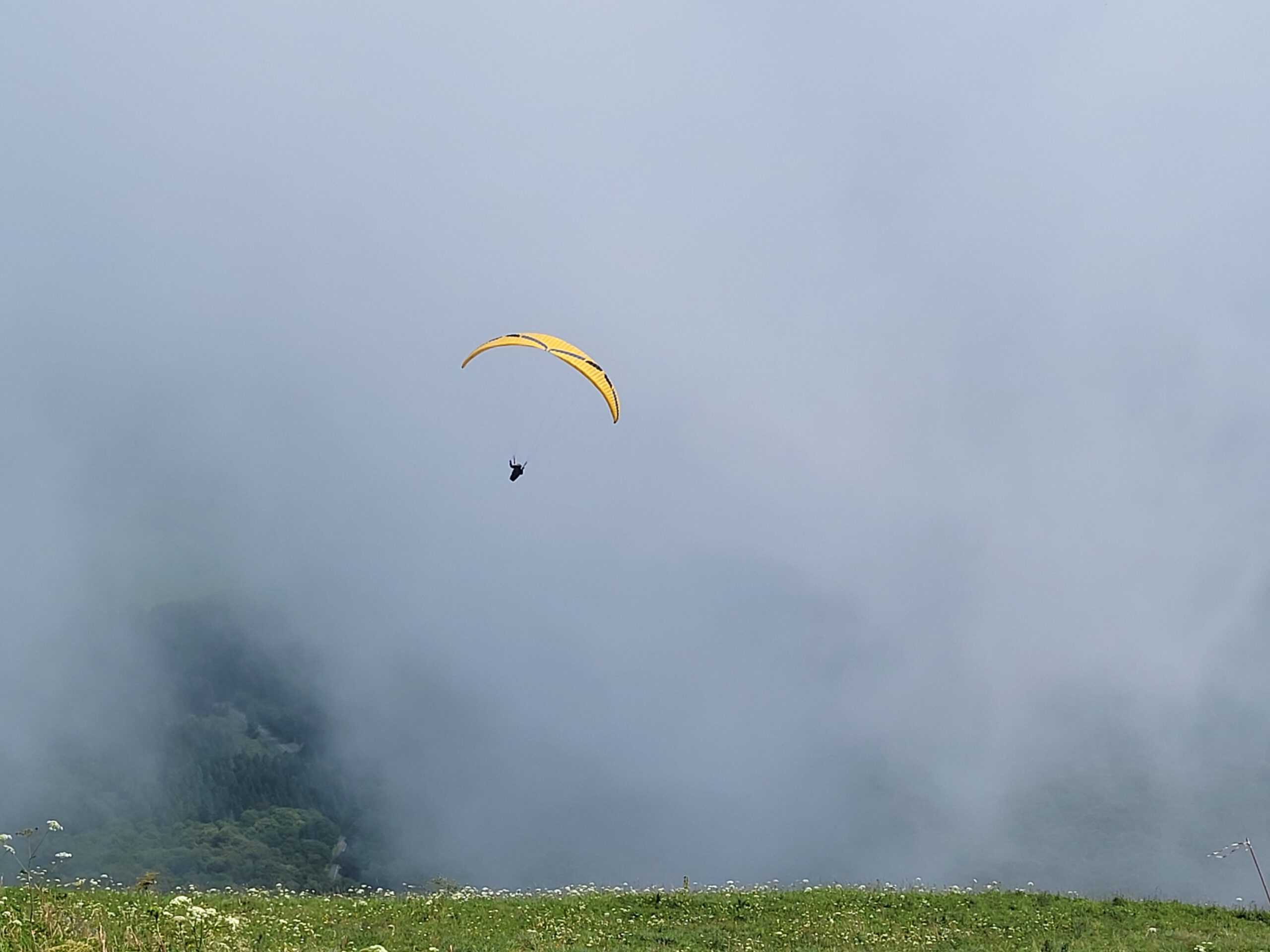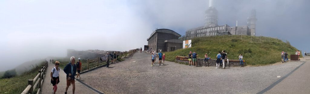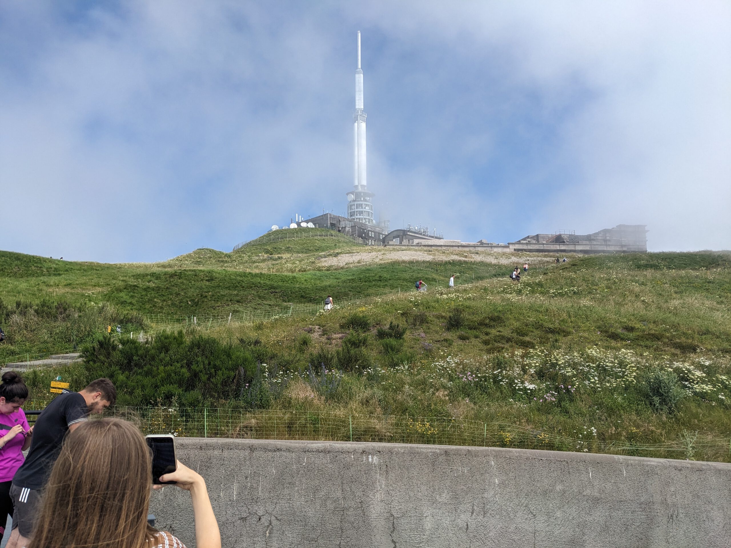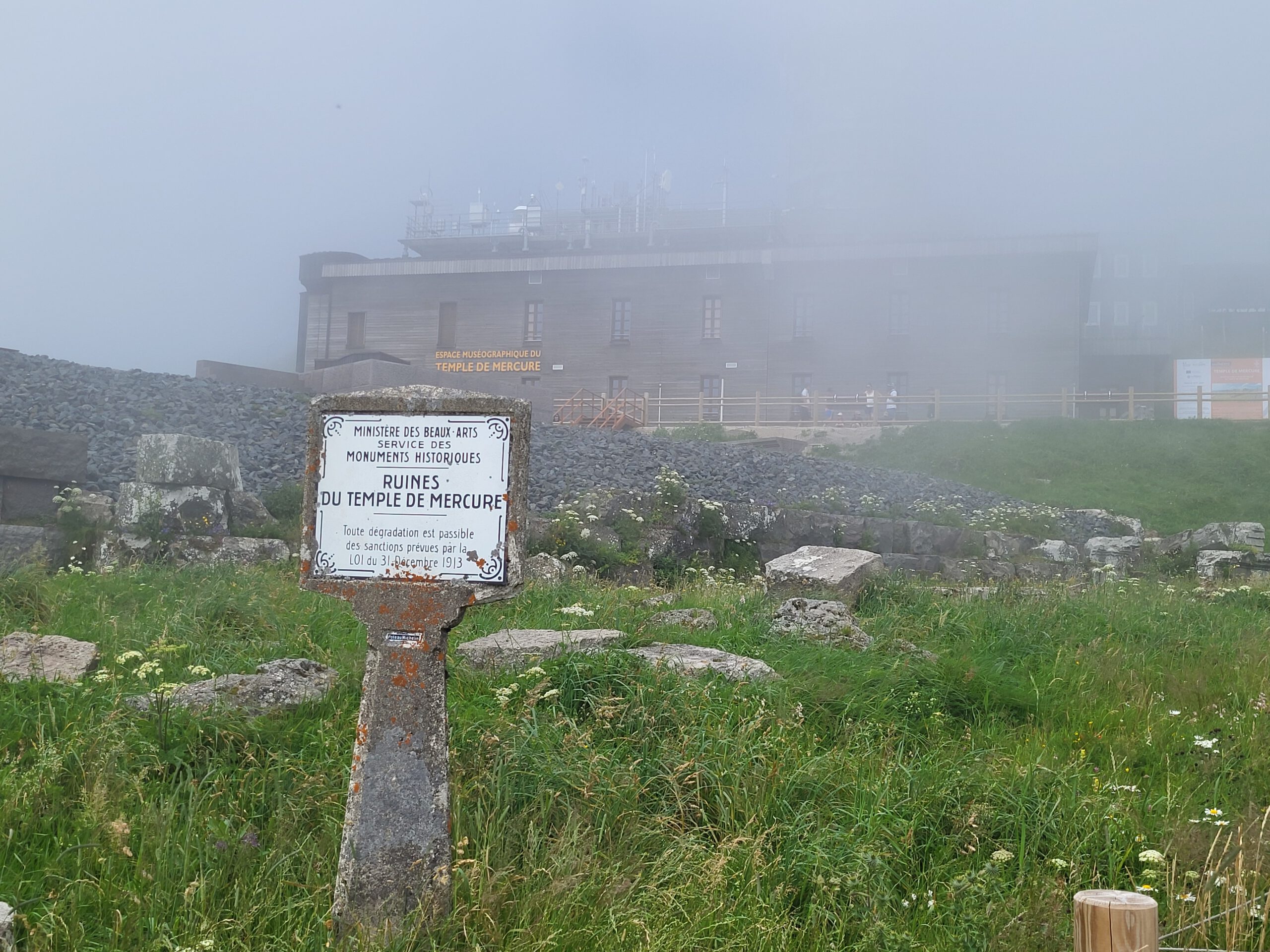 Die Mühen lohnen sich. Der 1465 Meter hohe Puy de Dome bietet eine sagenhafte Sicht auf die Kette der Puys, also eine ganze Reihe von Vulkanen. Die Sendeanlage für Ukw, Fernsehen, Radio, Mobilfunk ist seit einem Anschlag von 1978 nicht mehr frei zugänglich. Dafür gäbe es ein ausführliches kostenloses Museum zum Merkur-Tempel, dessen Reste man am Gipfel sieht. Aber unsere Hirnzellen sind dafür gerade nicht bereit. Also genießen wir die Aussicht, bewundern die Paraglider und lassen uns Zeit.