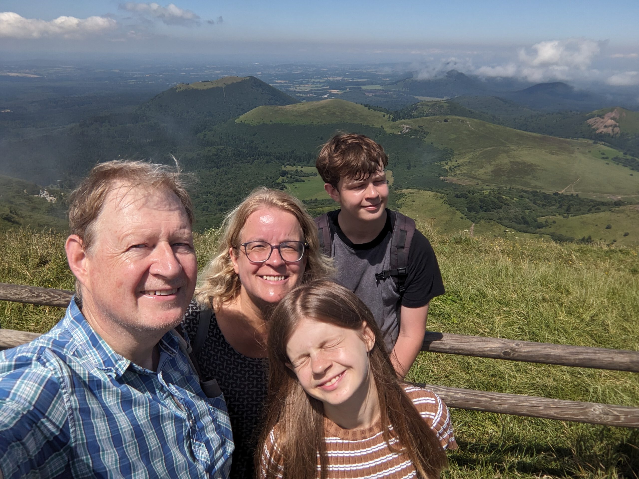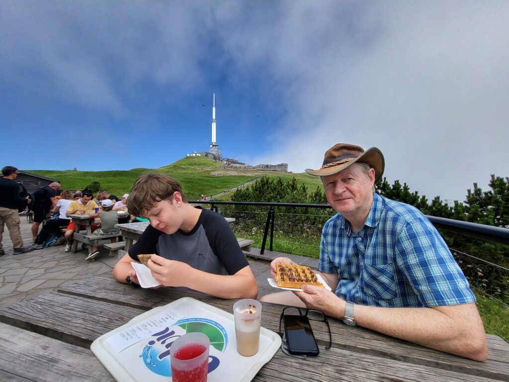 Die Nacht ist nicht so heiß, wie befürchtet, da wir alle Fenster weit offen stehen lassen. Ungünstig bloß, dass eine andere Familie wohl die Rückfahrt auf den sehr frühen Sonntagmorgen gelegt hat und unter heiteren Rufen mindestens 10 klirrende Kisten Wein einladen muss. Entsprechend zäh gestaltet sich das Aufstehen. Dabei hat diesmal Gerald die Hummeln im Hintern: Ein Grund, weshalb wir überhaupt im Zentralmassiv sind, ist der Vulkan Puy de Dome, den wir besteigen wollen. Der Blick auf den Wetterbericht sagt aber: Das geht ausschließlich am Sonntag, danach wird es zu warm...