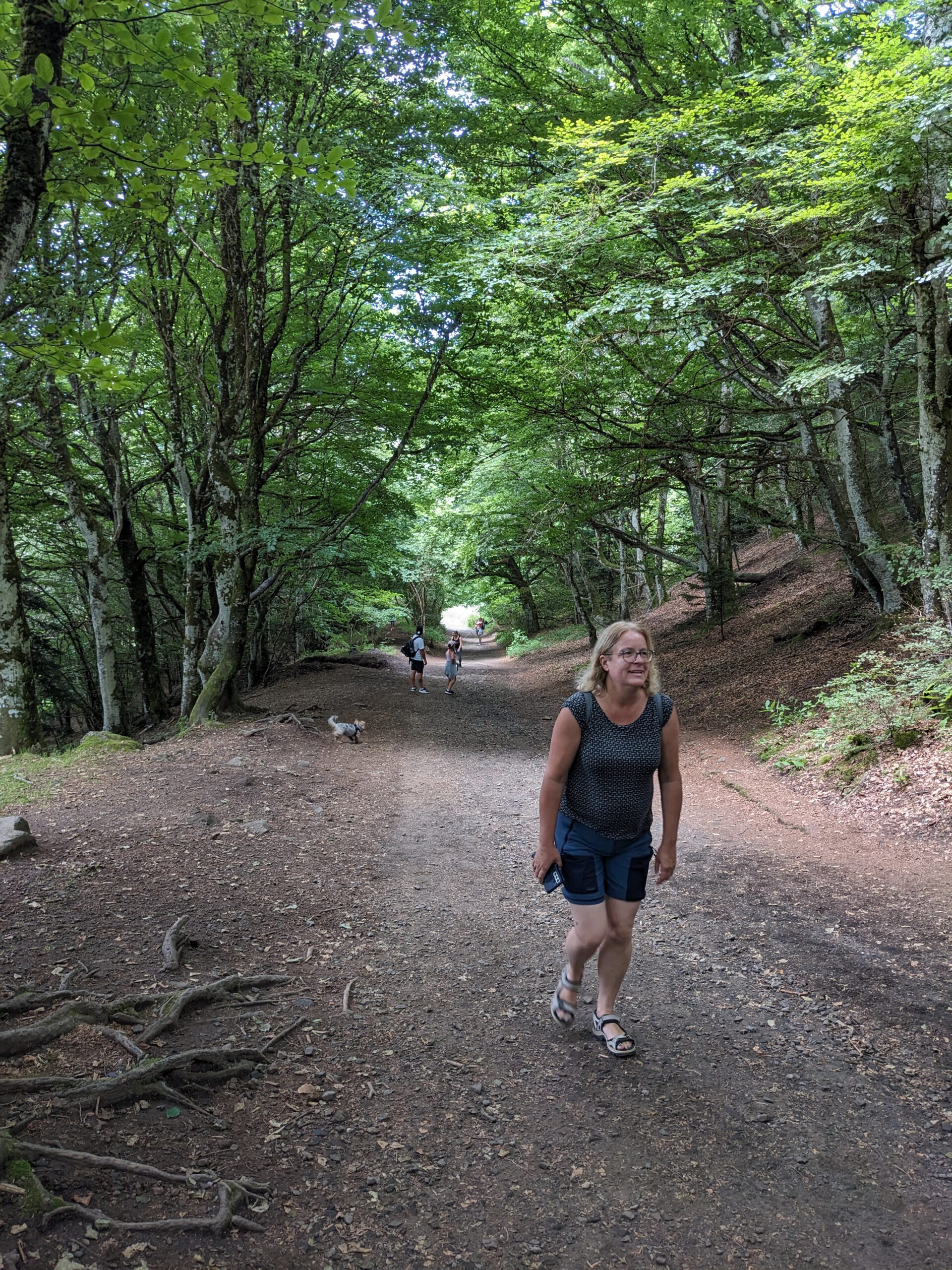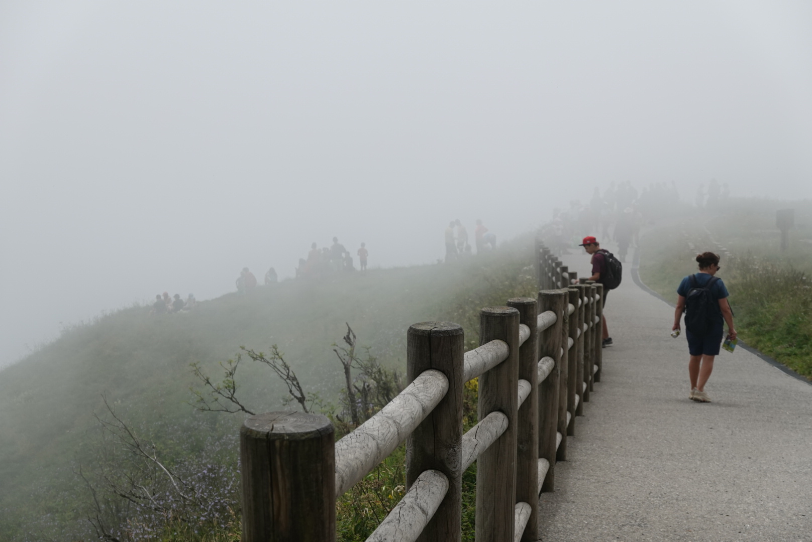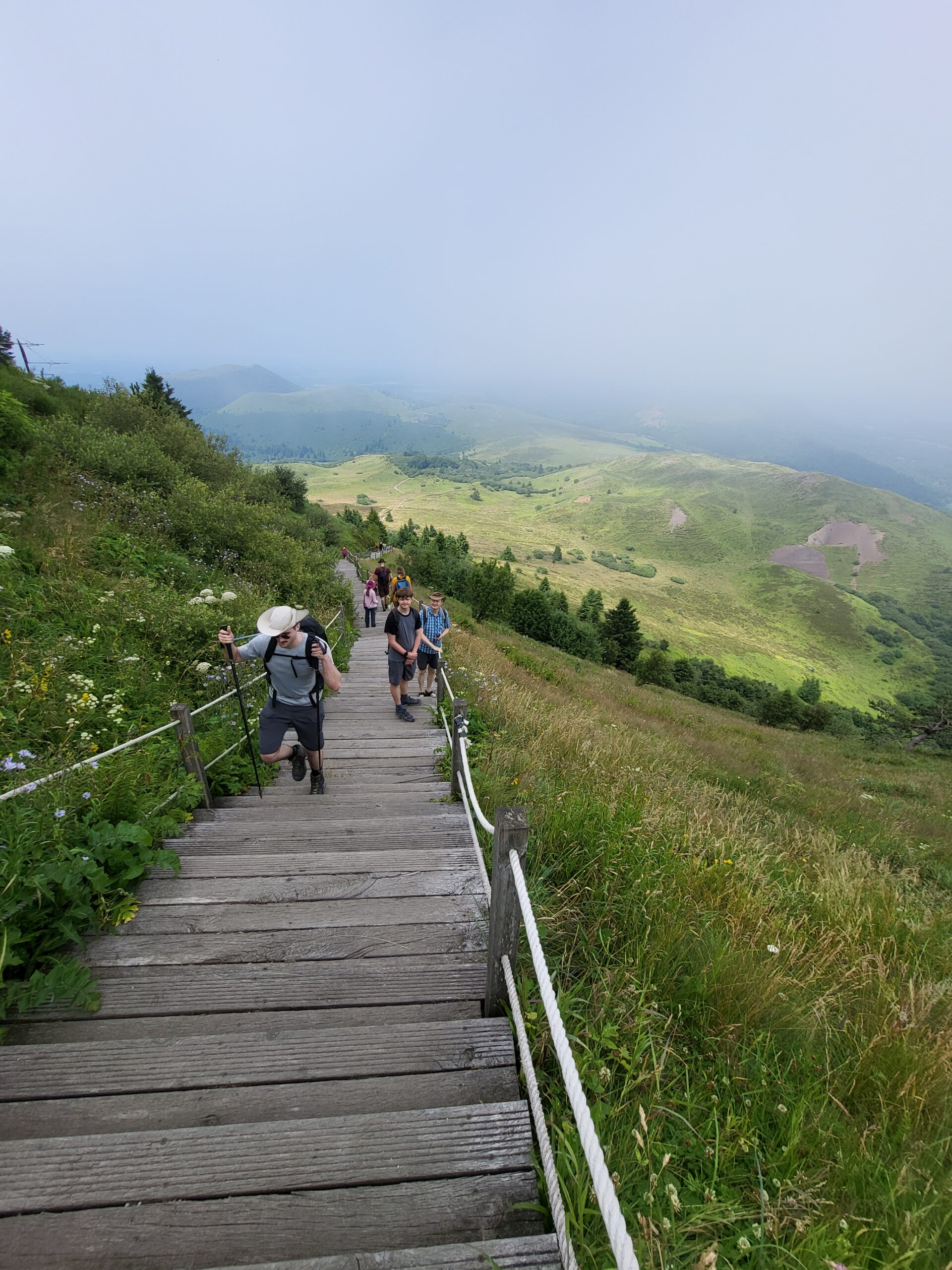 Gegen 11.40 Uhr kommen wir los, der Vulkan hat noch eine dicke Nebelmütze auf. Drei im Auto sind sehr skeptisch - und wenn es so bewölkt bleibt? Will da überhaupt irgendjemand hoch? Nun ja. Die Reiseleitung hatte (unvorsichtigerweise) den Weg der Maultiere ausgewählt, wir wollen in der Mitte am Col de Ceyssat einsteigen. "Familienfreundlich" stand da auf der Website. "45 Minuten, einfacher Weg". Selten so gelacht ... Wir brauchen etwas 1 Stunde 15 Minuten und die sind richtig hart, denn der Weg geht ziemlich steil nach oben. Nach dem Infekt der vergangenen Woche muss es die Reiseleitung ganz langsam angehen, mit vielen Trink- und Studentenfutterstopps. Am Anfang sieht man noch viele Menschen bergauf-bergab rennen. Aber, tröstlich, früher oder später müssen alle nicht-Extrem-Sportler verschwitzt pausieren. Denn natürlich spitzt inzwischen die Sonne durch.