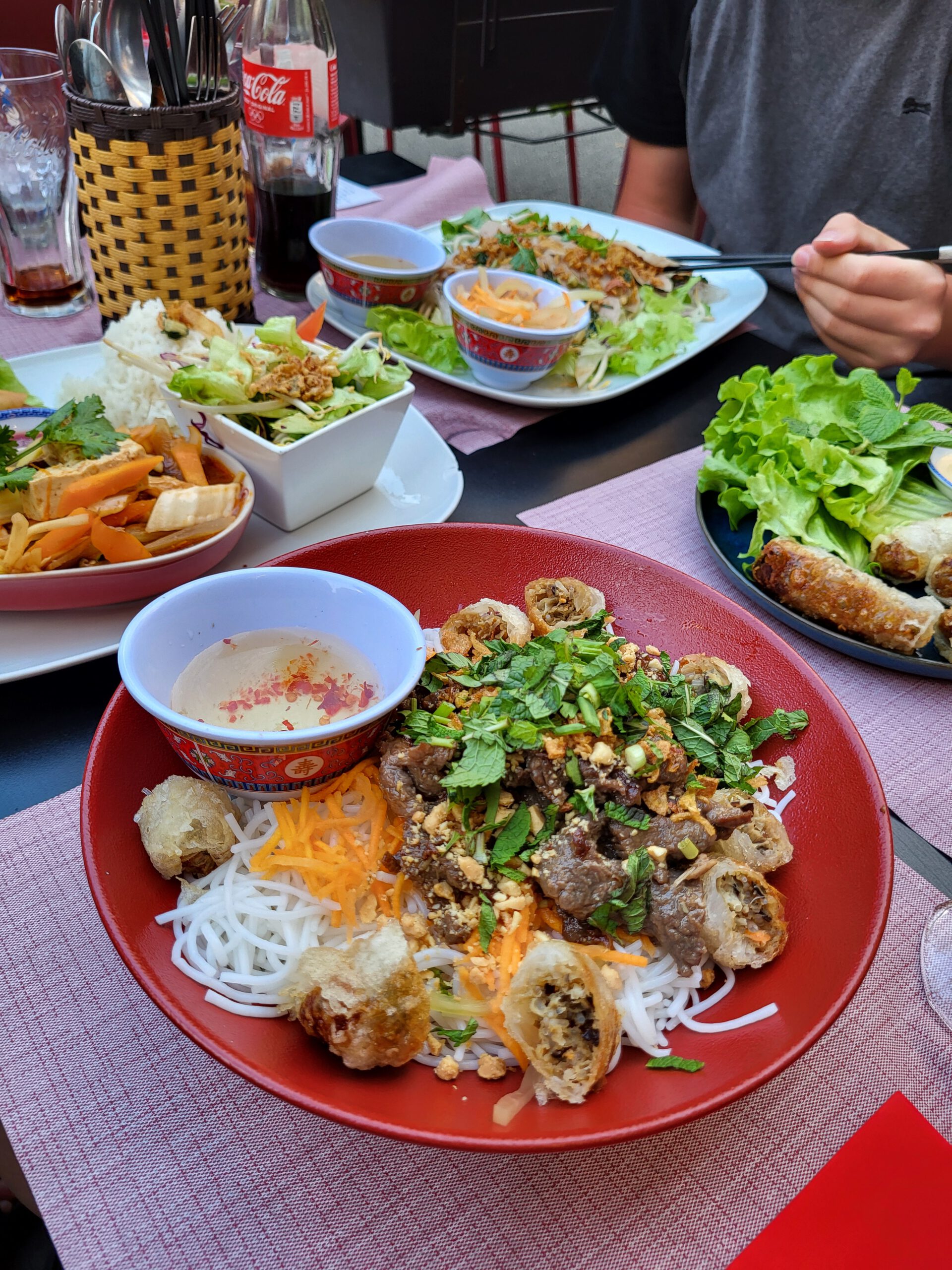 Nach gut vier Stunden sind wir wieder am Auto, drei von vier mit einem leichten Rotstich. Wir fahren nach Hause, kleiner Stopp am Supermarkt, Siesta. Am Abend kehren wir in der Innenstand bei Vietnamesen ein. Es zeigt sich Mal wieder, dass Kilian und Nicole diese Geschmacksrichtung lieben, aber Gerald und Louisa besser zum Döner gegangen wären. Nach dem trubeligen Samstag ist die Altstadt heute ziemlich leer. Aber wir wollen alle sowieso nach Hause - was für ein schöner, anstrengender Wandertag.