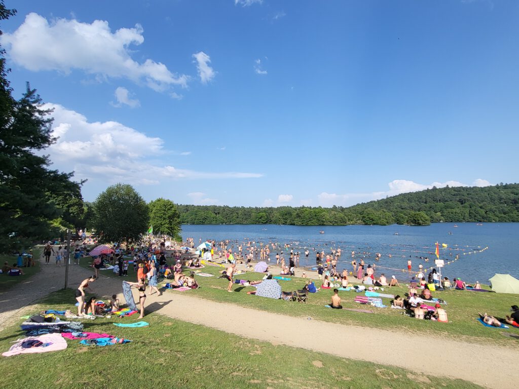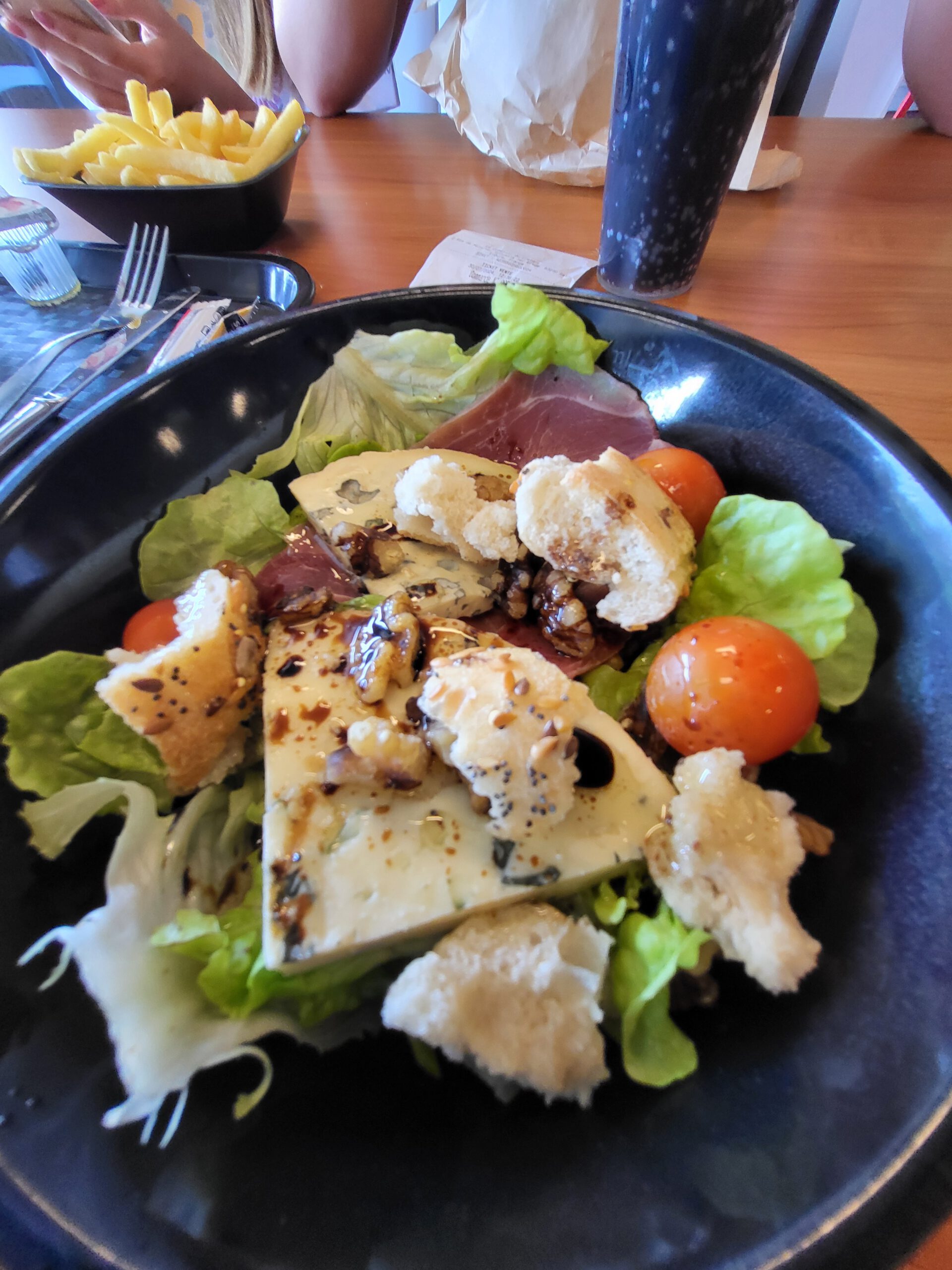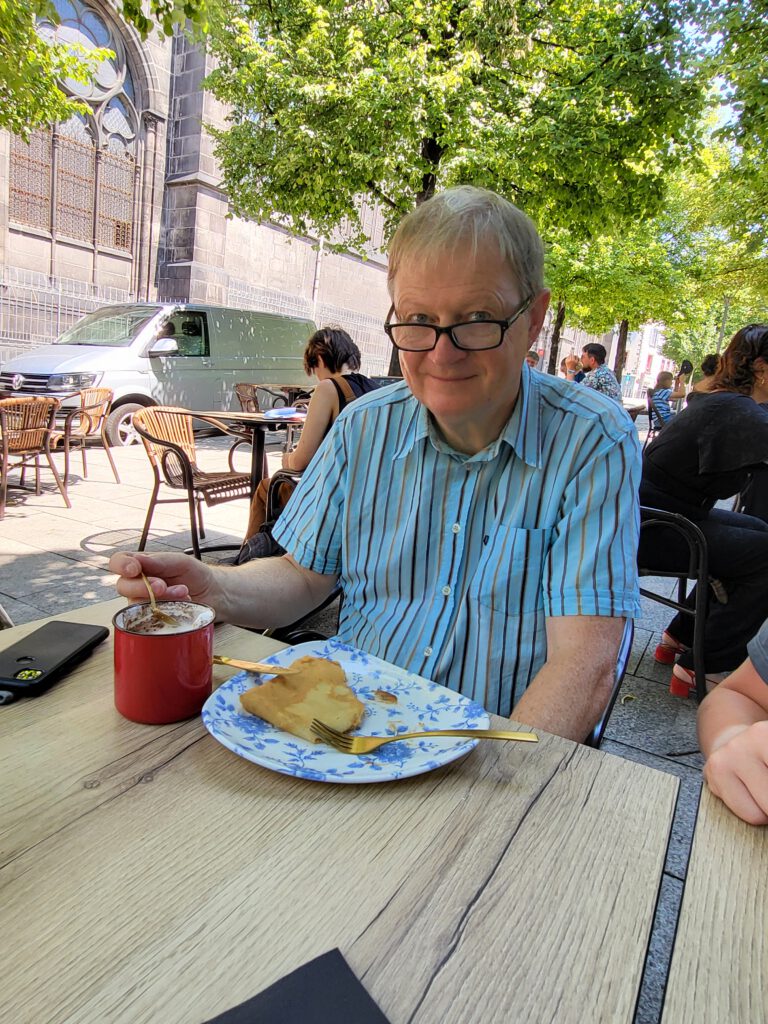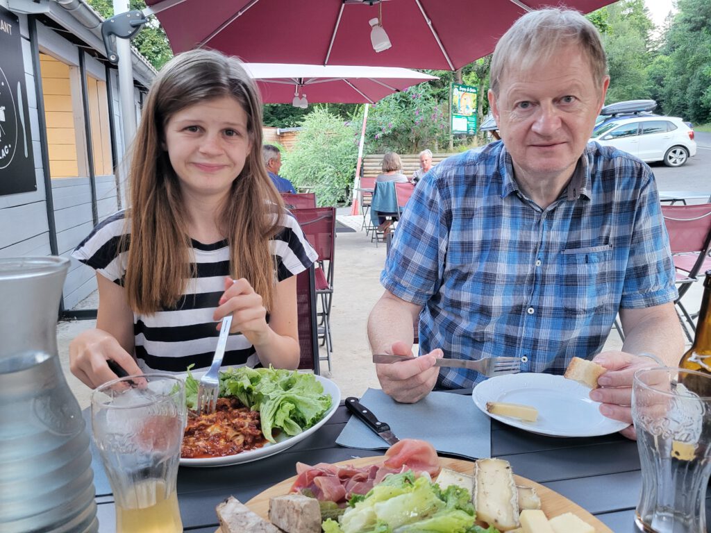 Wir zuckeln 25 Minuten zum Lac d'Aydat, der mitten im Grünen liegt. Goldene Entscheidung. Es hat unter 30 Grad! Der Badestrand ist überfüllt, aber wir machen uns spontan auf die gut sechs Kilometer lange Seeumrundung. Eine leichte Brise weht uns um die Nase und es fühlt sich einfach nur gut an. Endlich wieder durchatmen. Gegen 20 Uhr kehren wir an der Bar des Campingplatzes auf drei gekühlte Sirup ein, gegen 21 Uhr sitzen wir in einer Pizzeria, die beste Kritiken hat. Bei 27 Grad und leichtem Wind. Traum. Der Koch hat frei, es gibt genau zwei Menu: Lasagne mit Salat oder eine gemischte Platte, dazu Pommes, Kaffee, Eis. Ein Herz erwärmender Gastwirt. Und nach dem wir am Nachmittag noch überlegt hatten, schnellstmöglich nach Speyer zu entkommen, wurde es damit doch noch ein wunderschöner Tag.