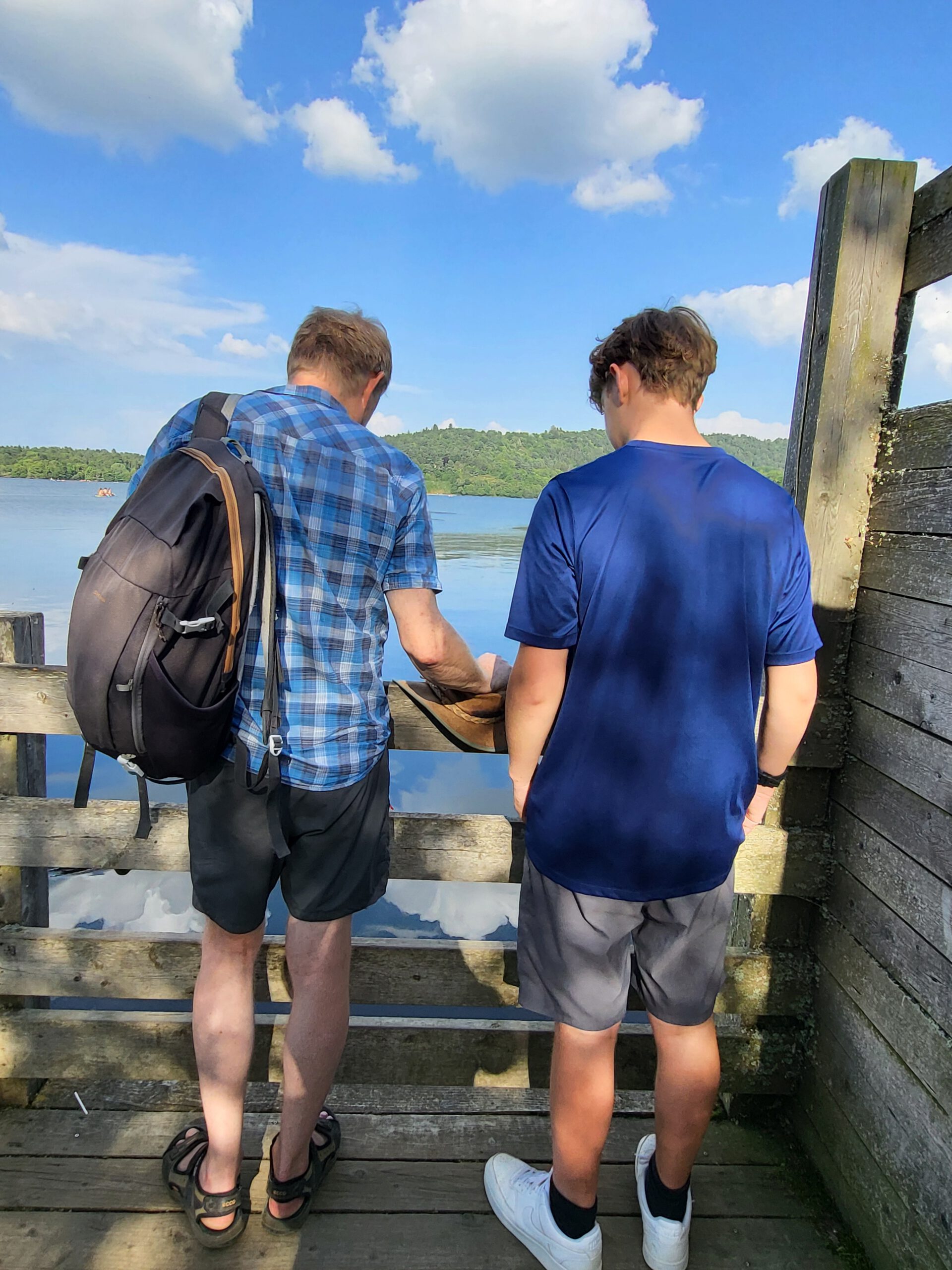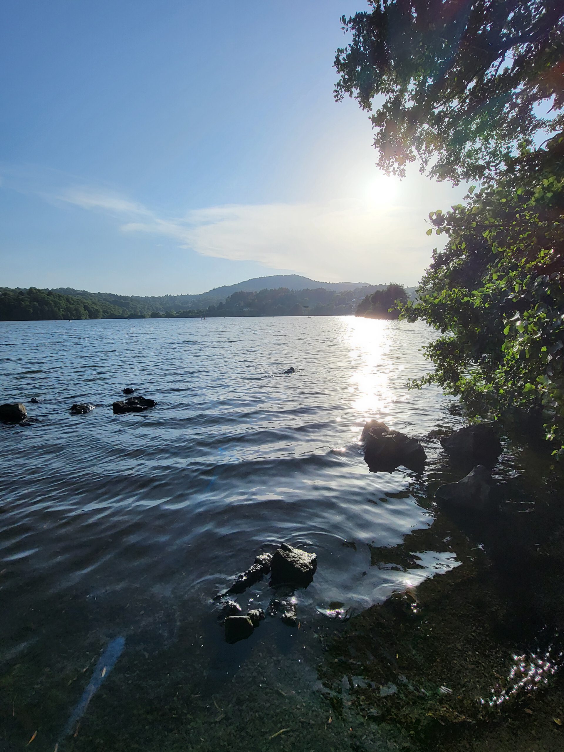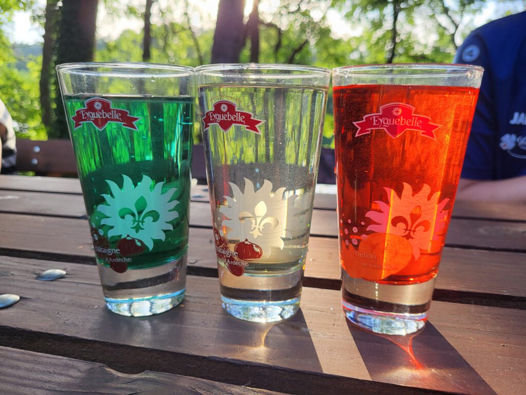 Wir zuckeln 25 Minuten zum Lac d'Aydat, der mitten im Grünen liegt. Goldene Entscheidung. Es hat unter 30 Grad! Der Badestrand ist überfüllt, aber wir machen uns spontan auf die gut sechs Kilometer lange Seeumrundung. Eine leichte Brise weht uns um die Nase und es fühlt sich einfach nur gut an. Endlich wieder durchatmen. Gegen 20 Uhr kehren wir an der Bar des Campingplatzes auf drei gekühlte Sirup ein, gegen 21 Uhr sitzen wir in einer Pizzeria, die beste Kritiken hat. Bei 27 Grad und leichtem Wind. Traum. Der Koch hat frei, es gibt genau zwei Menu: Lasagne mit Salat oder eine gemischte Platte, dazu Pommes, Kaffee, Eis. Ein Herz erwärmender Gastwirt. Und nach dem wir am Nachmittag noch überlegt hatten, schnellstmöglich nach Speyer zu entkommen, wurde es damit doch noch ein wunderschöner Tag.