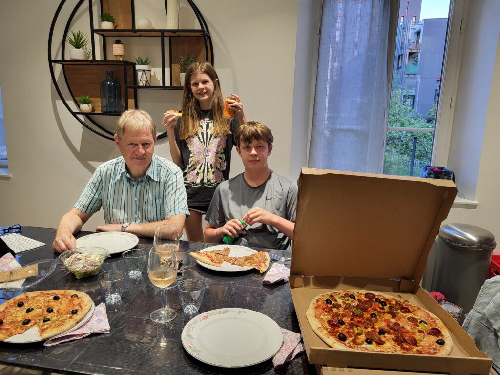 Abendessen ist diesmal Pizza vom Schnelldienst um die Ecke, die wir natürlich selbst abholen. Ab 23 Uhr wird es etwas kühler und wir können lüften.