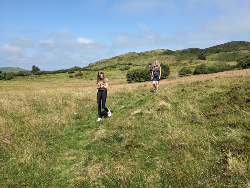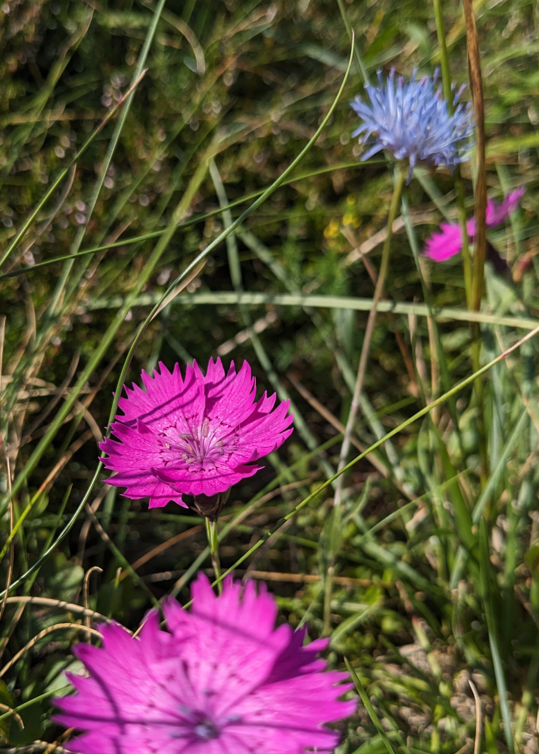 Also findet Gerald irgendwann wieder einen Weg, der ...nicht ganz so oft begangen wird. Die Familie kennt diese Sondertouren inzwischen und ist froh, dass die Sonne spät untergeht und man nicht stranden wird, wie schon einmal fast im Pfälzer Wald. Genug gespottet, der gesamte Weg ist wunderschön, viele Blumen am Wegesrand. Nur die Ziegen, die alles vollgeköttelt haben, sind nicht zu sehen.