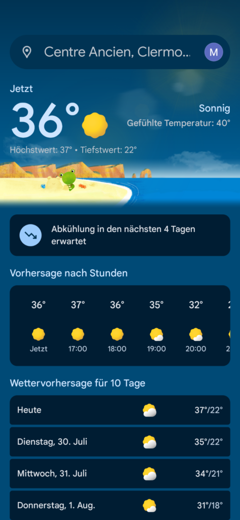 Morgen geht es ins Zentralmassiv. Kein Pool, kein Meer, keine Klimaanlage, aber weiter über 30 Grad. Wir sind etwas skeptisch.