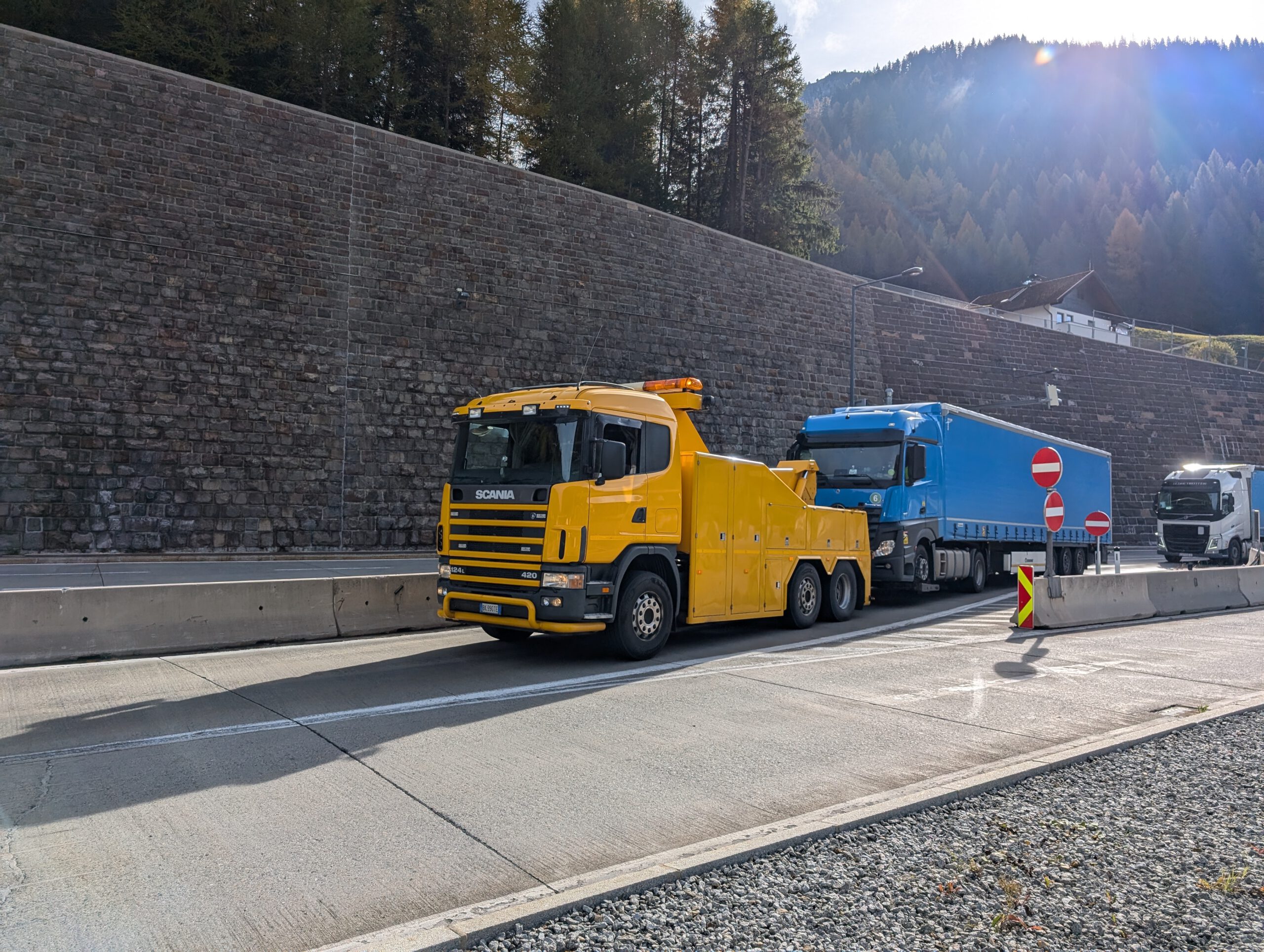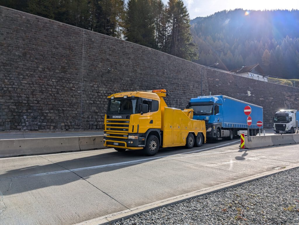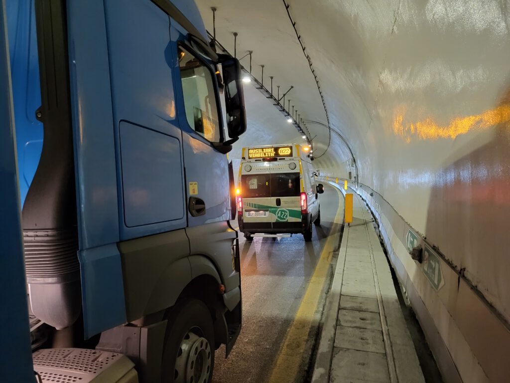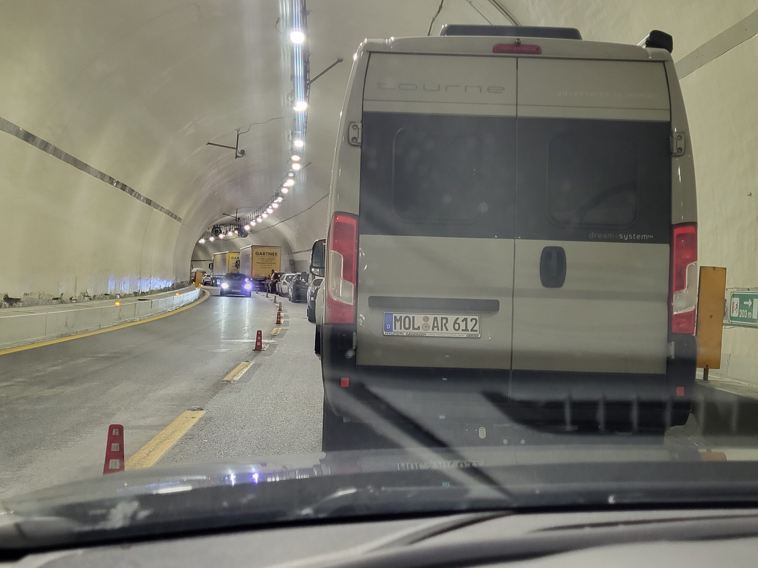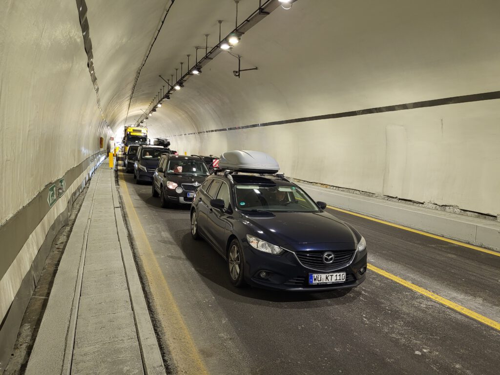 Aber so weit kommen wir gar nicht: Gleich im ersten Brennertunnel ist Stillstand. Ab 9.20 Uhr geht nichts mehr. Der Verkehr auf der Gegenfahrbahn rollt hingegen. Hm. Dass alle etwas müde sind und es im Tunnel kein Internet gibt, hilft der allgemeinen Laune nur bedingt. Nach etwa einer Stunde laufen die ersten auf dem Notweg, um zu schauen, was da so blinkt. Nicole ist natürlich dabei. Der Grund für den großen Stau ist sehr profan: Bei einem Lastwagen blockieren die Bremsen. Und vor dem Lastwagen steht inzwischen ein kleines Infoauto, das eben blinkend informiert, dass es ein Problem gibt.