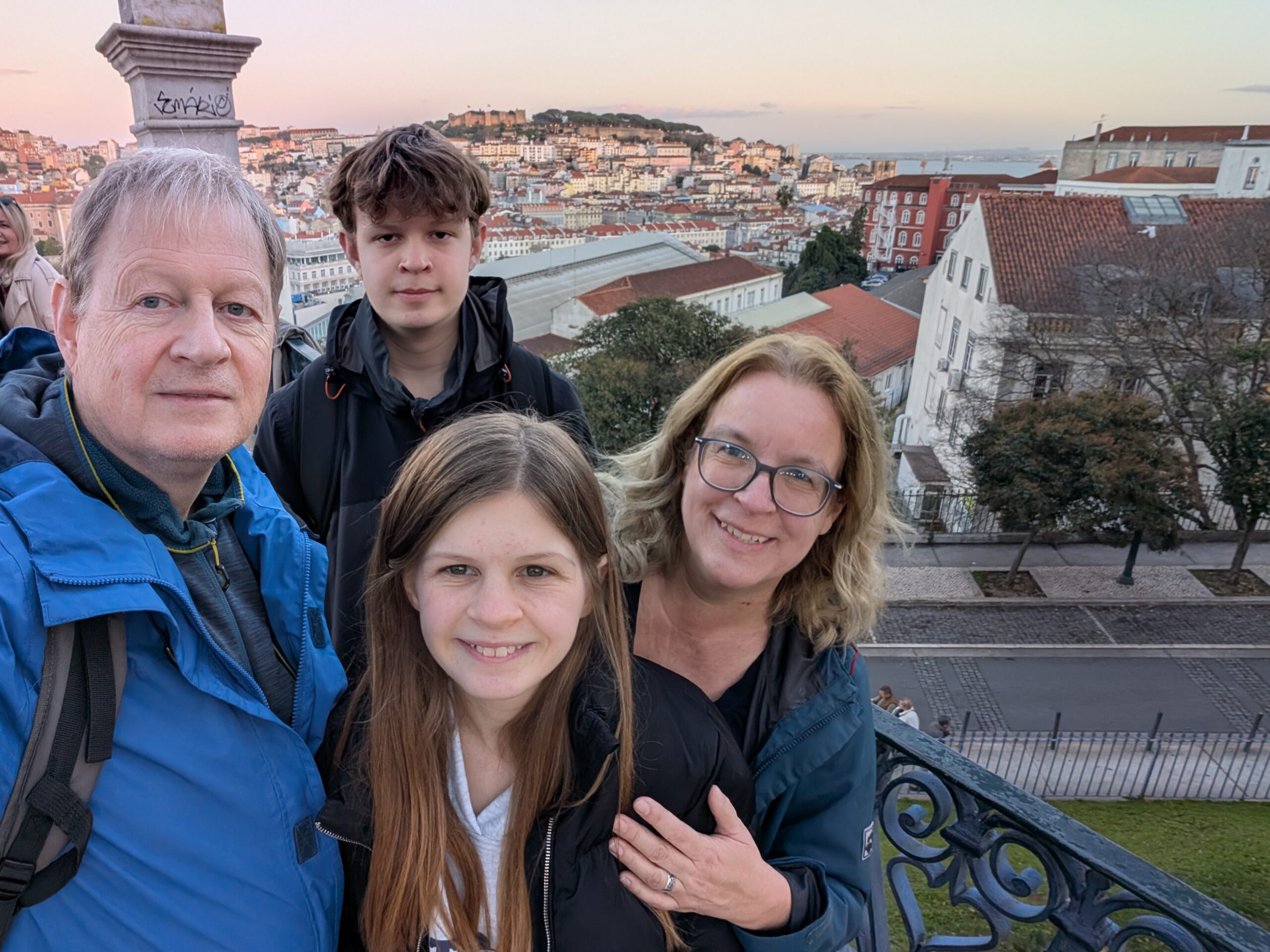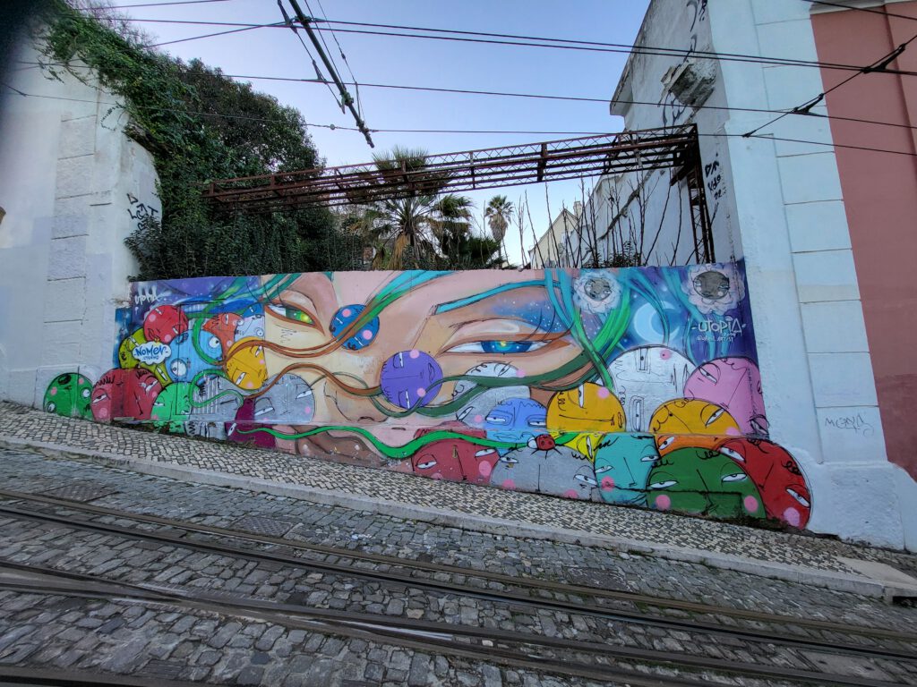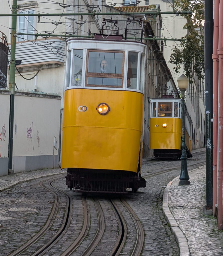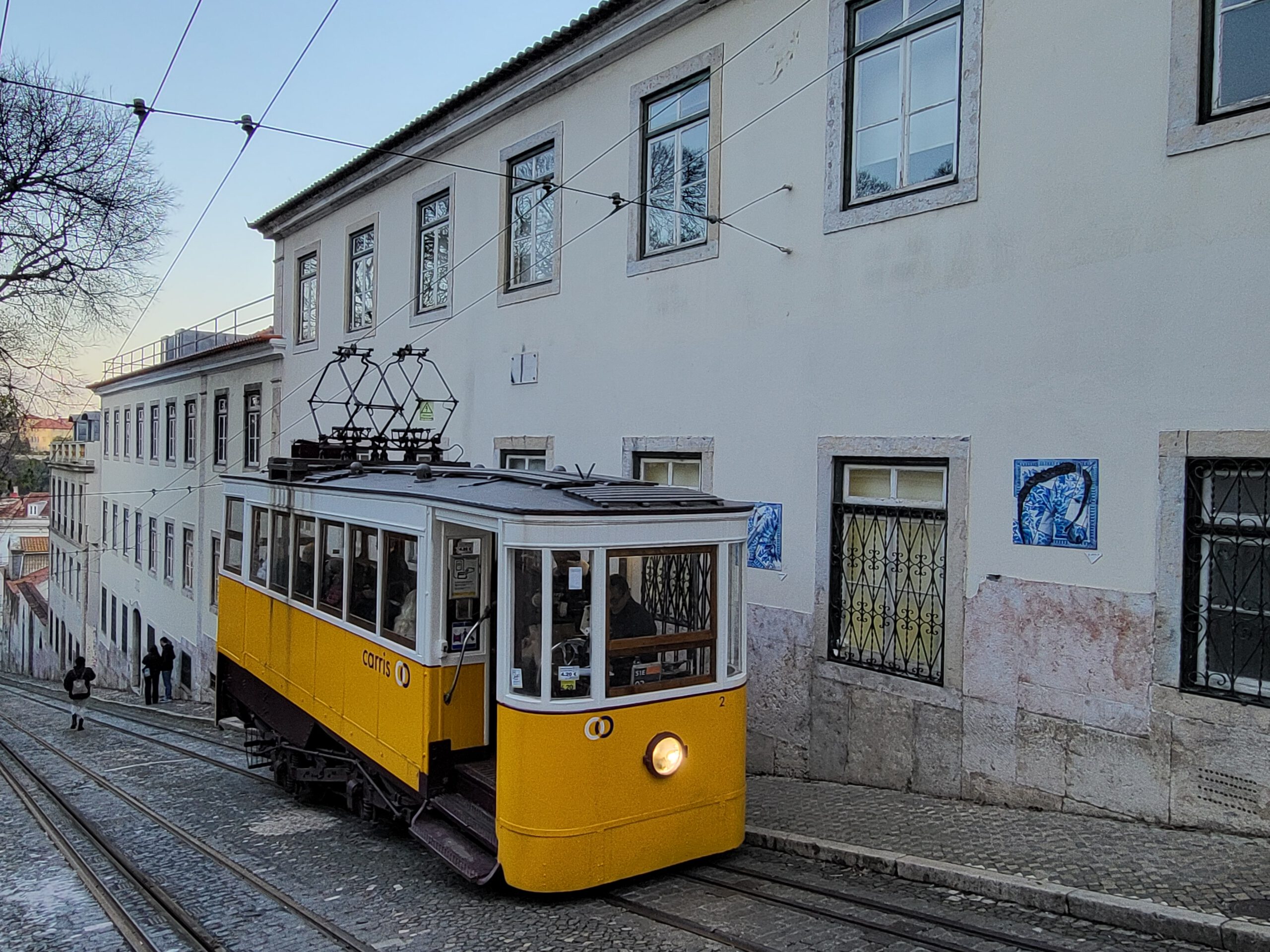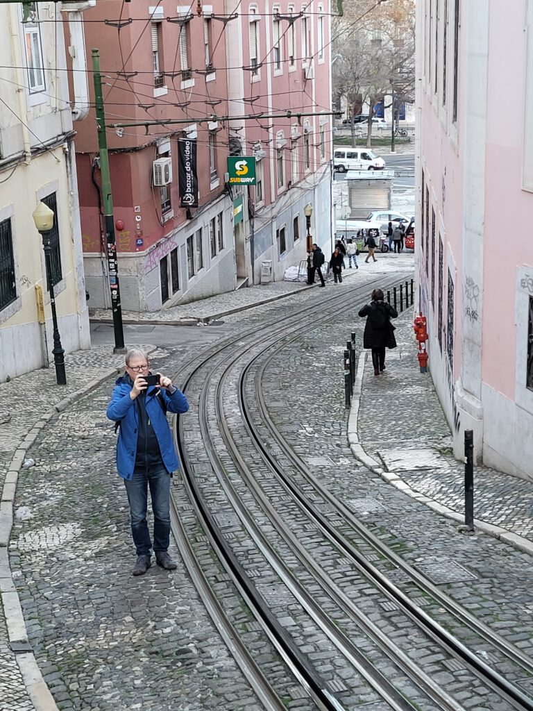 Mit der Metro geht es in die Innenstadt, nochmal Abendlicht auf einem Miradouro sehen. Wir könnten ein Bähnchen nehmen, doch da es überfüllt ist, laufen wir diesmal auf den Gleisen hoch. Haben wir uns nicht erst vor einer Woche noch über die Menschen gewundert, die das machen...?