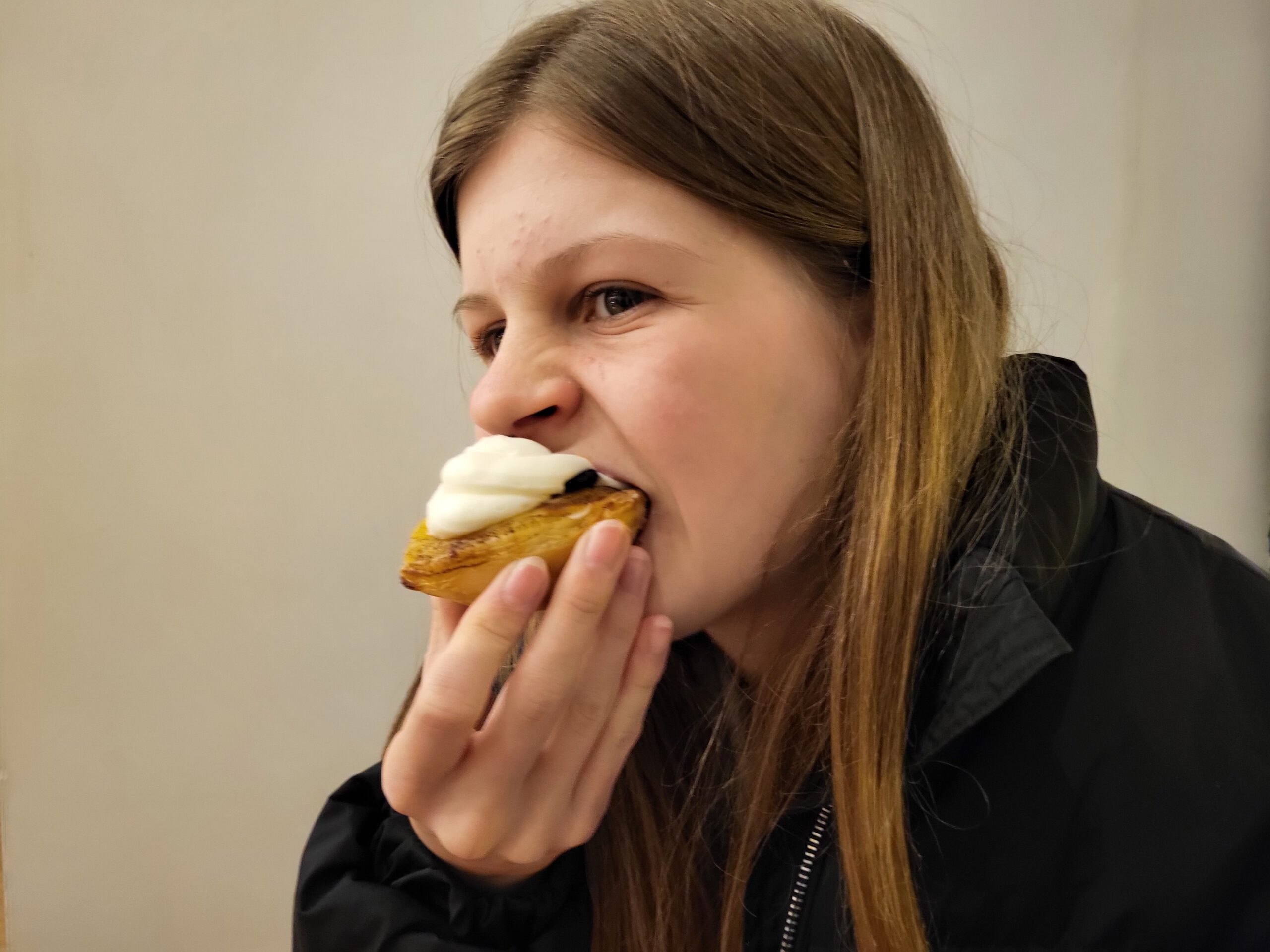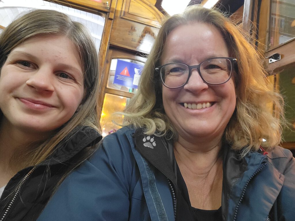 Gerald und Kilian suchen sich eine Straßenbahn und zuckeln zur Ferienwohnung. Nicole und Louisa wollen noch ein paar Souvenirs erjagen. Dabei bekommen sie mit der LED-Show eines großen Kaufhauses noch einmal feinsten Christmas-Kitsch ab, von dem sie sich im Café Nat'elier erholen - mit Vanilleteilchen, natürlich. Danach geht es an einen kleinen Geschenkekauf und die Suche nach der Straßenbahn beginnt. Also nach der richtigen Straße für die richtige Straßenbahn ... Die beiden machen noch einmal beträchtlich Strecke, bis sie um 19.45 in der Bahn sitzen. Ein Obdachloser darf nach einem Gespräch mit dem Fahrer kostenlos mitfahren. Ein weiterer, schon etwas Betagterer, hält sich tatsächlich an der hinteren Tür fest und surft so mit.