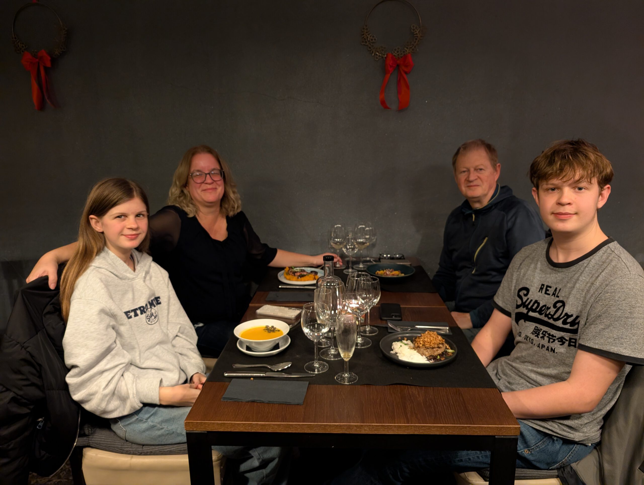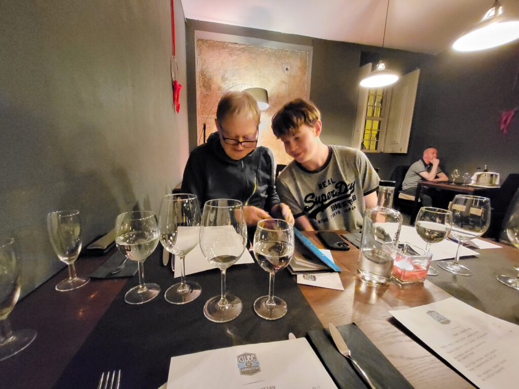 Und dann geht es, nach einer Woche, endlich in das Restaurant gegenüber: Den Club der Journalisten! Den gibt es hier seit 1983, auch wenn inzwischen der Restaurantanteil überwiegt. Kaum sind wir in der Tür, bekommen wir ein Glas Sekt in die Hand gedrückt. Kilian und Louisa werden angesichts der vielen Lagen Besteck und Gläser ganz andächtig. Und es schḿeckt fantastisch, egal ob die geschmorte Aubergine und der Spargel als Vorspeise, oder der schwarze Reis mit Ente, der Oktopus oder der Lammburger als Hauptspeise - und das Dessert ist natürlich auch fein. Ein sehr schöner Abschluss.