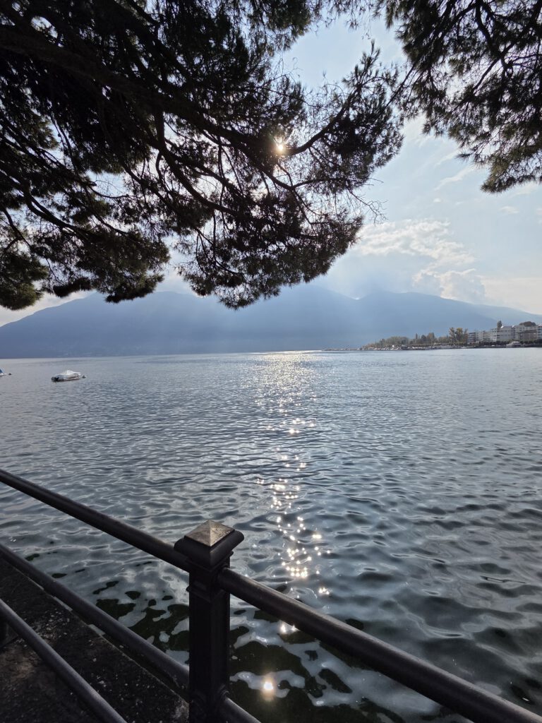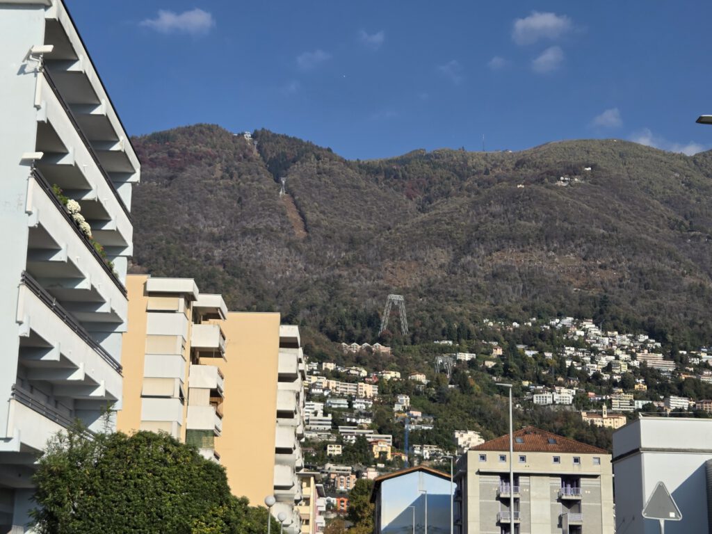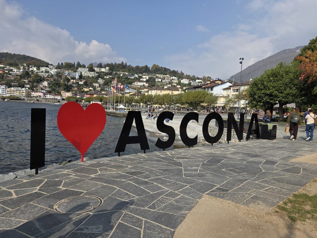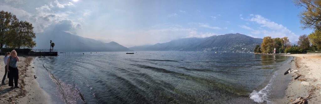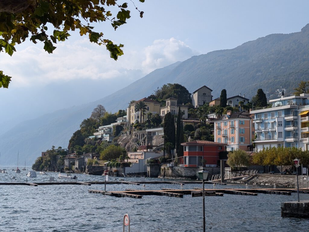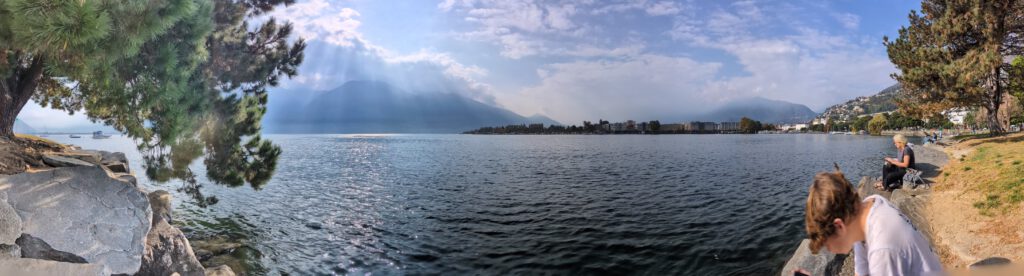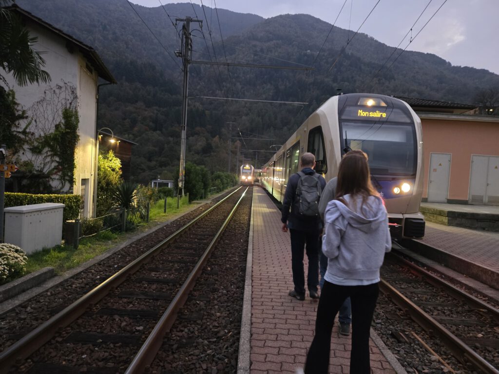 Wir fahren eine S-Bahn früher nach Mannheim und decken uns noch mit (schlechtem) Kaffee und Backwaren ein. Danach geht es erstaunlich (fast) pünktlich mit dem ICE nach Basel, von dort aus nochmal 4,5 Stunden in einem ziemlich leeren IR nach Locarno. Der Zug ist fast leer, der kleine Kaffeeautomat kann Leckeres zaubern und die Sicht ist natürlich grandios. Nach siebeneinhalb Stunden sind wir trotzdem froh angekommen zu sein. Im ICE wurden wir übrigens gar nicht kontrolliert, in der Schweiz hingegen gleich dreimal, mal mit einem fröhlichen Gruezi Miteinand, mal mit einem Buona Sera.