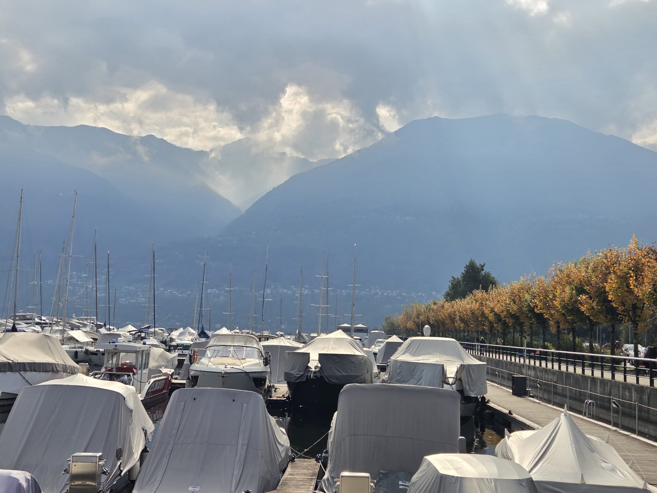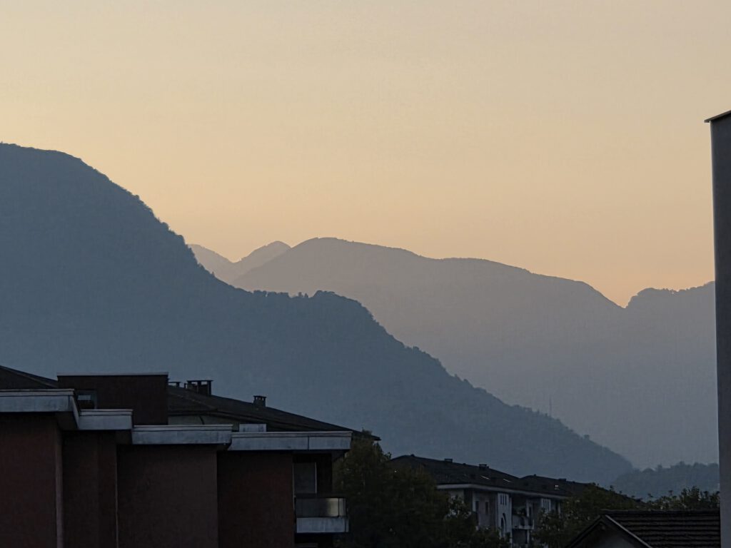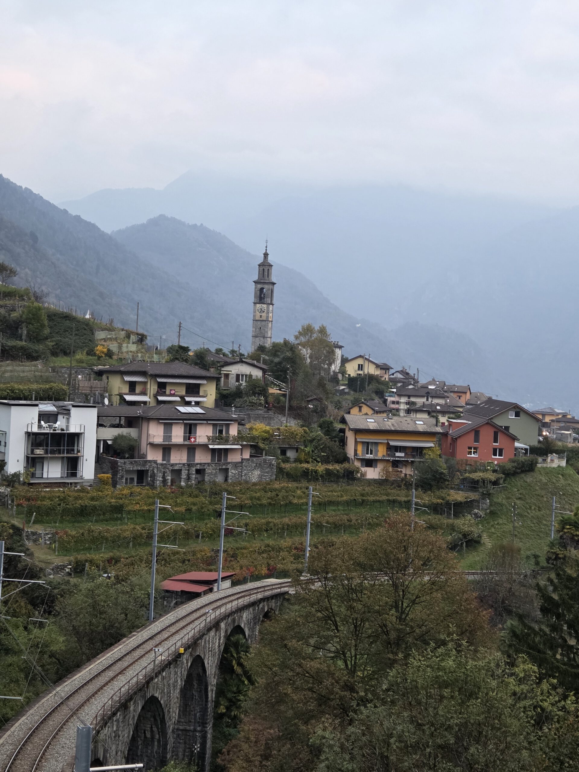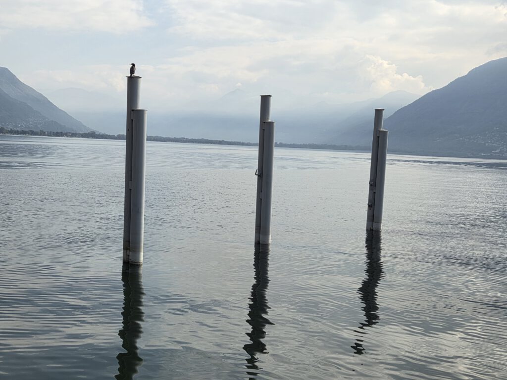 Wir fahren eine S-Bahn früher nach Mannheim und decken uns noch mit (schlechtem) Kaffee und Backwaren ein. Danach geht es erstaunlich (fast) pünktlich mit dem ICE nach Basel, von dort aus nochmal 4,5 Stunden in einem ziemlich leeren IR nach Locarno. Der Zug ist fast leer, der kleine Kaffeeautomat kann Leckeres zaubern und die Sicht ist natürlich grandios. Nach siebeneinhalb Stunden sind wir trotzdem froh angekommen zu sein. Im ICE wurden wir übrigens gar nicht kontrolliert, in der Schweiz hingegen gleich dreimal, mal mit einem fröhlichen Gruezi Miteinand, mal mit einem Buona Sera.