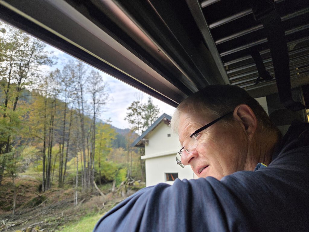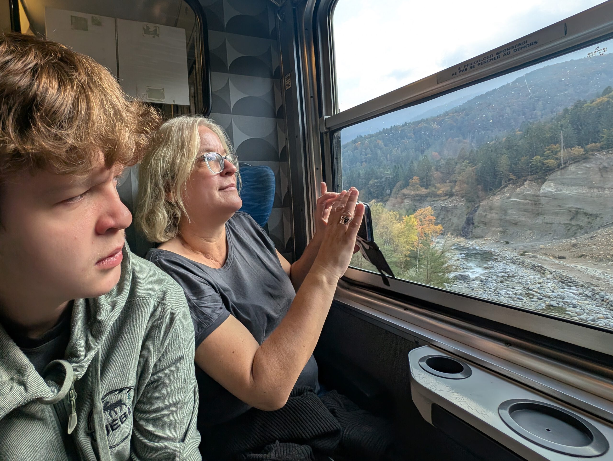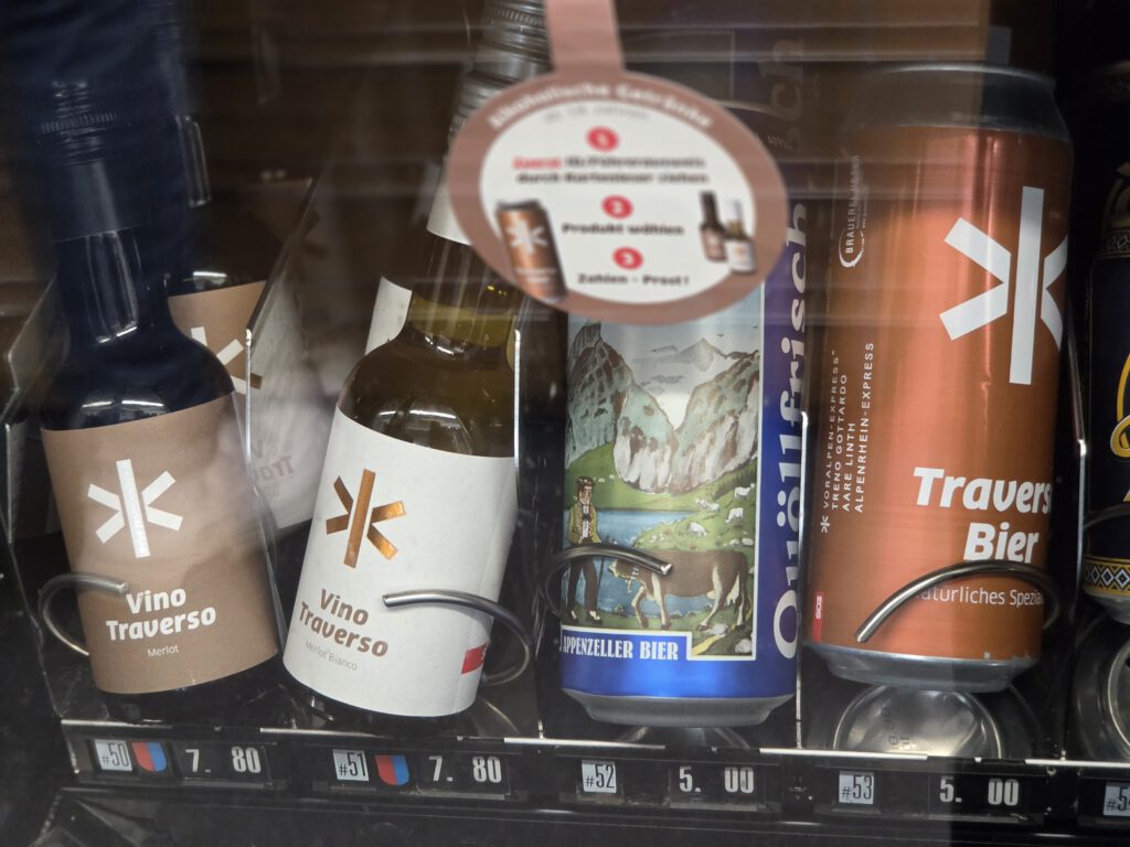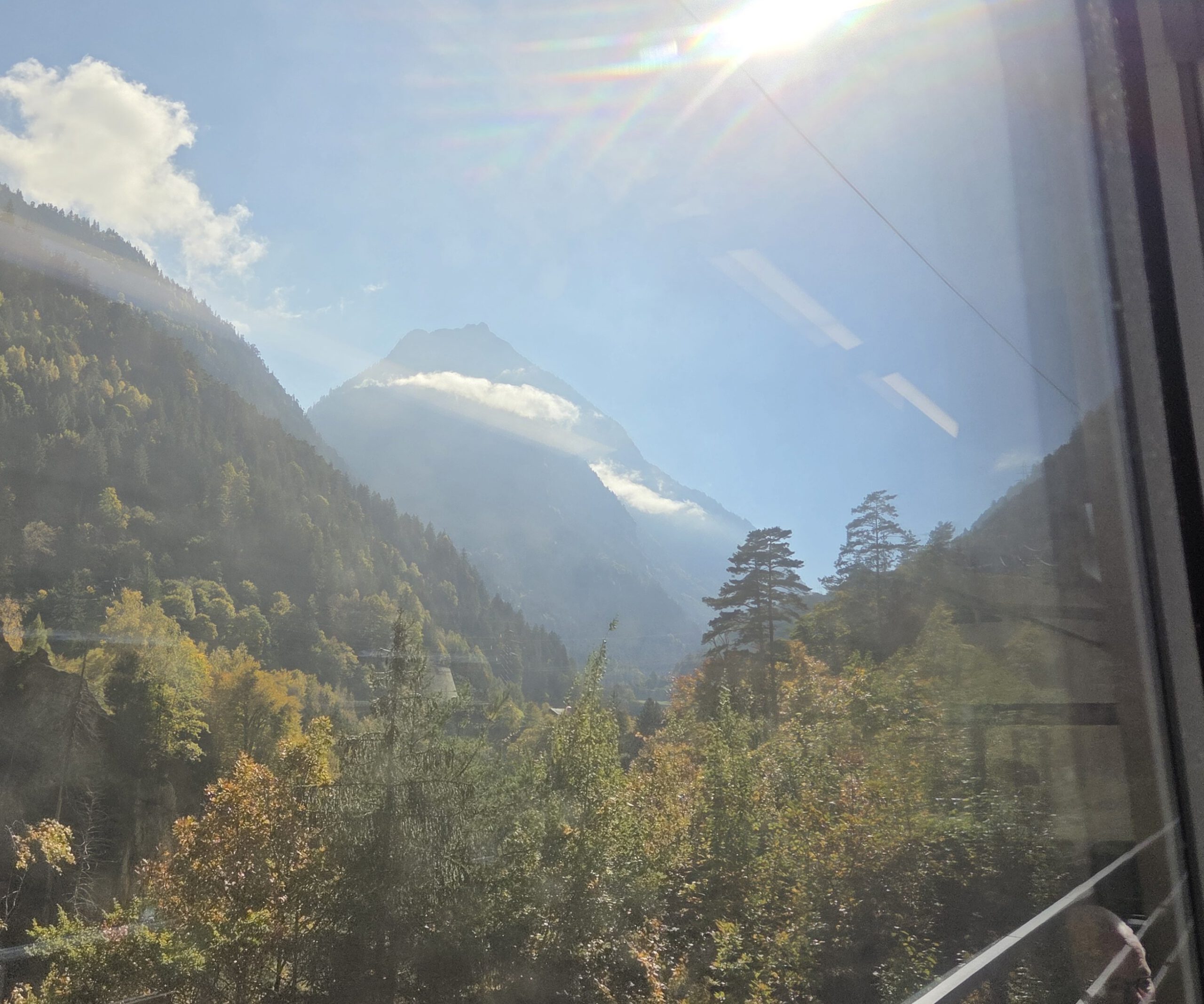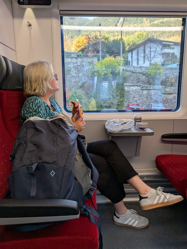 Diesmal sitzen wir in einem der Panoramazüge, die Sitze sind davon nicht breiter geworden. Dafür sind wir umzingelt von betagten Briten, die angesichts der Bergwelt aus dem Staunen nicht herauskommen und durchfilmen. Hier gäbe es sogar einen Servicewagen mit Kaffee, Bier und Aperol Spritz. Gibt es natürlich nicht, wir haben ja noch was vor.