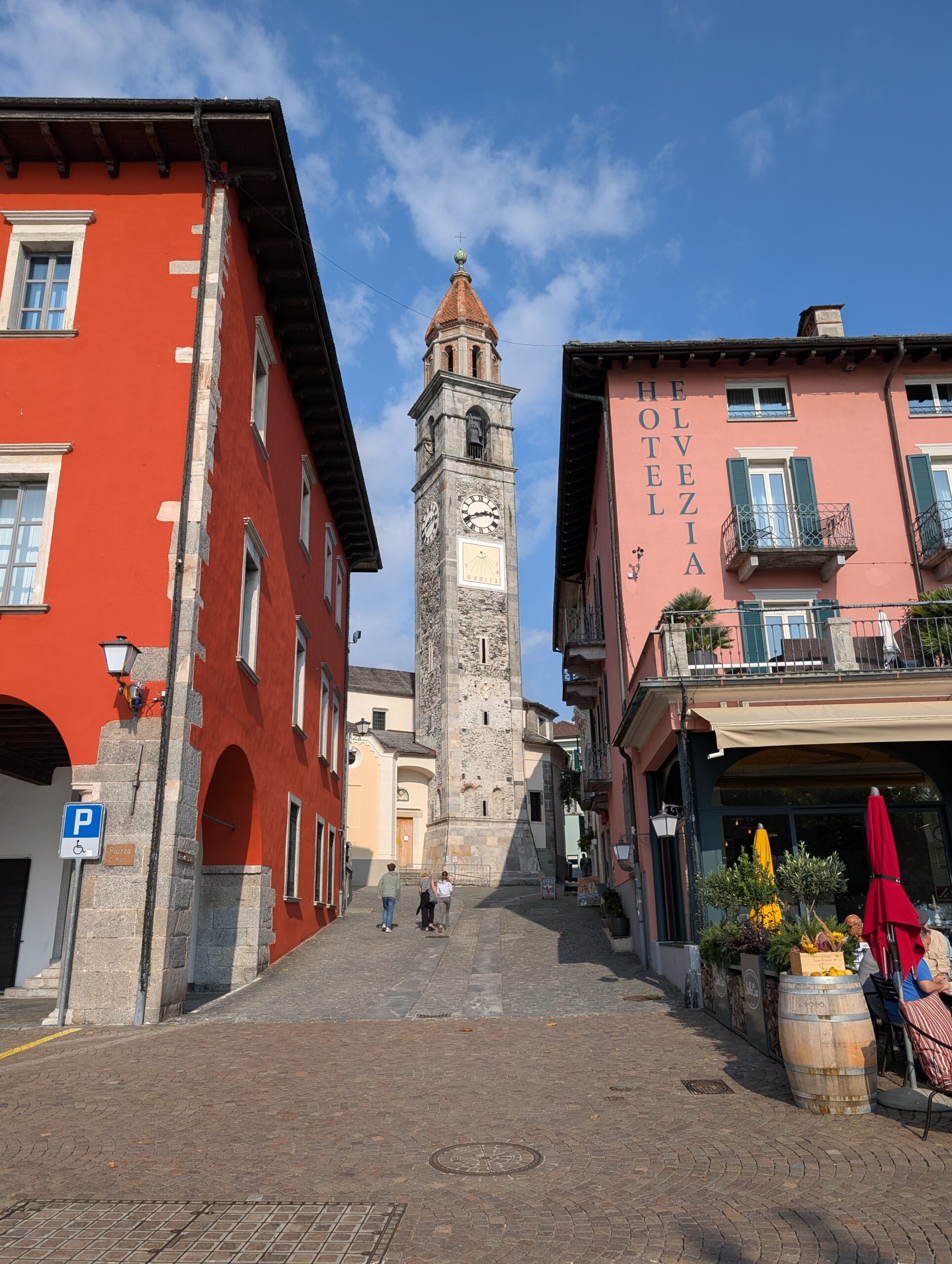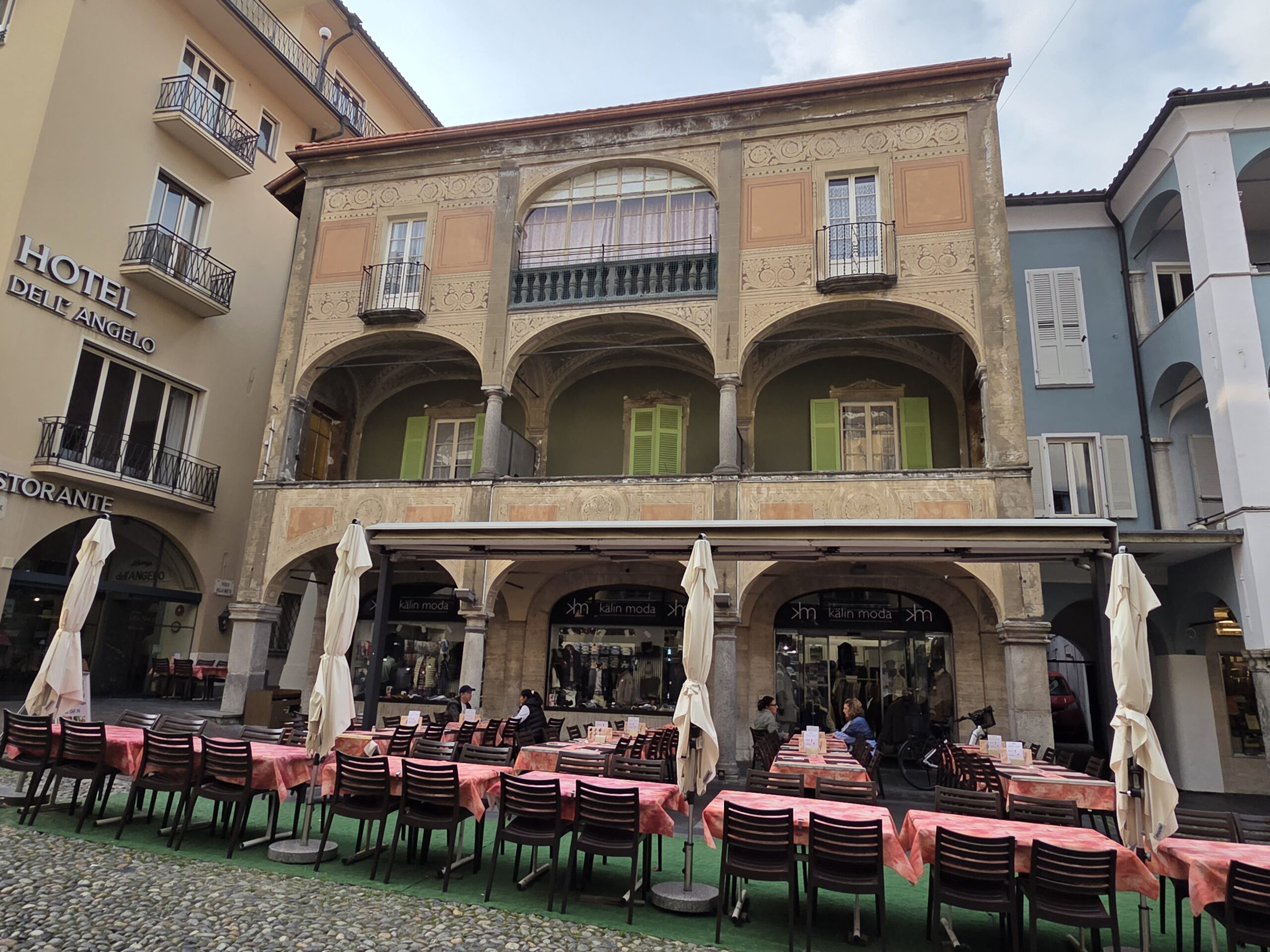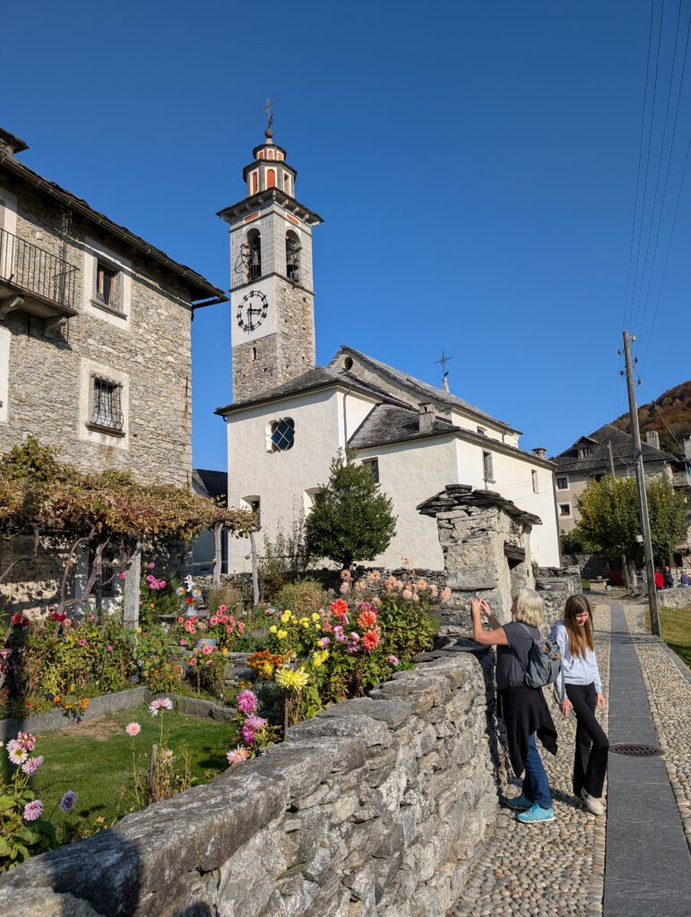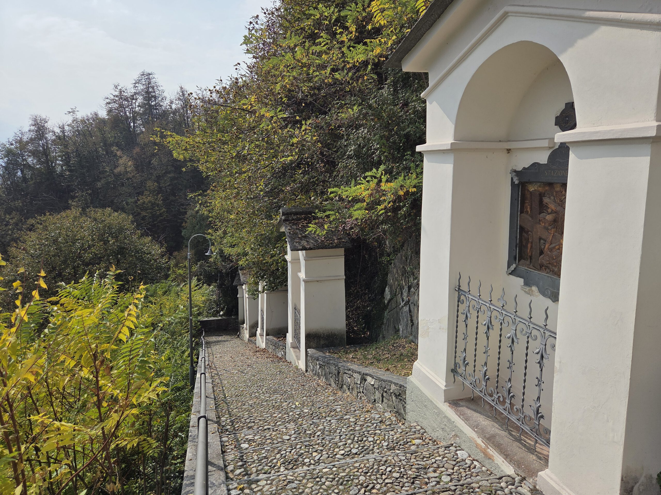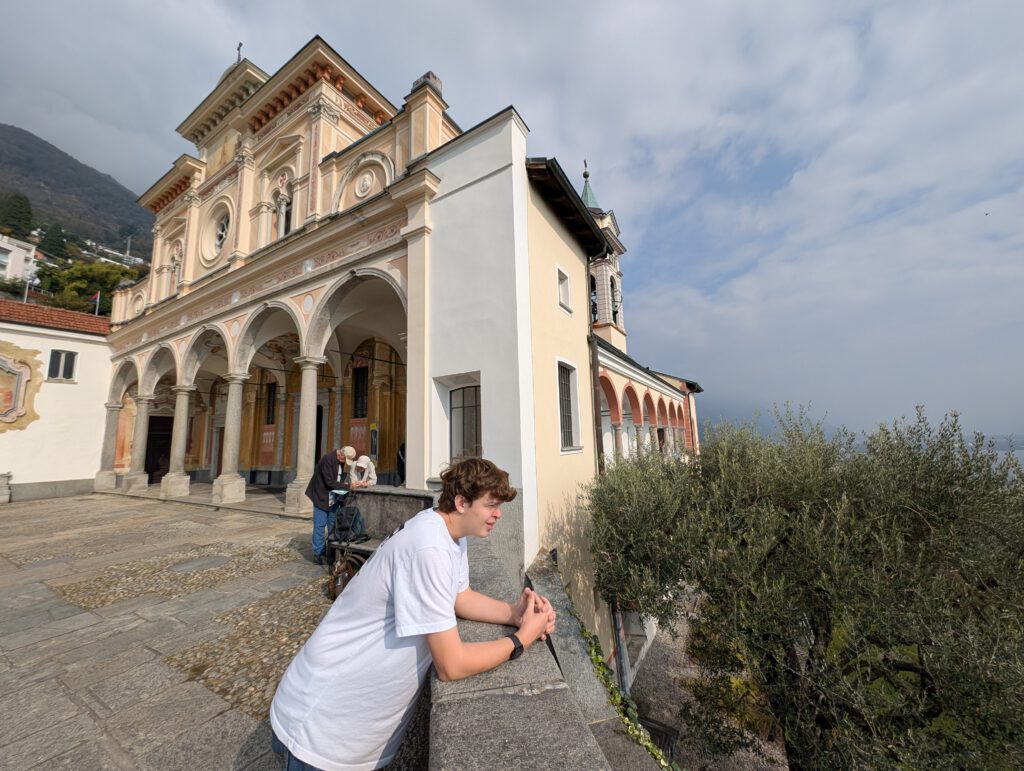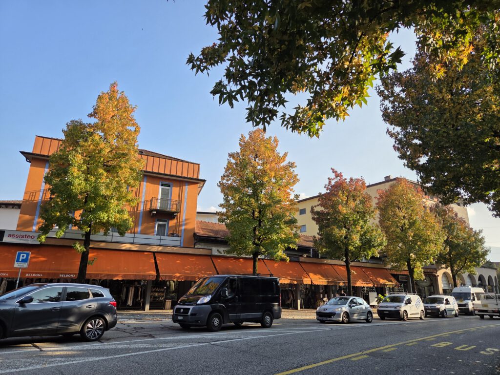 Kein Regen, aber ein trüber Sonntag. Wir starten gemütlich und verlassen das Haus erst spät. Eine Runde durch den Teil der Innenstadt, den wir noch nicht gesehen haben. Vorbei am Schloss und durch drei Kirchen. Wir lernen: Wenn sich die Reiseleitung in einem Restaurant höflich auf Italienisch nach einer Toilette erkundigt, dann ist das überhaupt kein Problem. Die Straßen sind menschenleer und wir fragen uns, wo die Bewohner von Locarno wohl stecken. Alle beim Kastanienfest bei der Wallfahrtskirche?