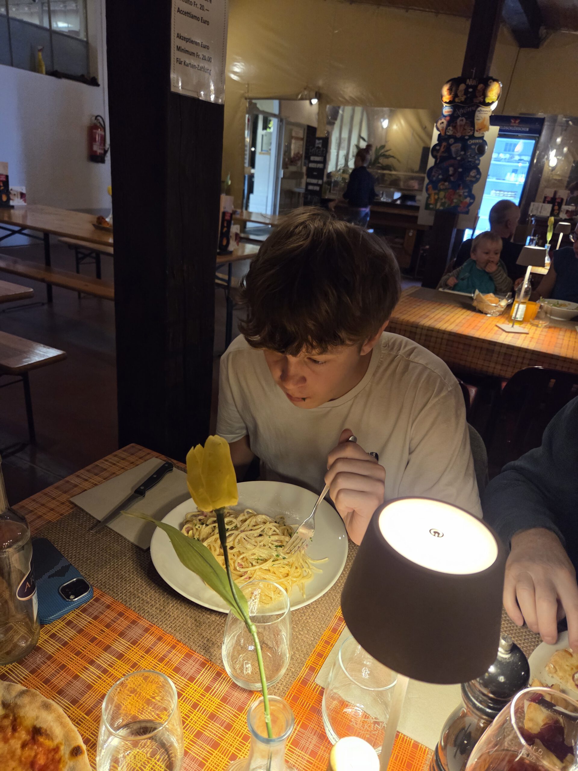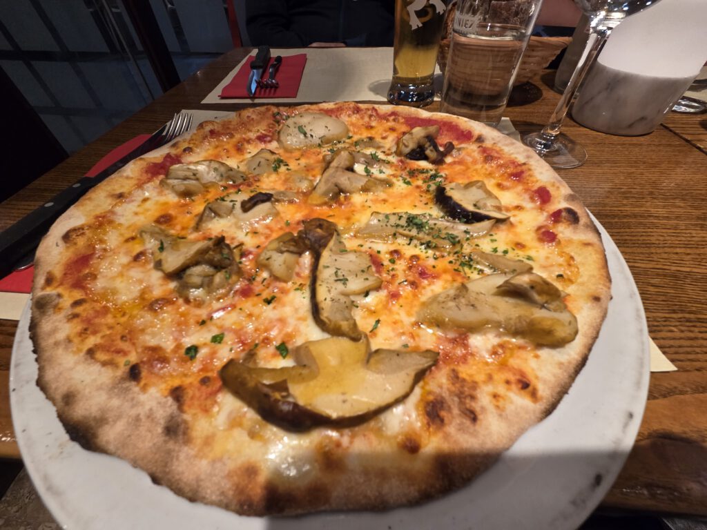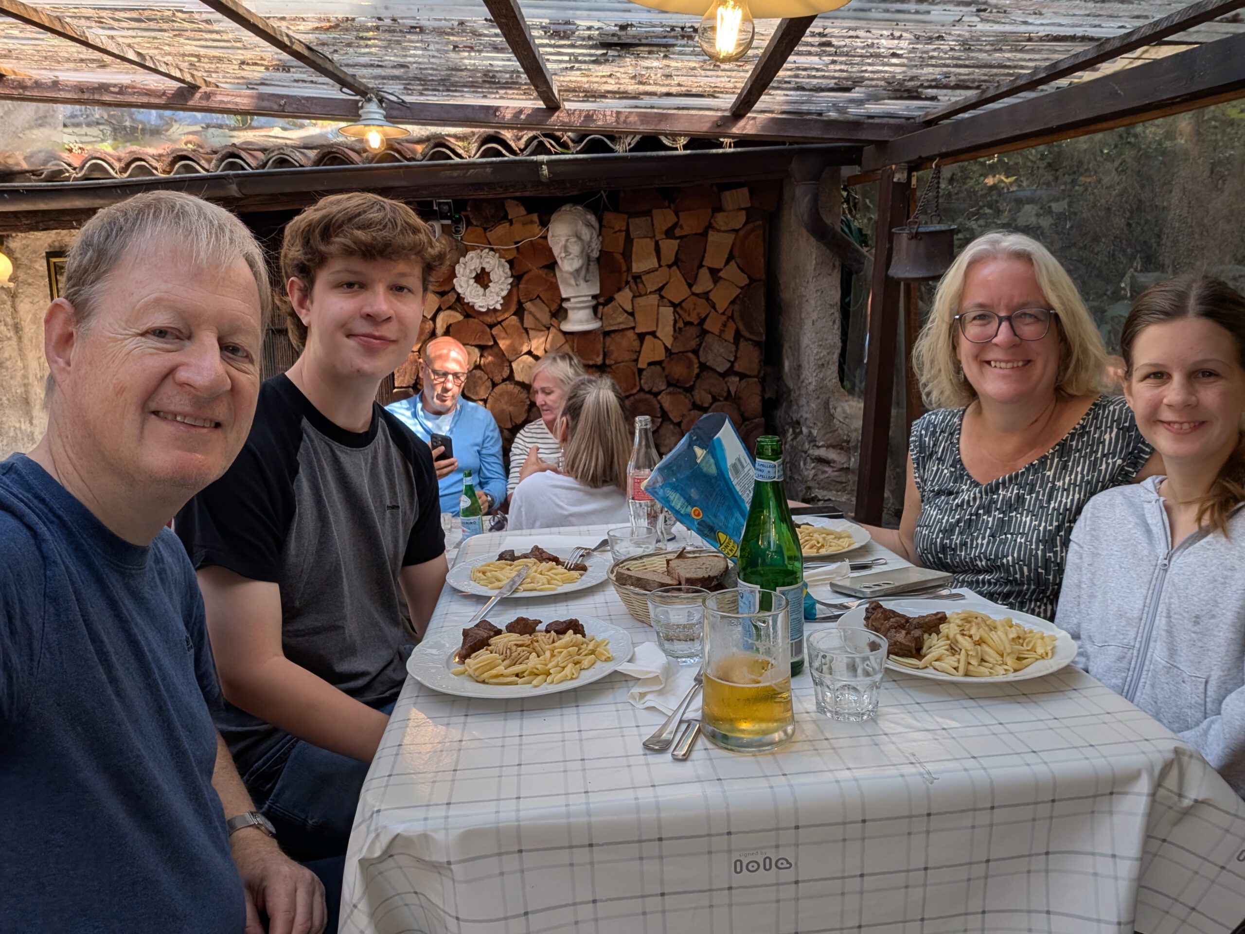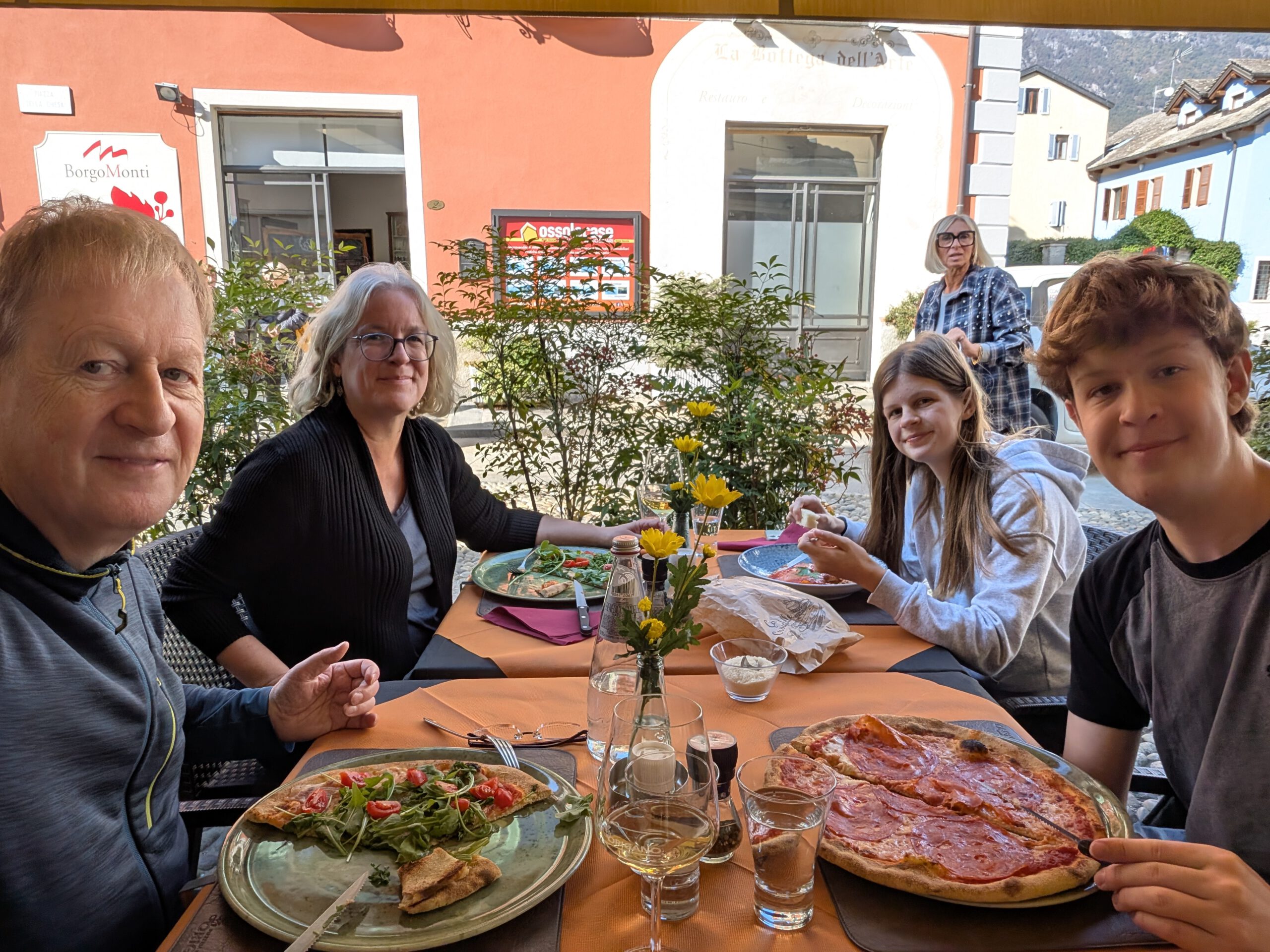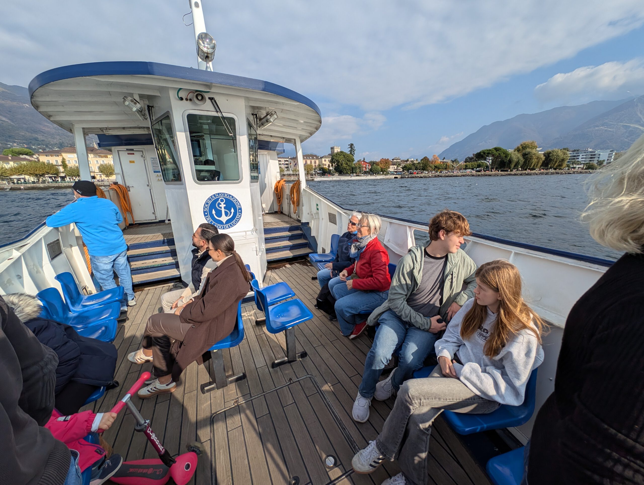 .... Und auf der einstündigen Bootsfahrt zurück nach Locarno stellt sich unter großem Gelächter der Familie heraus, dass sich das Gewächshaus auf einer anderen Insel befindet. Also nicht auf der Insel Brisago, sondern auf den Borromäischen Inseln. Die befinden sich auch im Lago Maggiore, aber deutlich südlicher. In Locarno wählen wir eine Pizzeria, die von drei älteren Herren und einer älteren Dame betrieben wird. Dort gibt es Nudeln und Pizza mit Steinpilzen, aber auch eine kleine Portion Spaghetti und eine Minestrone. Was uns mit der überteuerten Wasserflasche wieder komplett versöhnt.