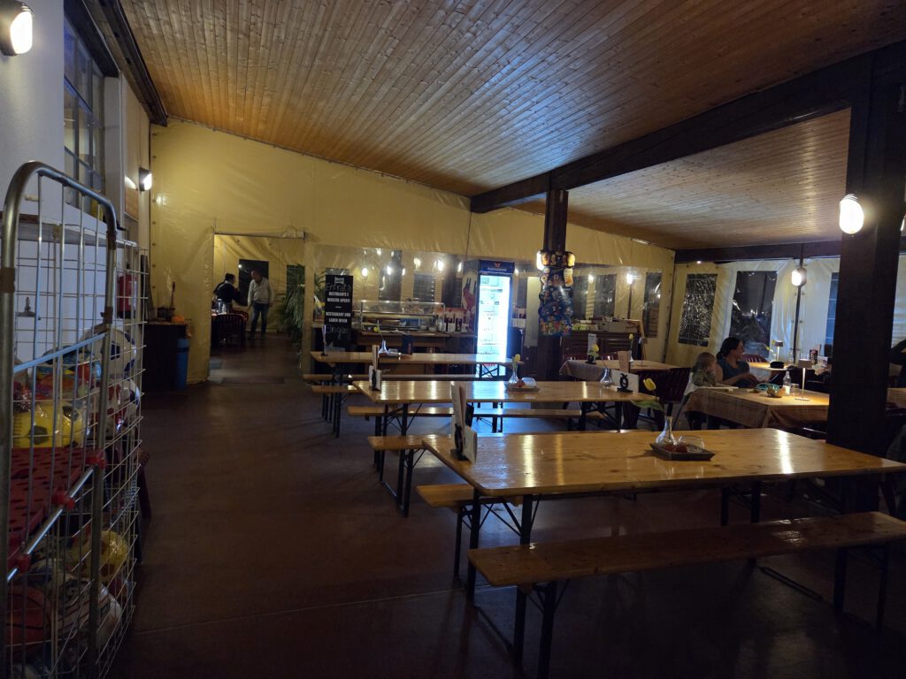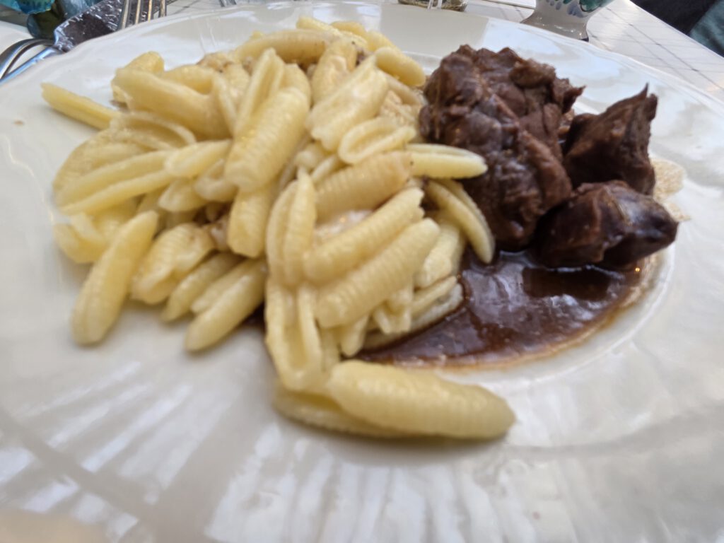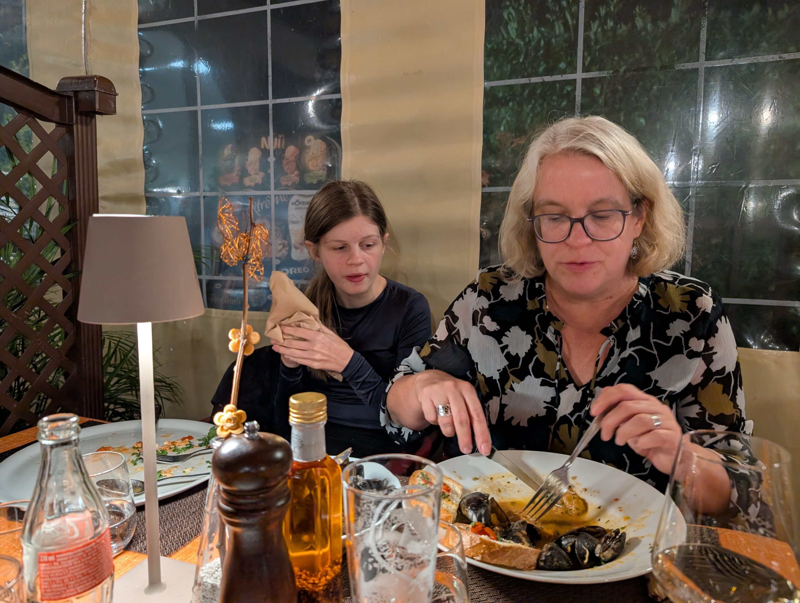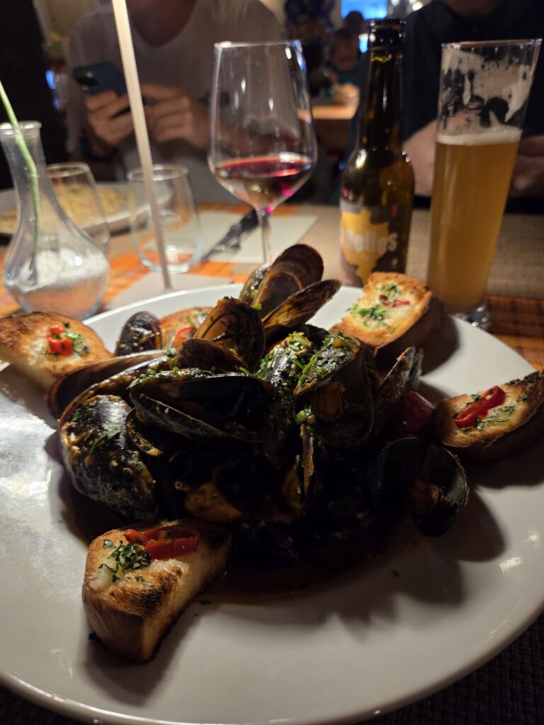 Das Ristorante selbst - sagenhaft. Im Inneren sehr rustikal, mit Zeltwänden, dazu ein kleiner Laden (günstiger als der Bioladen, also wird schnell Frühstück gekauft, Brötchen dürfen dann teuer sein). Aber die Muscheln, die Pizzen, die Pasta, der Nachtisch - wir sind im Glück. Und die Reiseleitung darf auch noch deutsch-italienisch plaudern.... Mal wieder am ersten Abend ein Stammlokal gefunden.