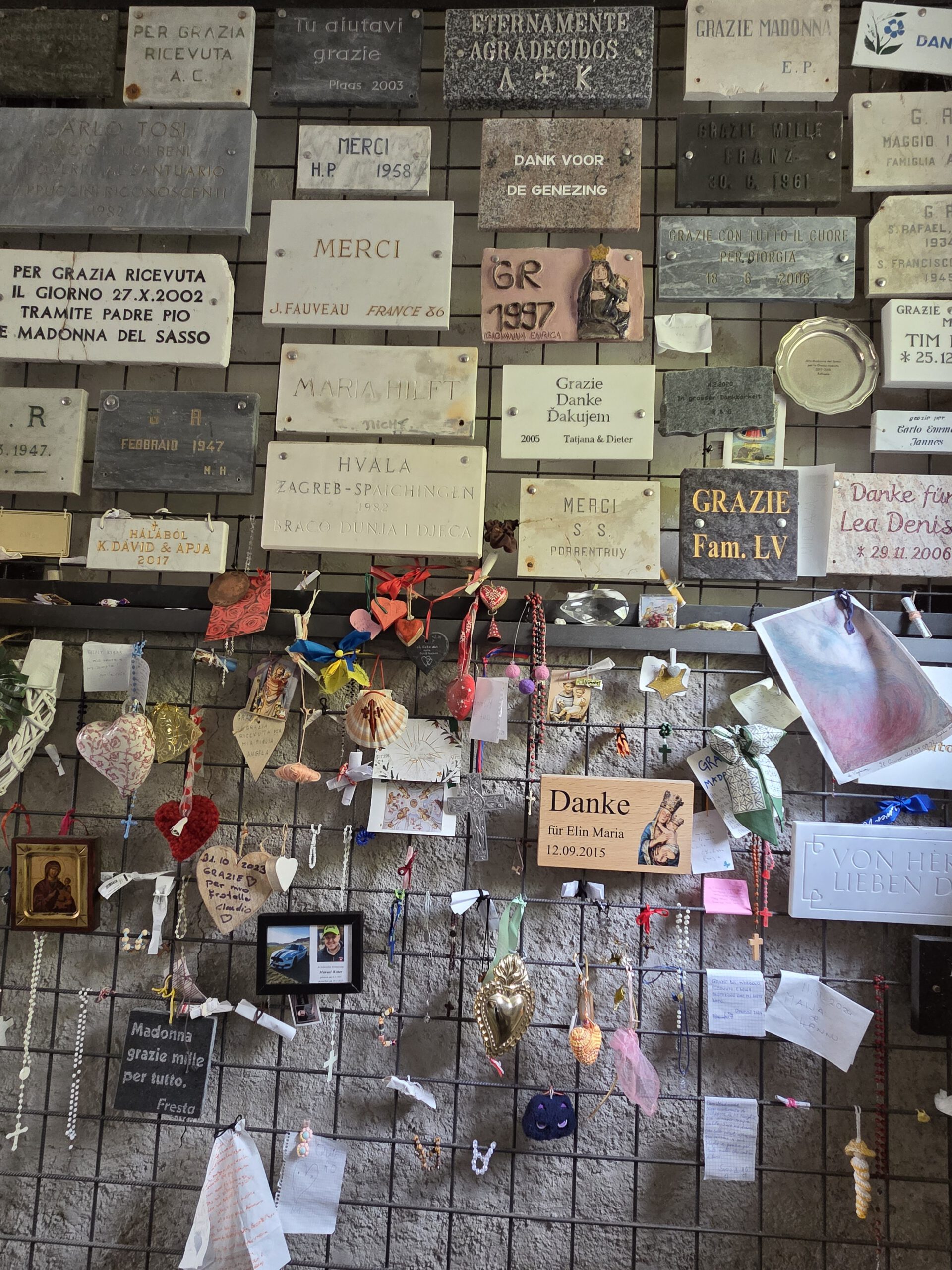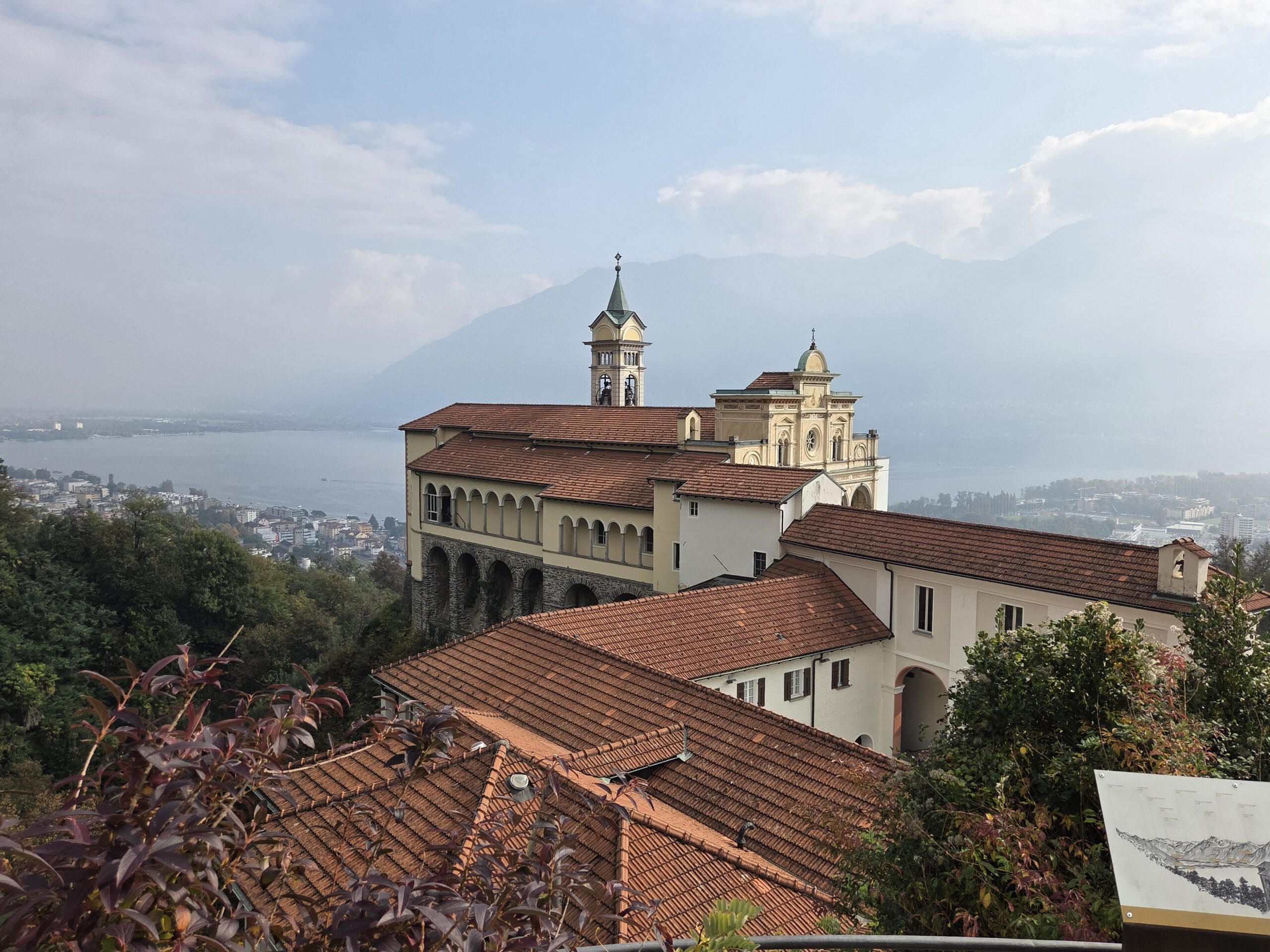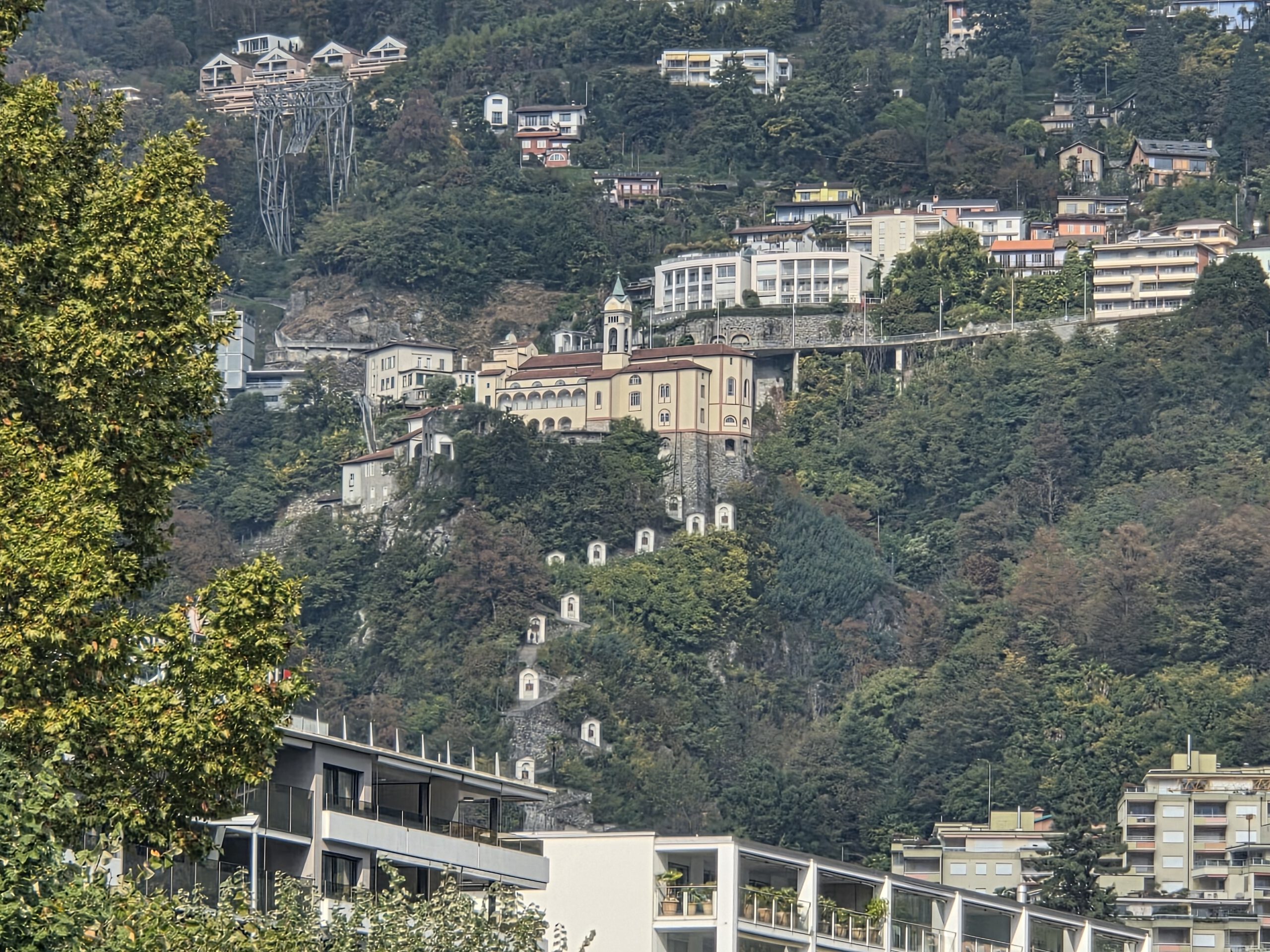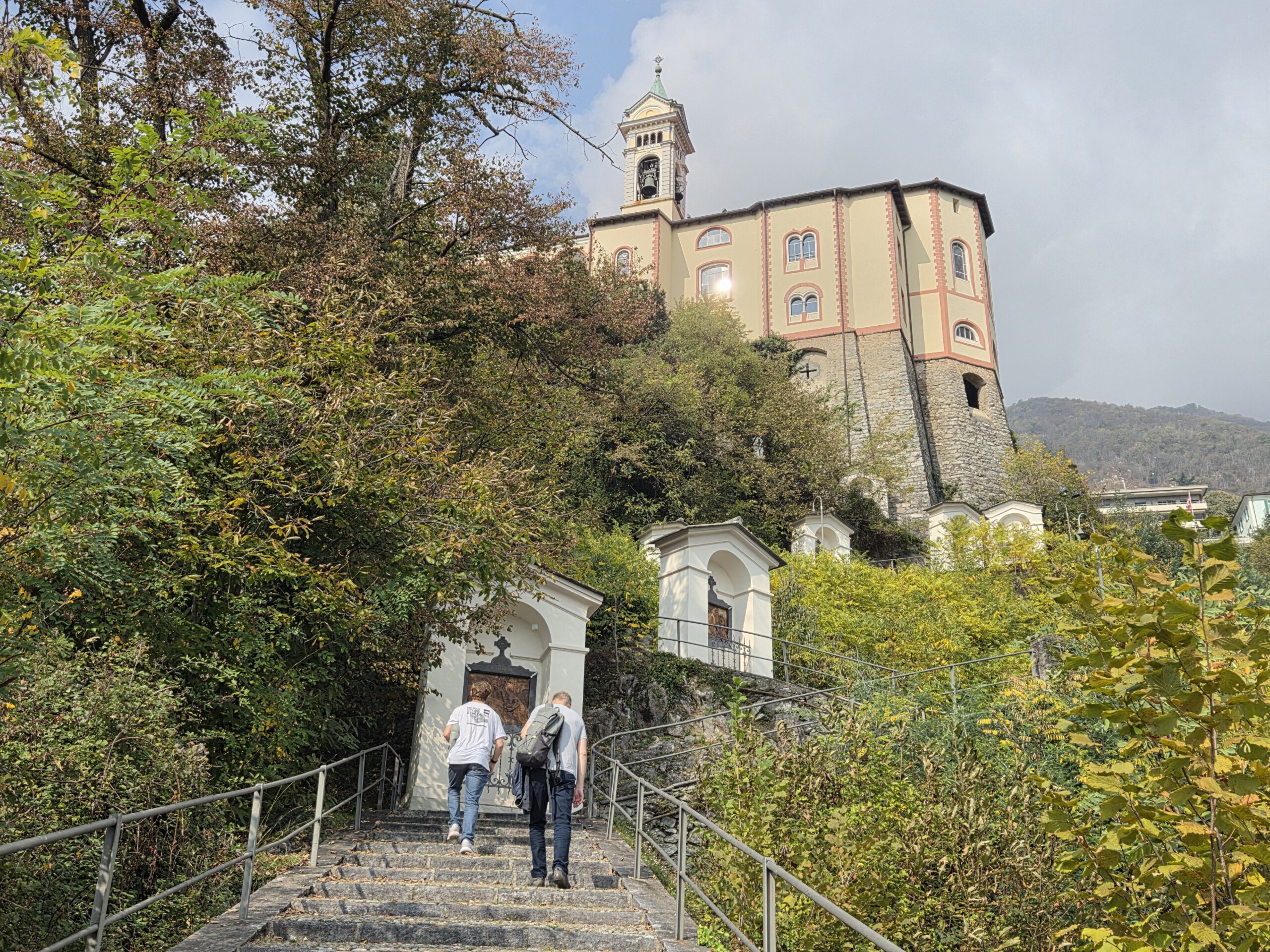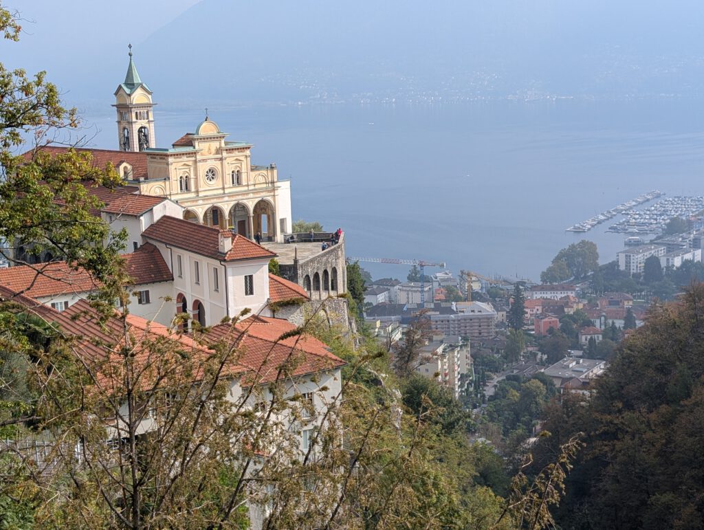Picknickort wird der Bootsableger, danach gehen wir zu Fuß über den Kreuzweg hoch zur Wallfahrtskirche Madonna del Sasso. Diese liegt attraktiv auf einem Hügel und ist unter anderem über den Kreuzweg zu Fuß zu erreichen. Aber es ist dann doch gar nicht so steil, wie es zunächst wirkt. Die Sicht ist wunderschön und es ist gar nicht so viel los. Das Innere der 1480 begonnenen Kapelle ist rettungslos überladen und leider fehlen die Büchlein mit den Geschichten derer, die sich für die Heilung bedanken, was es anderswo immer gibt. Für den Rückweg wollen wir die kleine blaue Standseilbahn nehmen, die uns sehr an Lissabon erinnert. Aber ... Nur Barzahlung in Schweizer Franken.