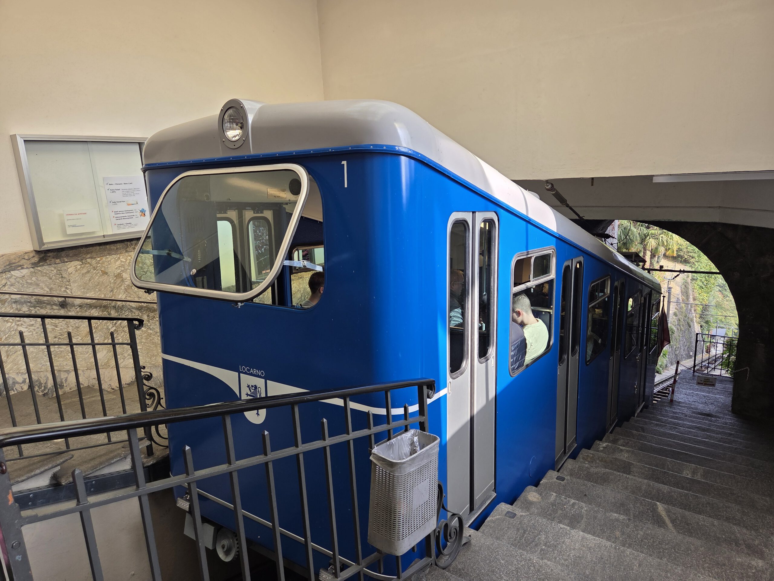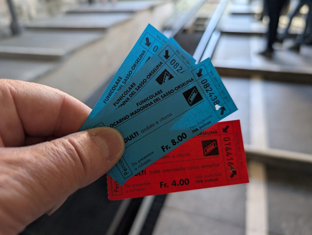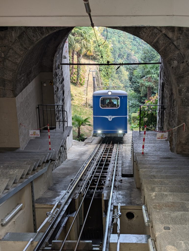 In den vergangenen Tagen war der Cimetta, der Hausberg von Locarno, immer in Dunst gehüllt. Morgen soll es regnen. Aber heute strahlte die Sonne schon seit dem frühen Morgen. (Und praktischerweise kann die Reiseleitung auch wieder schmerzfrei gehen). Also setzen wir den Plan um, den es seit Tag 1 hier gibt: Wir laufen zum kleinen blauen Bähnchen, das uns erstmal zur Wallfahrtskirche Madonna del Sasso bringt. An der Talstation kann man mit Karte zahlen. Während wir Schlange stehen, buchen wir noch schnell die Tickets online für die Seilbahn weiter oben - unterschiedliche Firmen, unterschiedliche Warteschlangen. Aber das klappt ganz gut.