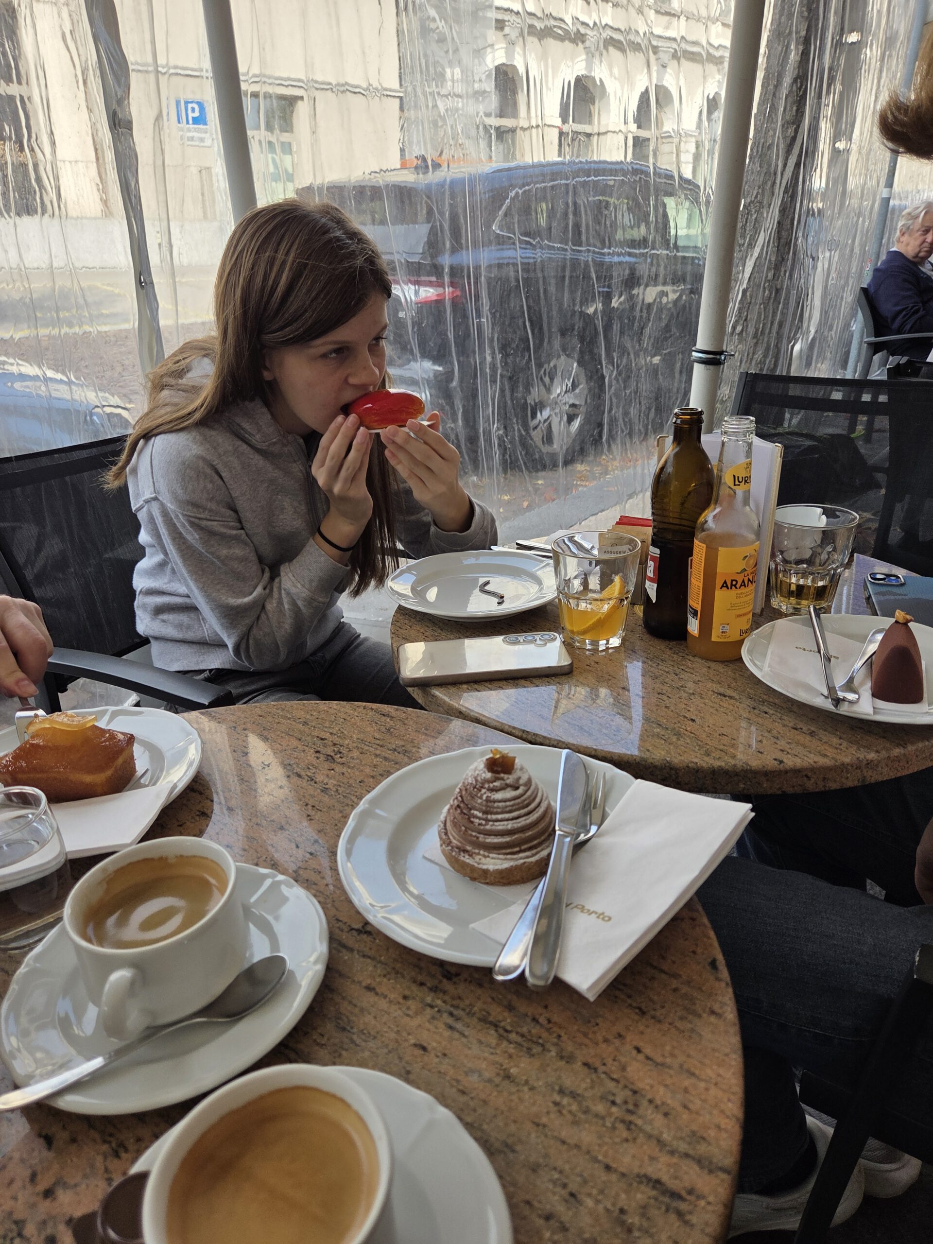 Also laufen wir den Pilgerweg auch wieder nach unten und belohnen uns danach noch mit vier Teilchen im Café Al Porto, die allesamt sehr fein schmecken: Eine Mangokreation für Louisa, Zitronenkuchen für Gerald, Nougathappen für Kilian und Maronencreme für Nicole. Danach buchen wir unsere Tickets für eine ganz besondere Zugfahrt morgen, für die sich die Reiseleitung noch ein ambitioniertes Zusatzprogramm ausgedacht hat - mehr sei noch nicht verraten. Außer: Die Dame am Fahrkartenschalter war beeindruckt.