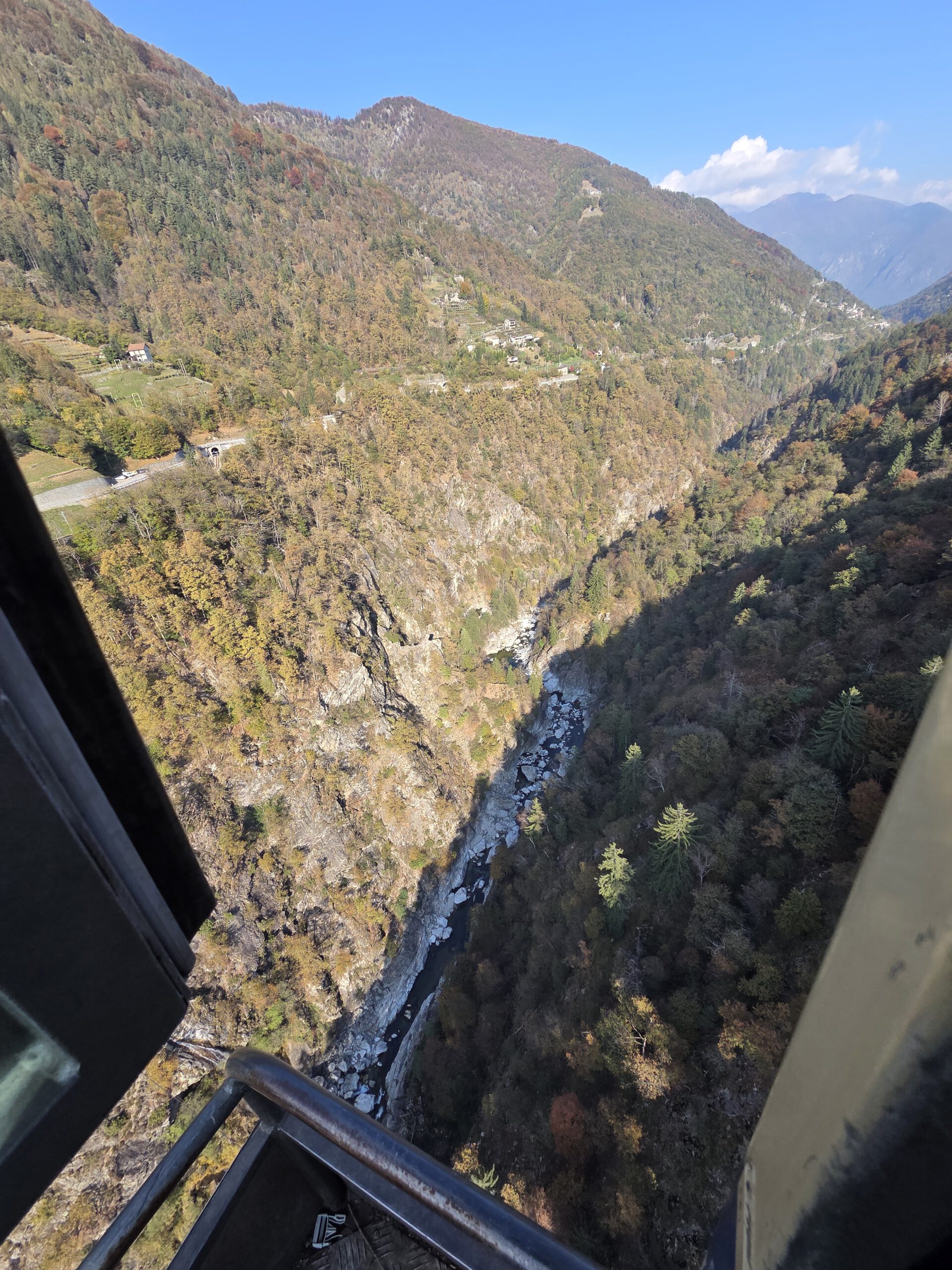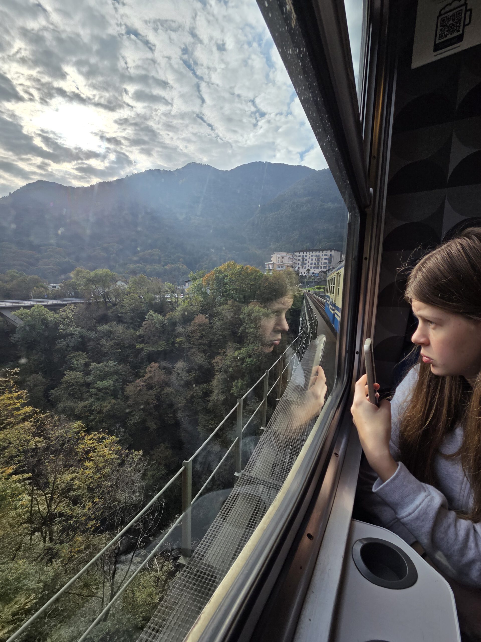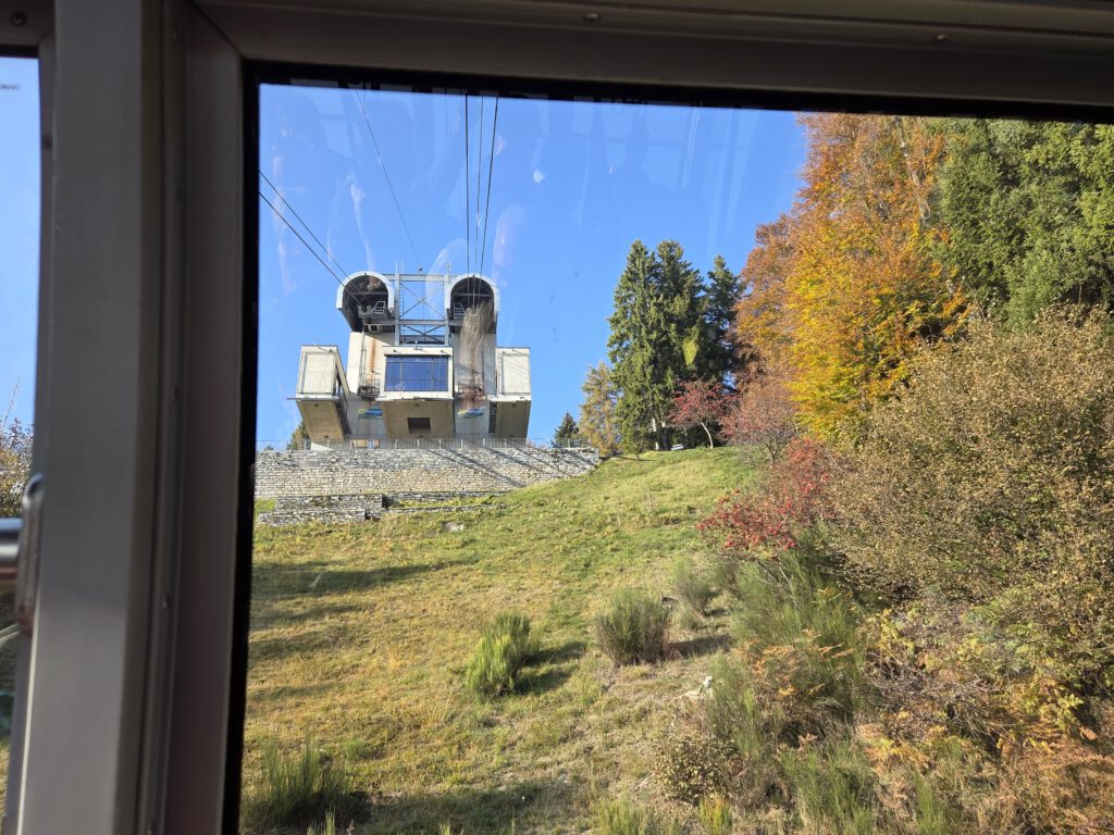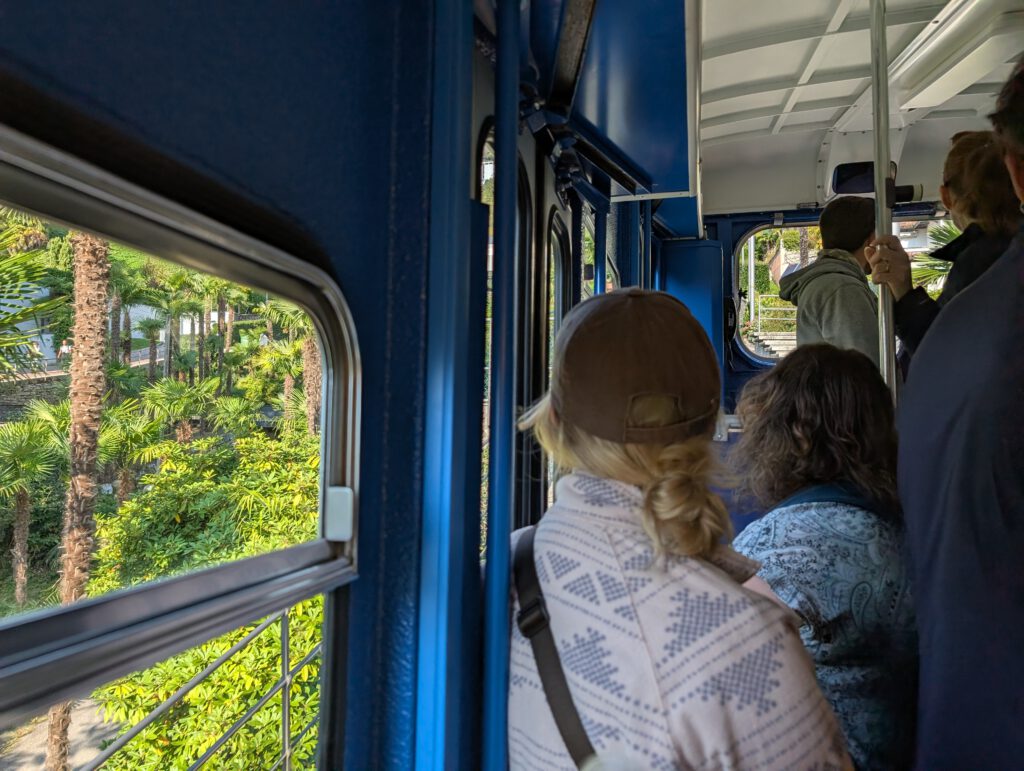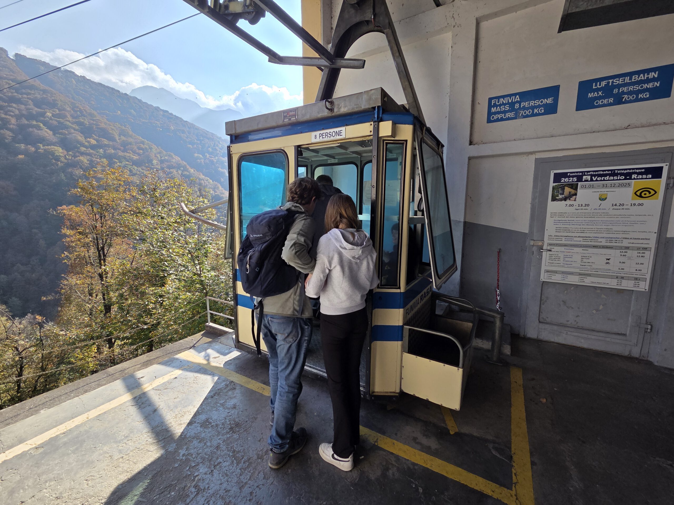 In Camedo steigen wir uns und nehmen für zwei Stationen die Regionalbahn nach Varesio. Der komfortableste Zug der ganzen Fahrt, übrigens. Leise, großzügige Sitzplätze, die noch dazu bequemer sind. In Verdasio steigen wir aus und direkt um in die kleine, alte Seilbahn, die auf die andere Seite des Tales führt. Ein Paar mit zwei kleinen Kindern sitzt schon, mit uns Vieren dazu ist es ganz schön kuschelig. Man kauft ein Ticket am Automaten und startet dann die Bahn, kontrolliert wird auf der anderen Seite. Die Sicht ist durchaus beeindruckend ..,
