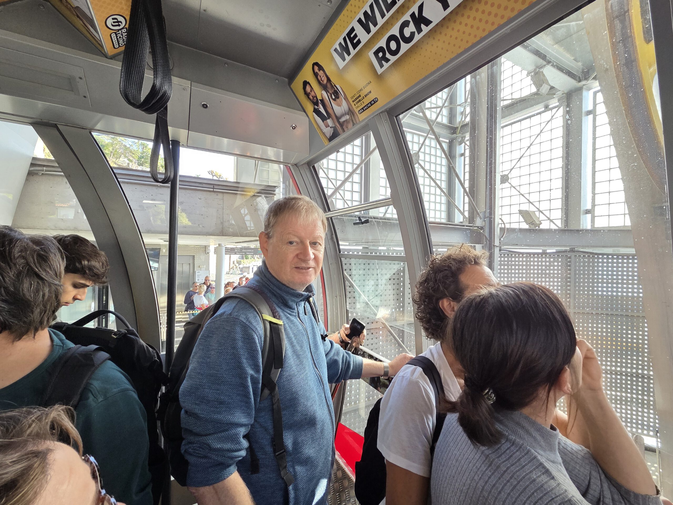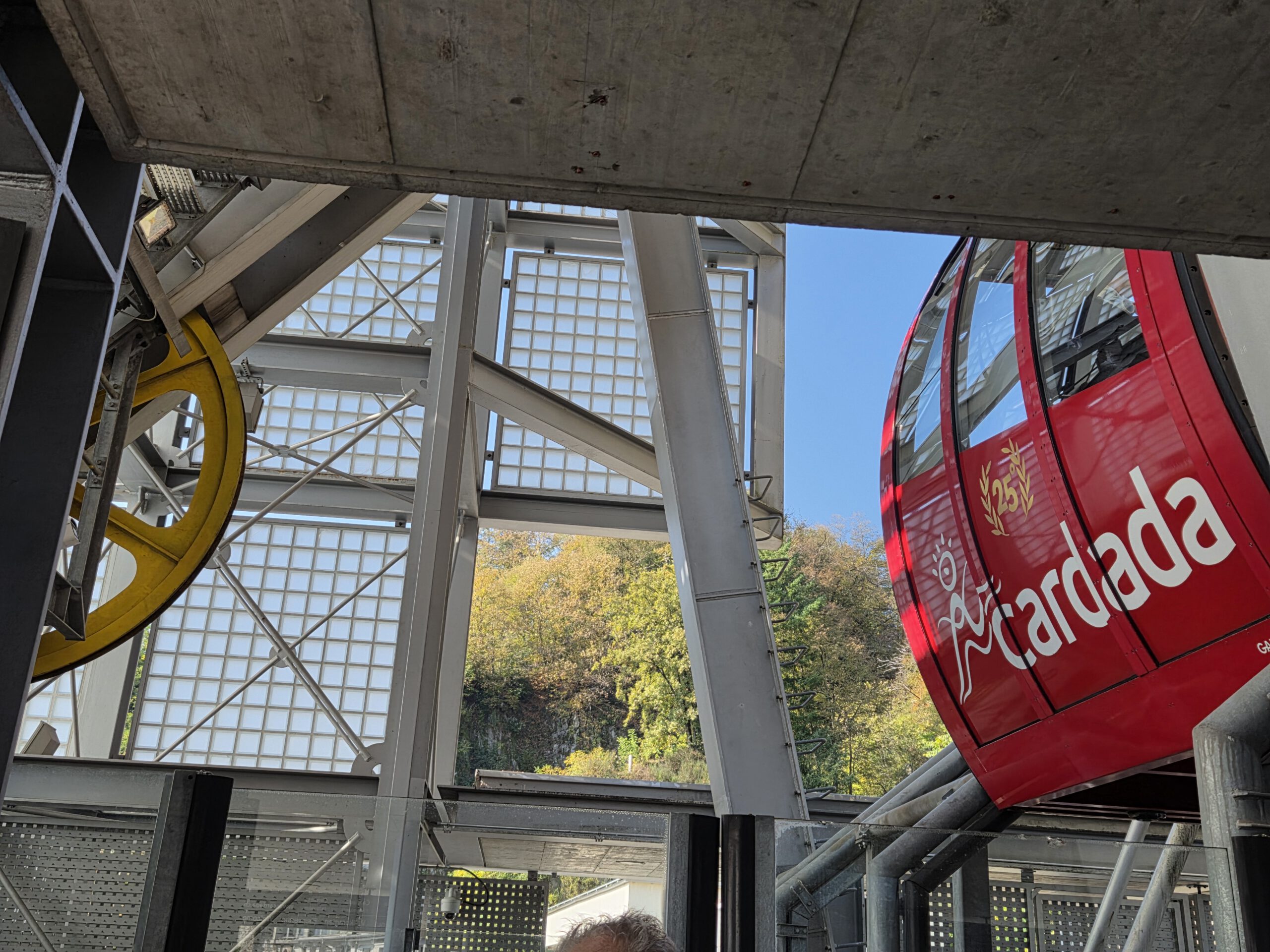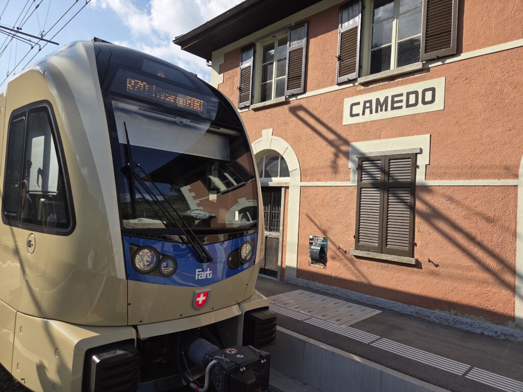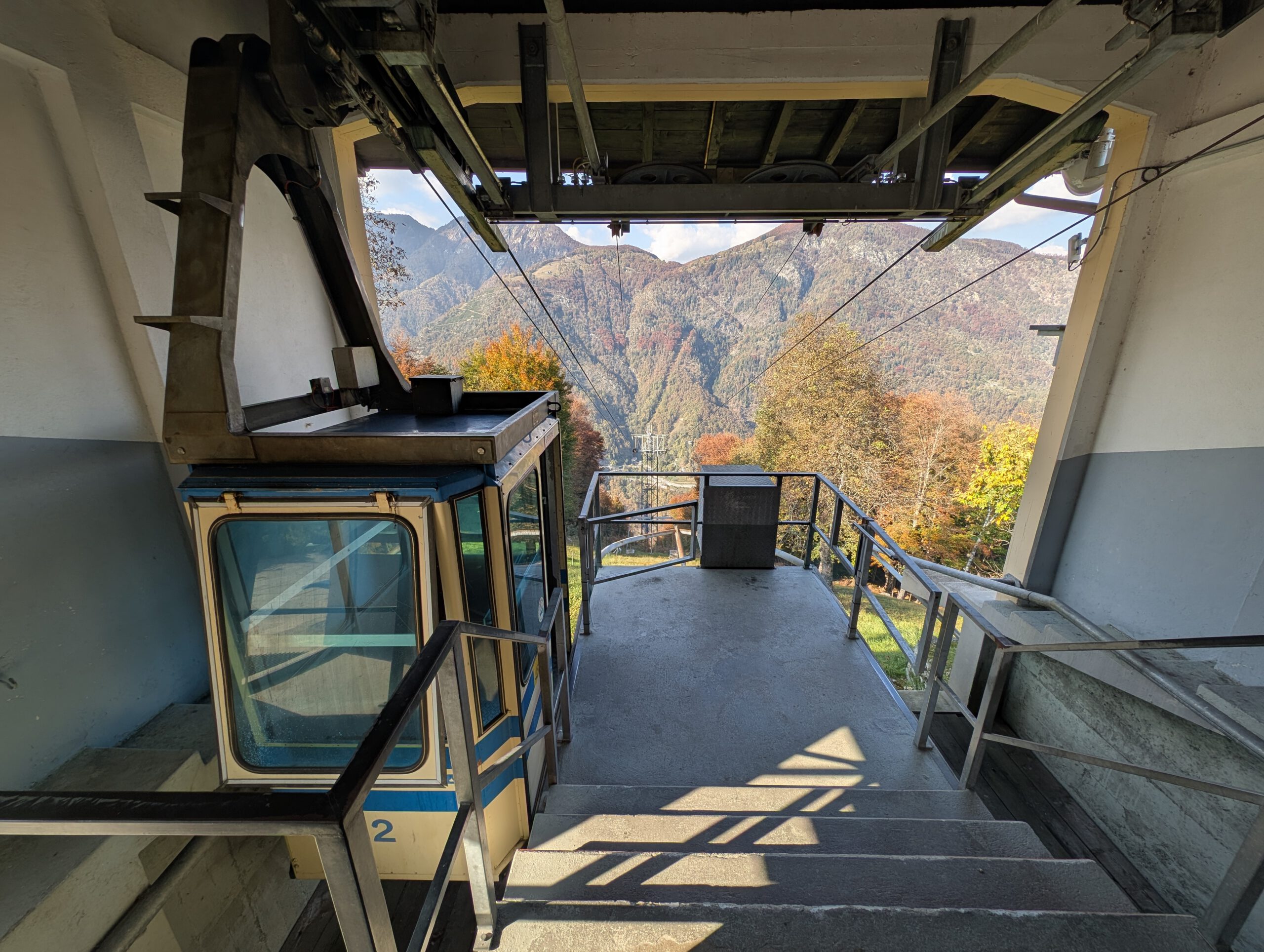 In Camedo steigen wir uns und nehmen für zwei Stationen die Regionalbahn nach Varesio. Der komfortableste Zug der ganzen Fahrt, übrigens. Leise, großzügige Sitzplätze, die noch dazu bequemer sind. In Verdasio steigen wir aus und direkt um in die kleine, alte Seilbahn, die auf die andere Seite des Tales führt. Ein Paar mit zwei kleinen Kindern sitzt schon, mit uns Vieren dazu ist es ganz schön kuschelig. Man kauft ein Ticket am Automaten und startet dann die Bahn, kontrolliert wird auf der anderen Seite. Die Sicht ist durchaus beeindruckend ..,