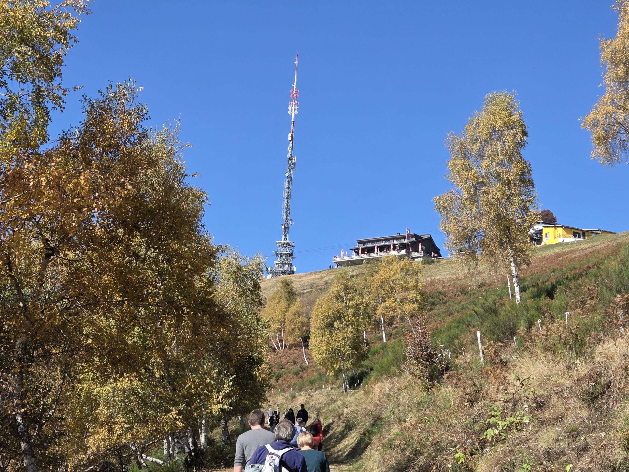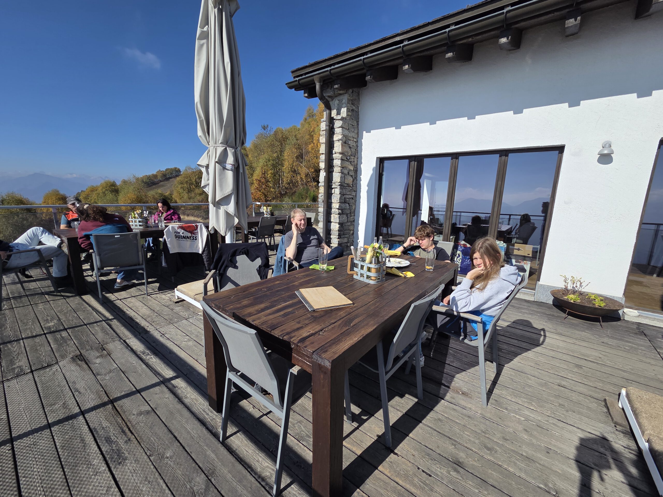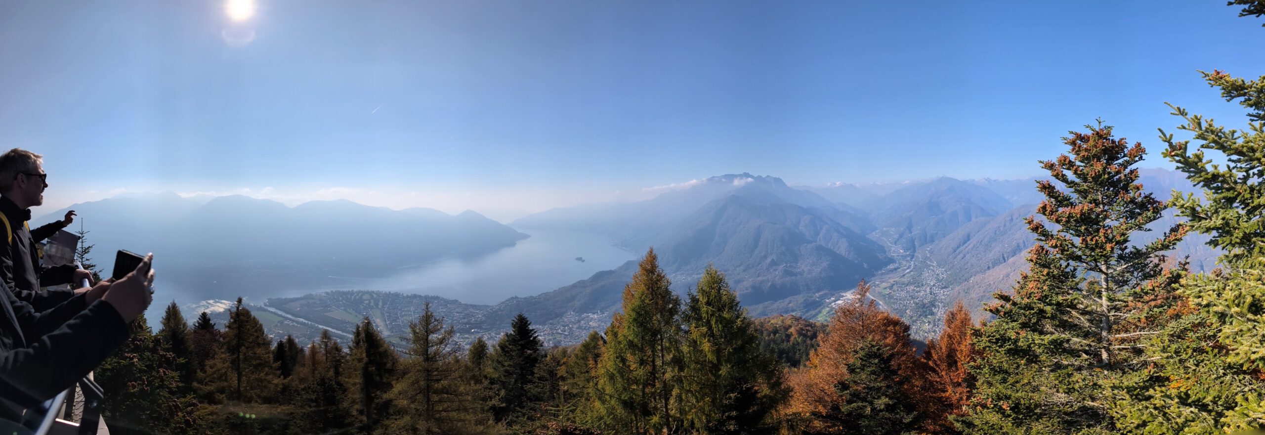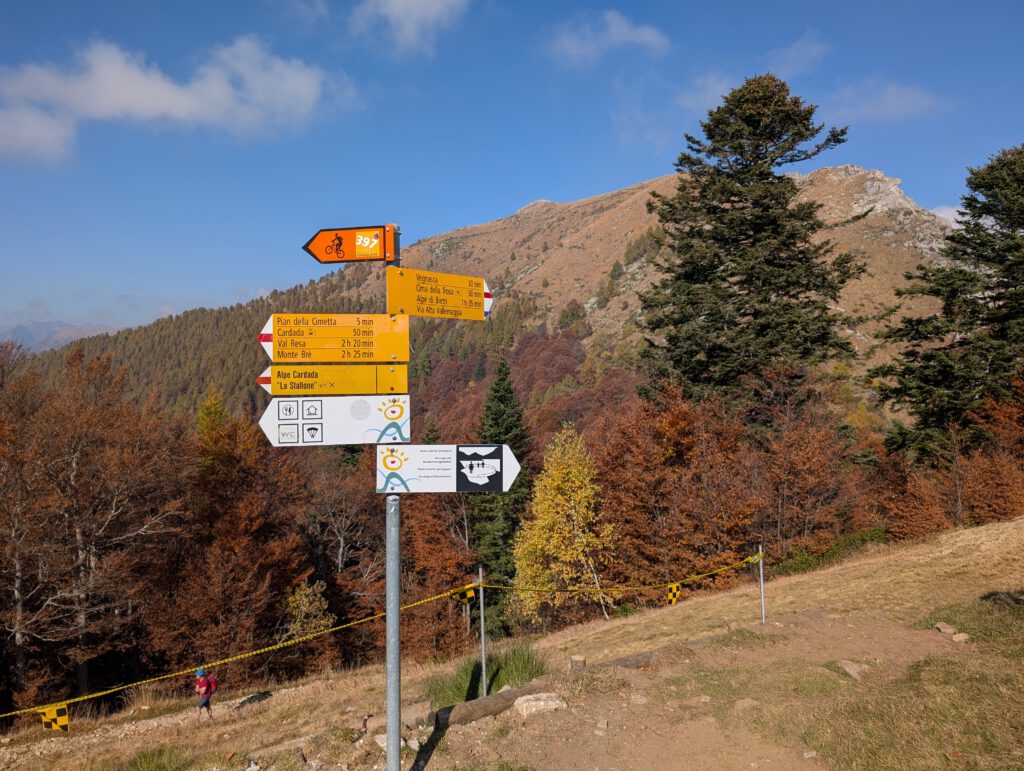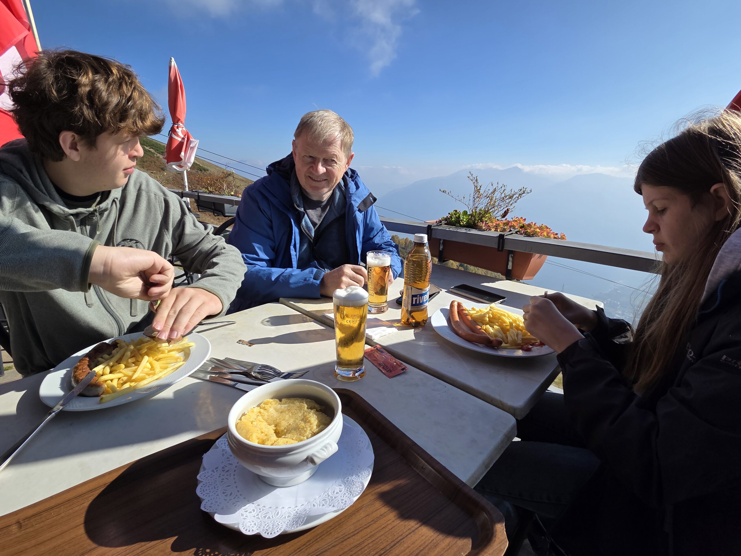 Was für einen Sicht! Gerald und Kilian würden am liebsten direkt auf den nächsten Gipfel weiterziehen, verschieben das aber auf einen anderen Urlaub. Wir genießen lange den Blick auf der Plattform, dann geht es noch für eine kleine Einkehr auf die Alm (Würstel mit Pommes, eine kleine Polenta, zwei kleine Bier). Der Rückweg führt erst durch einen Herbstwald steinig bergab, dann wird es wieder gemütlich. Wir nehmen die Bahn von Cardada zurück, inzwischen ist deutlich weniger los.