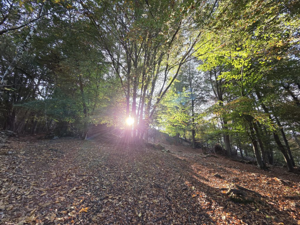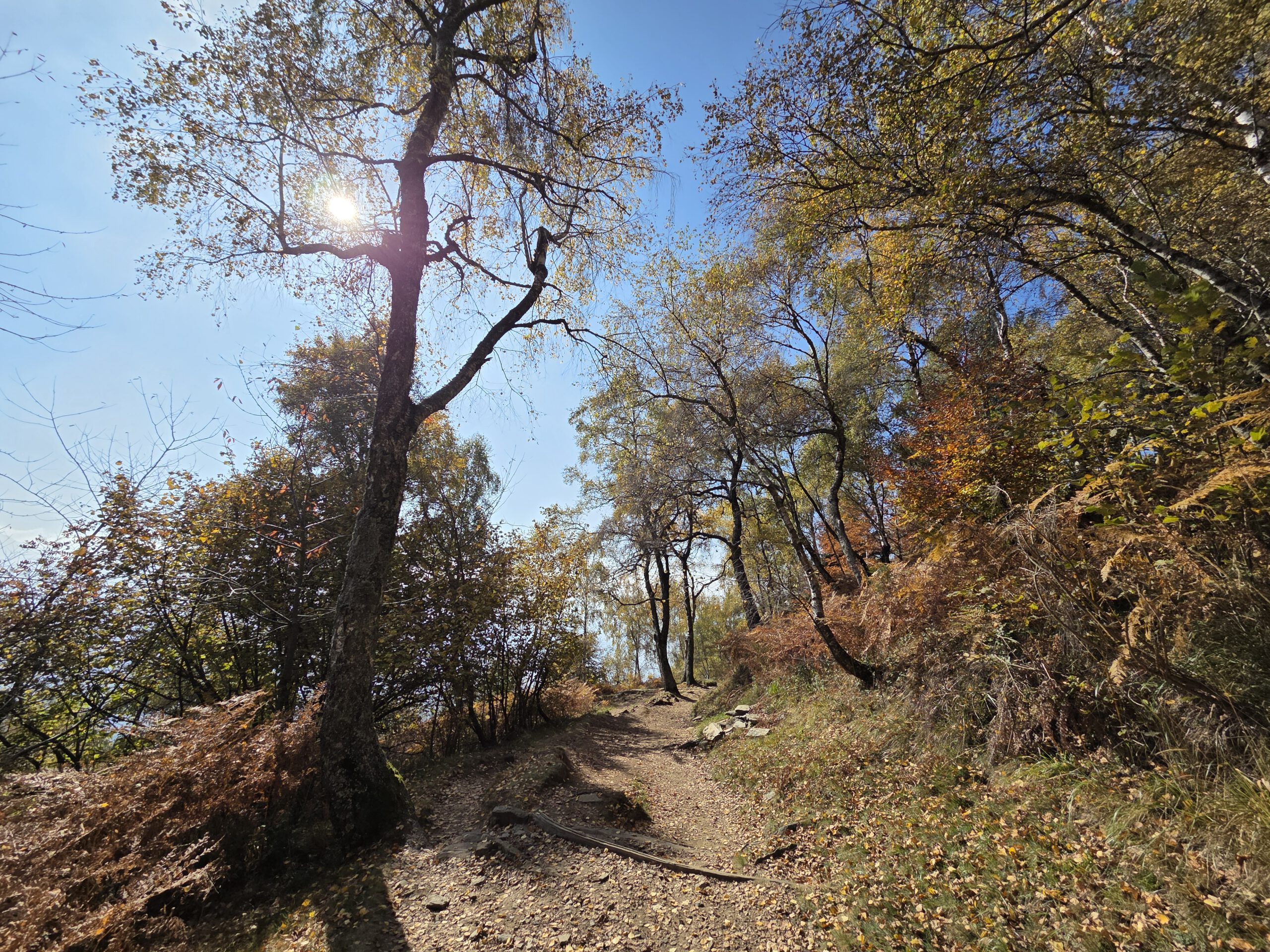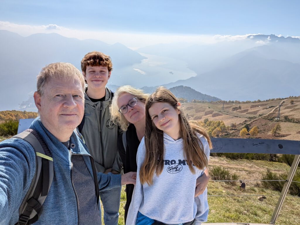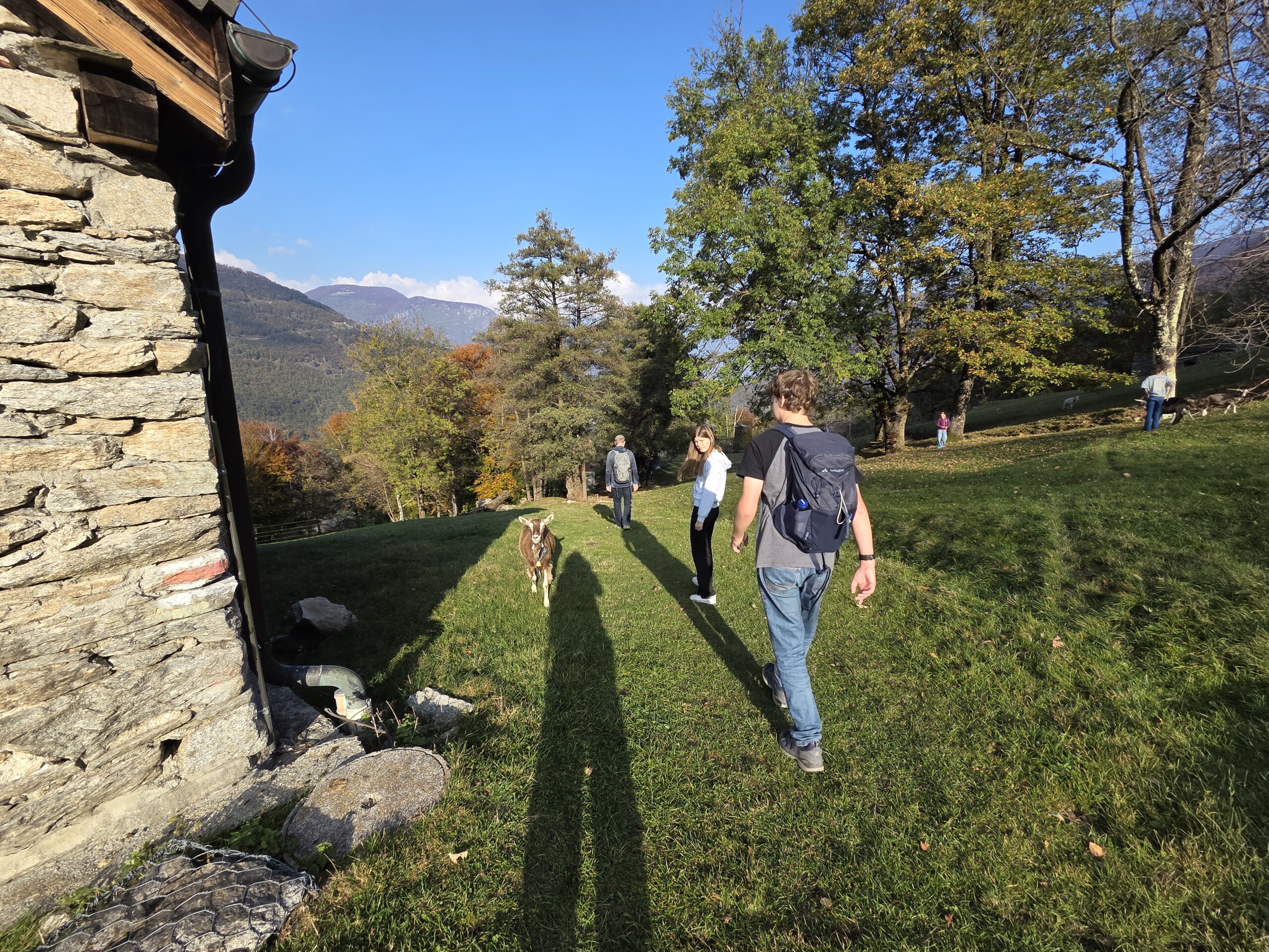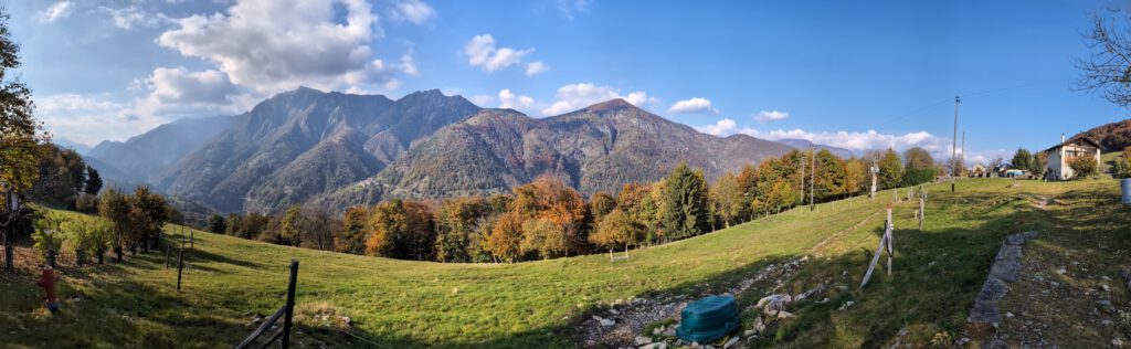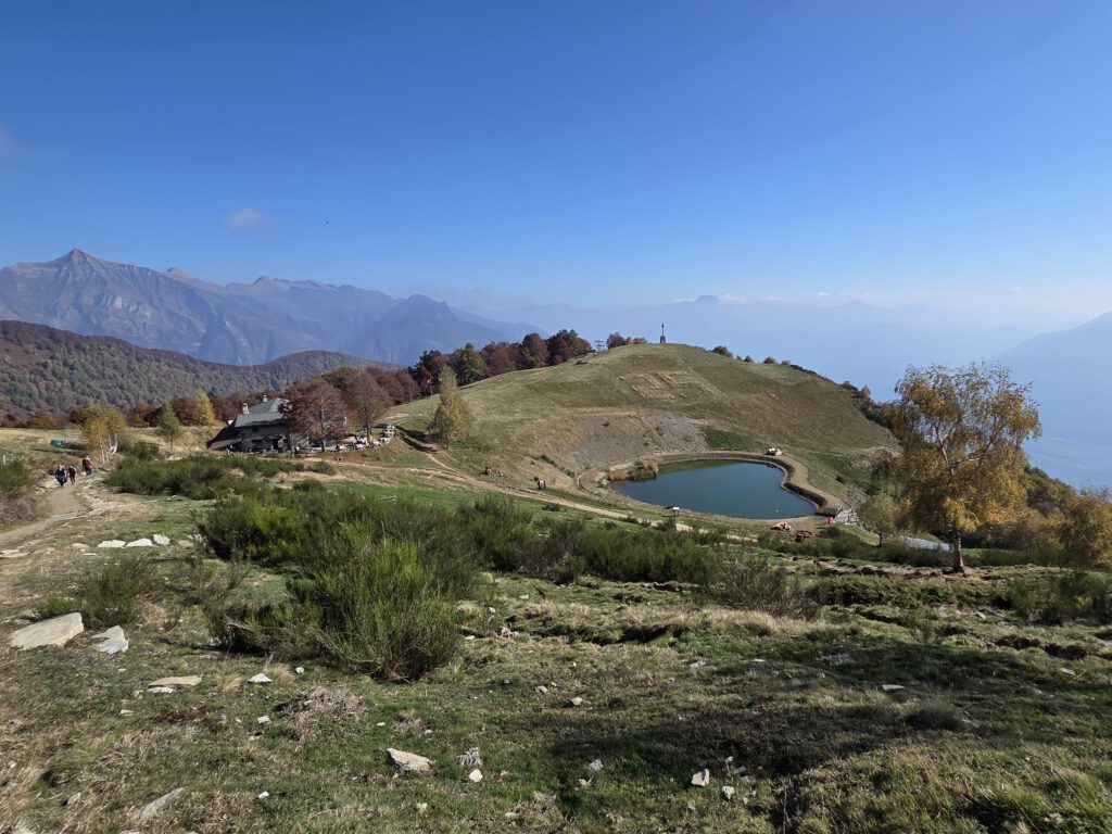 Was für einen Sicht! Gerald und Kilian würden am liebsten direkt auf den nächsten Gipfel weiterziehen, verschieben das aber auf einen anderen Urlaub. Wir genießen lange den Blick auf der Plattform, dann geht es noch für eine kleine Einkehr auf die Alm (Würstel mit Pommes, eine kleine Polenta, zwei kleine Bier). Der Rückweg führt erst durch einen Herbstwald steinig bergab, dann wird es wieder gemütlich. Wir nehmen die Bahn von Cardada zurück, inzwischen ist deutlich weniger los.