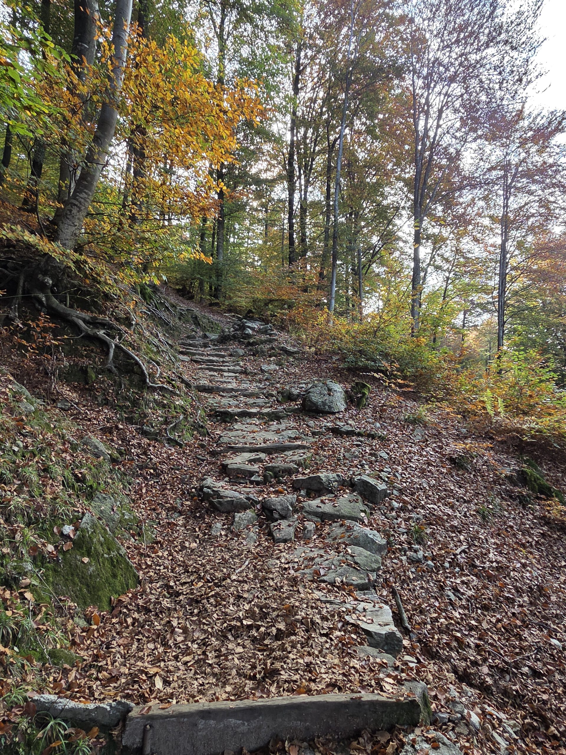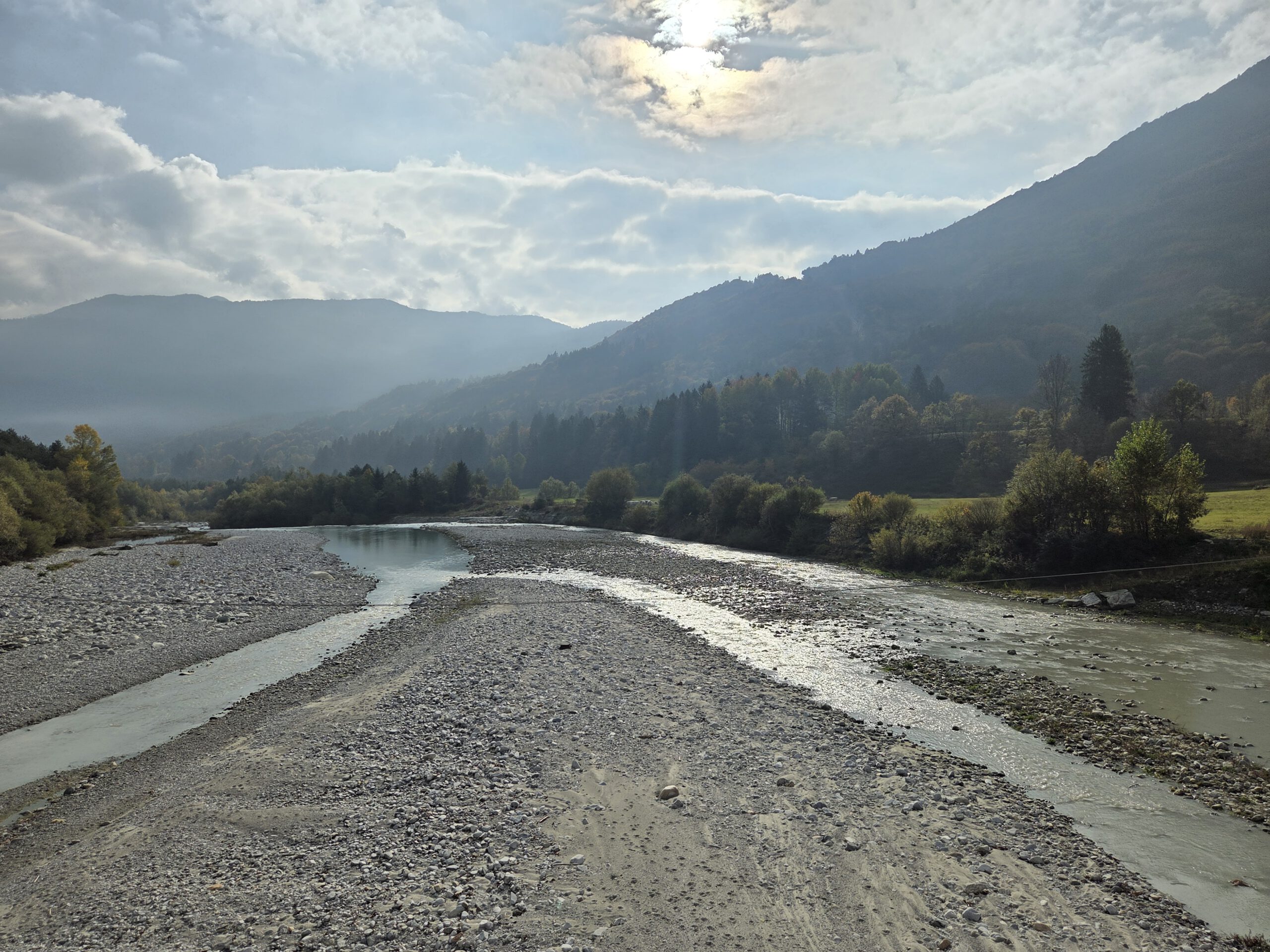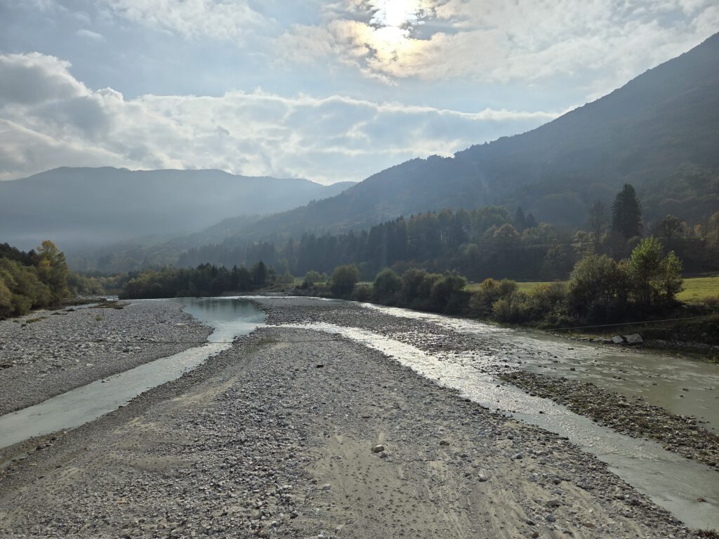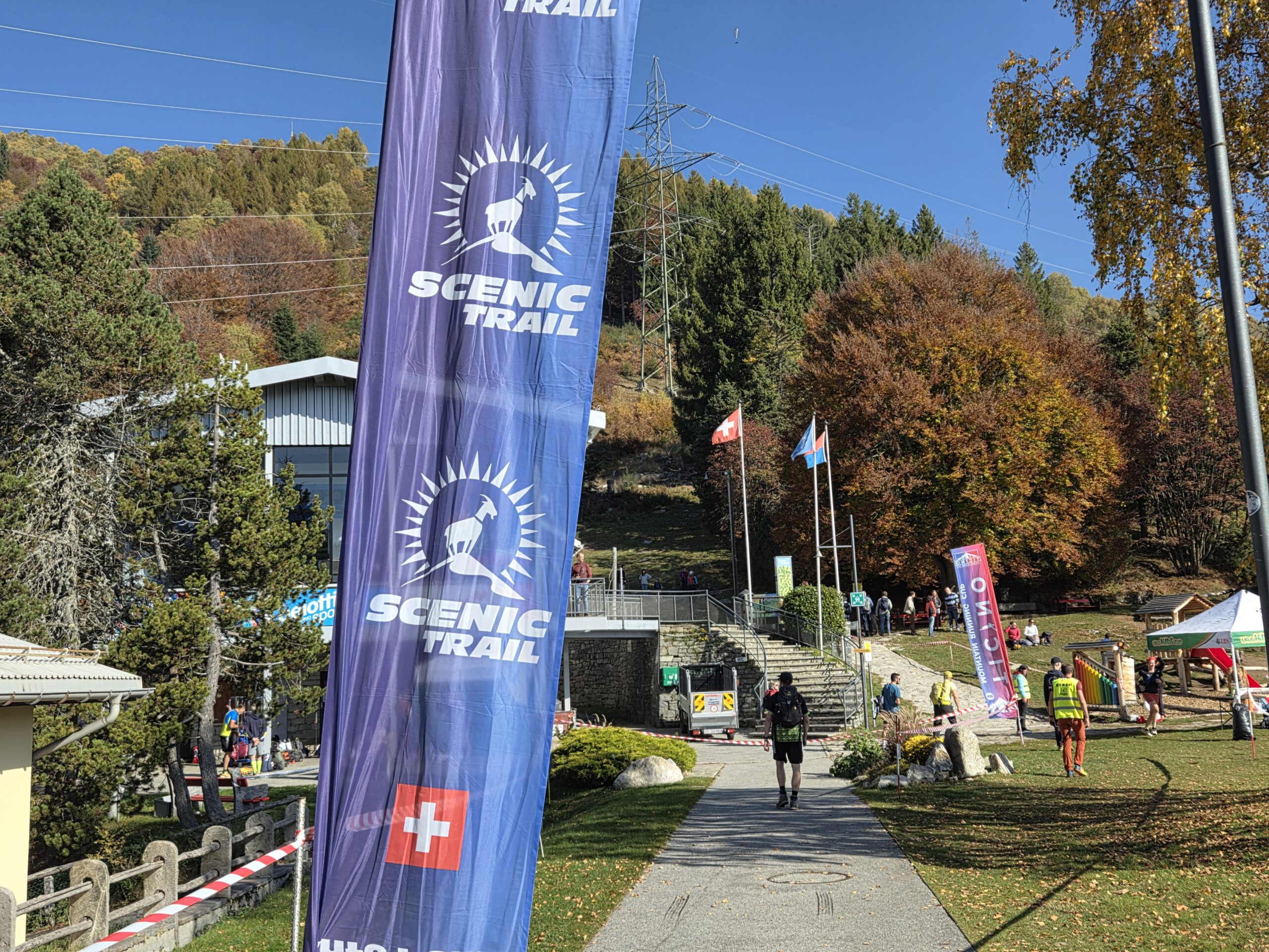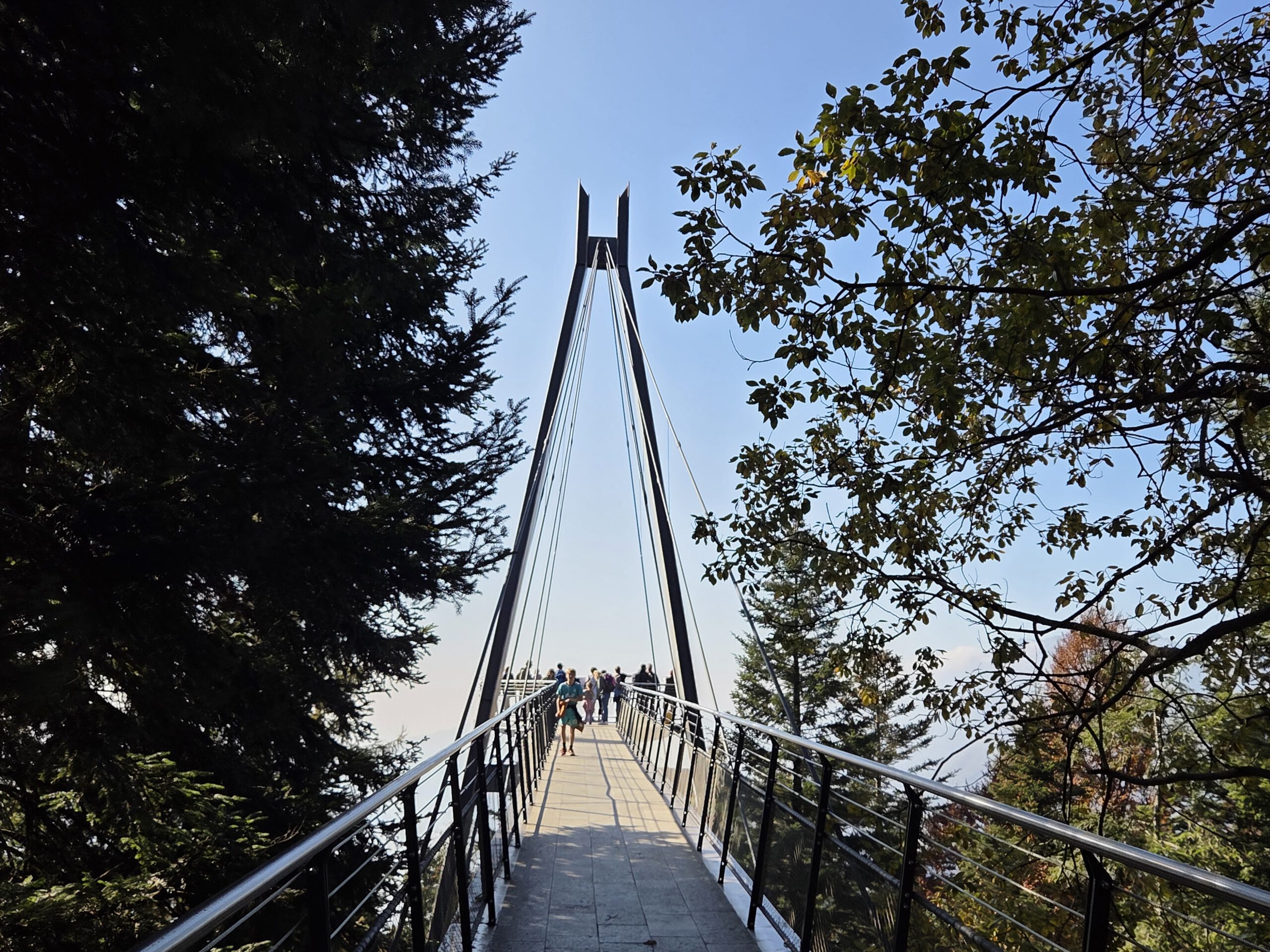 Was für einen Sicht! Gerald und Kilian würden am liebsten direkt auf den nächsten Gipfel weiterziehen, verschieben das aber auf einen anderen Urlaub. Wir genießen lange den Blick auf der Plattform, dann geht es noch für eine kleine Einkehr auf die Alm (Würstel mit Pommes, eine kleine Polenta, zwei kleine Bier). Der Rückweg führt erst durch einen Herbstwald steinig bergab, dann wird es wieder gemütlich. Wir nehmen die Bahn von Cardada zurück, inzwischen ist deutlich weniger los.