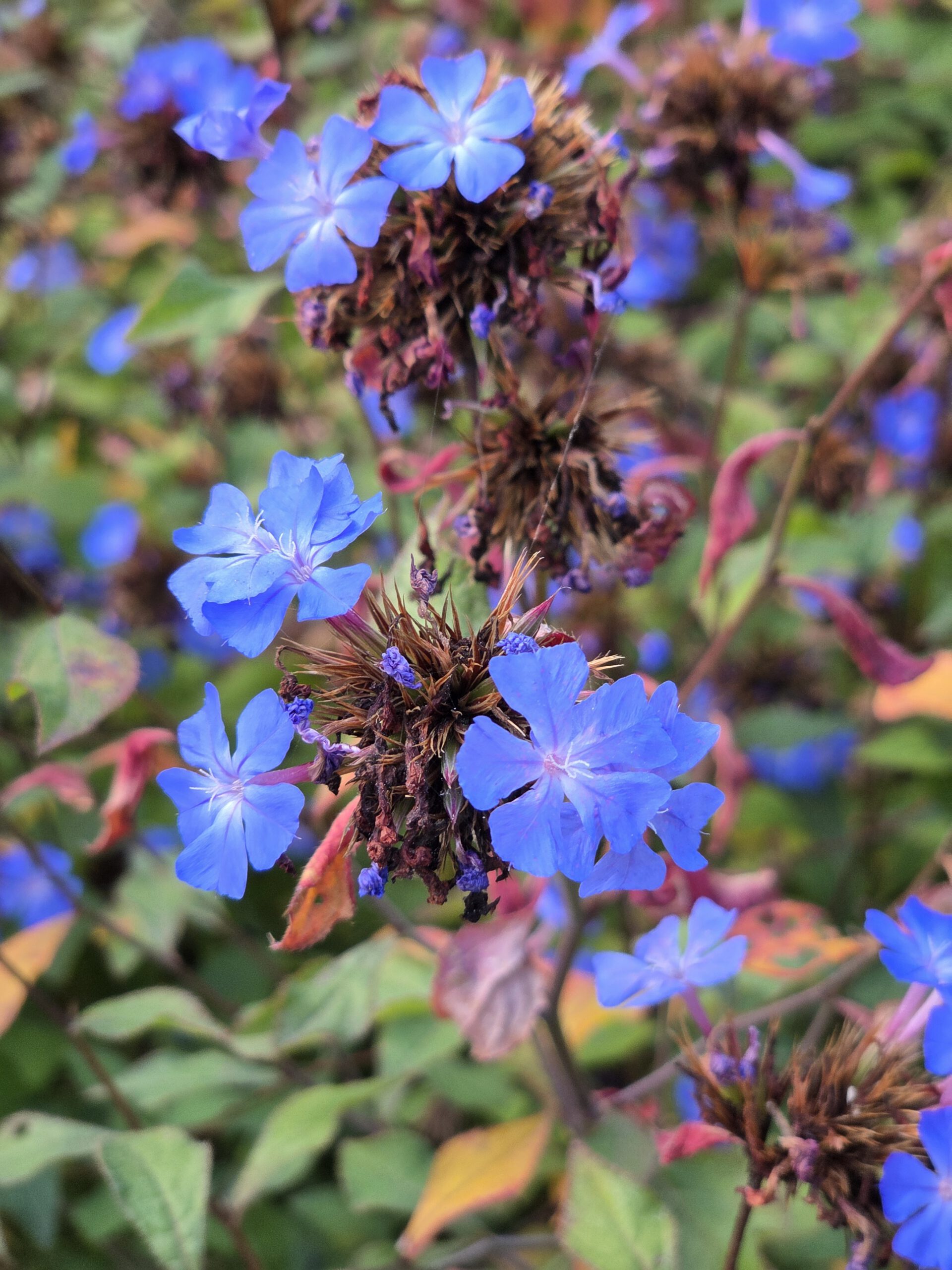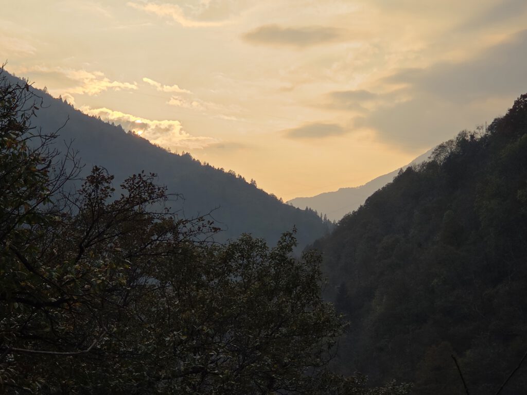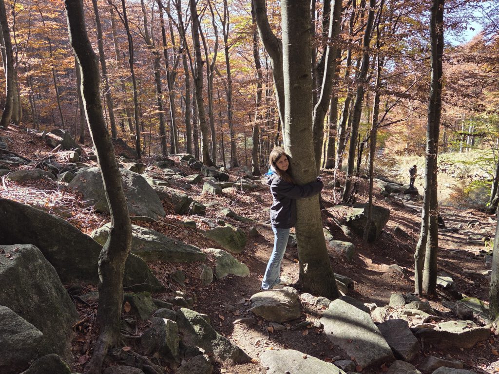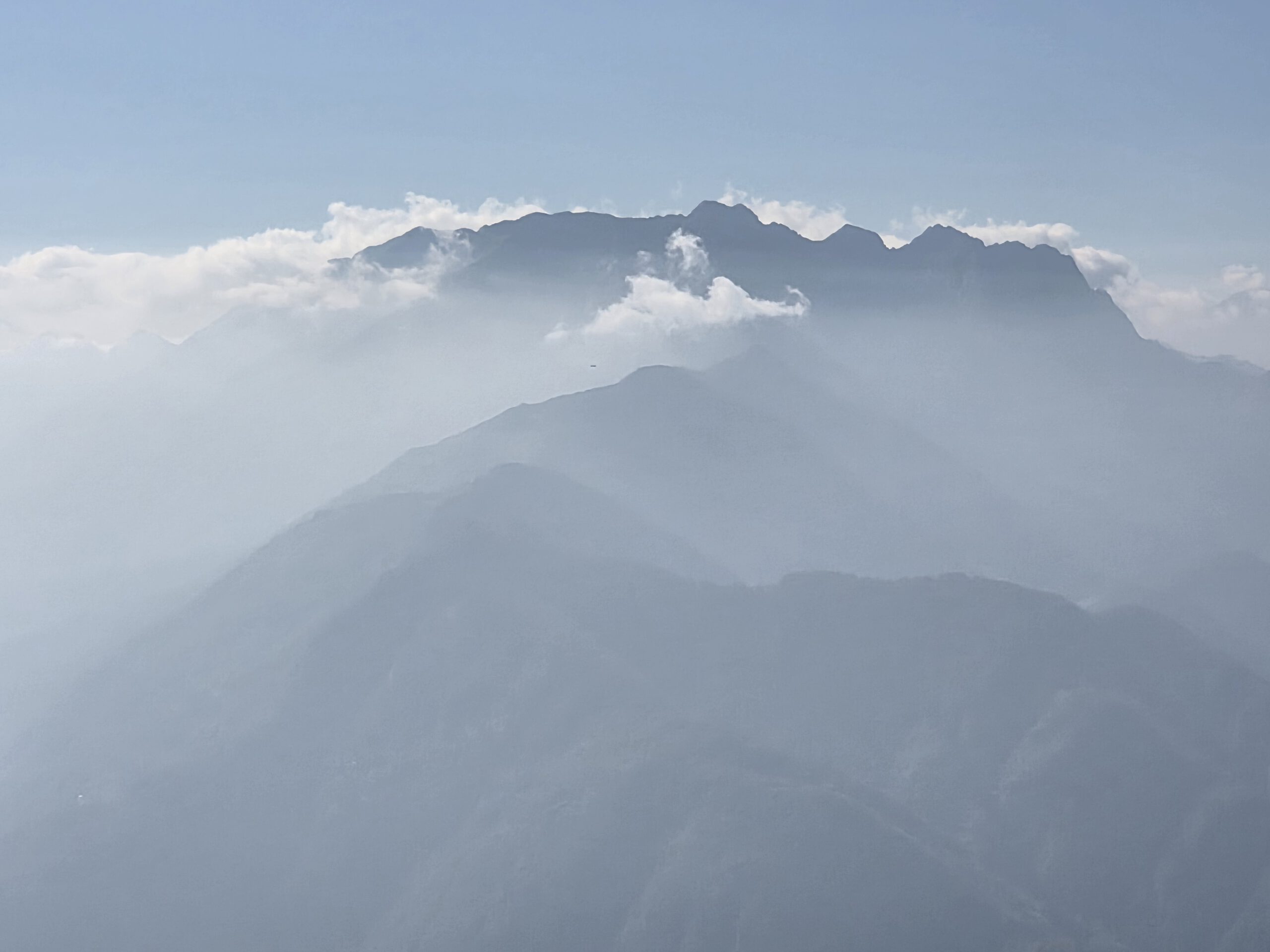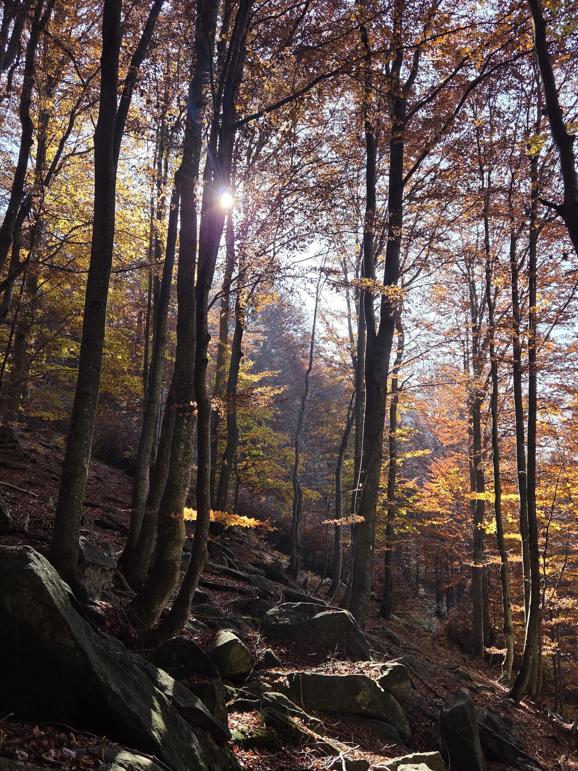 Was für einen Sicht! Gerald und Kilian würden am liebsten direkt auf den nächsten Gipfel weiterziehen, verschieben das aber auf einen anderen Urlaub. Wir genießen lange den Blick auf der Plattform, dann geht es noch für eine kleine Einkehr auf die Alm (Würstel mit Pommes, eine kleine Polenta, zwei kleine Bier). Der Rückweg führt erst durch einen Herbstwald steinig bergab, dann wird es wieder gemütlich. Wir nehmen die Bahn von Cardada zurück, inzwischen ist deutlich weniger los.