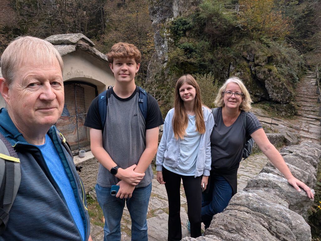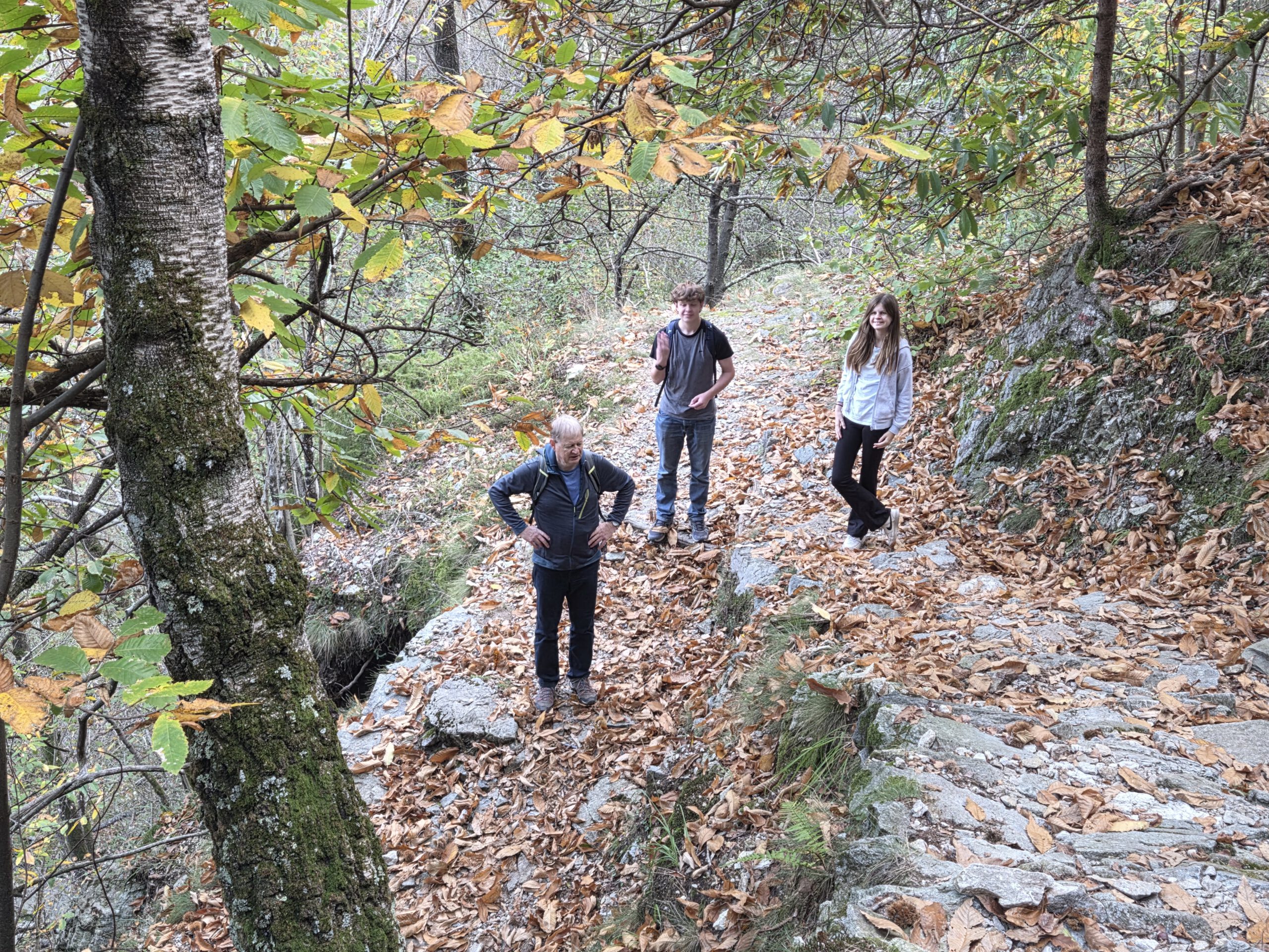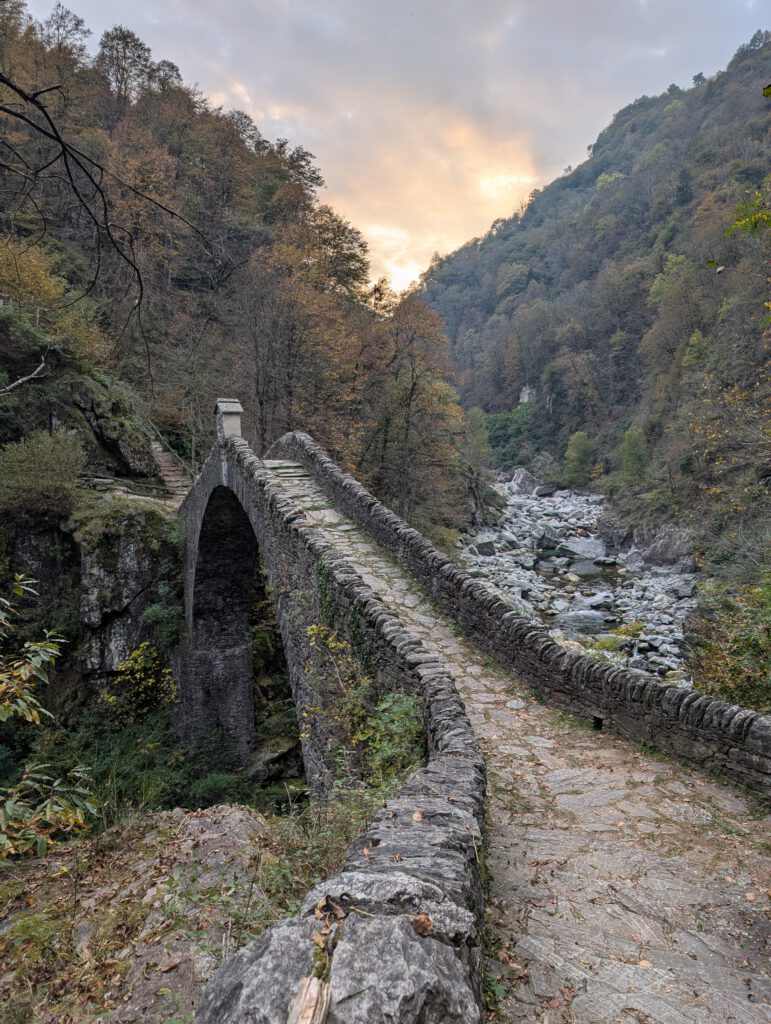 Wir kommen im Weiler Rasa an, einer der letzten autofreien Orte der Schweiz. Ein ruhiges Idyll, durch das wir eine Runde bummeln. Danach wollen wir nach Intragna wandern und wieder mit dem Zug nach Locarno zurück. Und in Schweizer Wanderblog hieß es auch, eine absolut familientaugliche kleine Wanderung ... Dabei überliest man leicht, dass es sehr zügig knackige 600 Meter nach unten geht. Sehr steil, dass auf den Felsen eine zentimeterdicke Schicht an Maronenlaub liegt, macht es nicht leichter. Das braucht Zeit und strengt alle vier ziemlich an, vor allem die zwei, die nicht als Bergziegen auf die Welt gekommen sind. Fast wollen wir schon aufgeben und eine Station früher zur Bahn - aber dann wird der Weg noch schön und sehr angenehm. Bis zur steinernen Brücke, als es noch einmal steil bergauf geht ... Um 18.30 Uhr sitzen wir komplett geschafft am Bahnhof in Intragna und warten auf den Zug zurück, der um 18.58 Uhr kommt. Die App auf dem Handy jubelt: 20.000 Schritte!