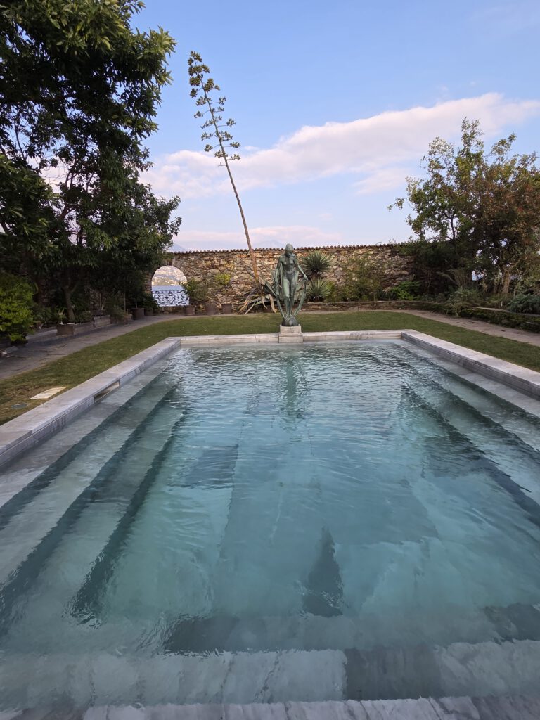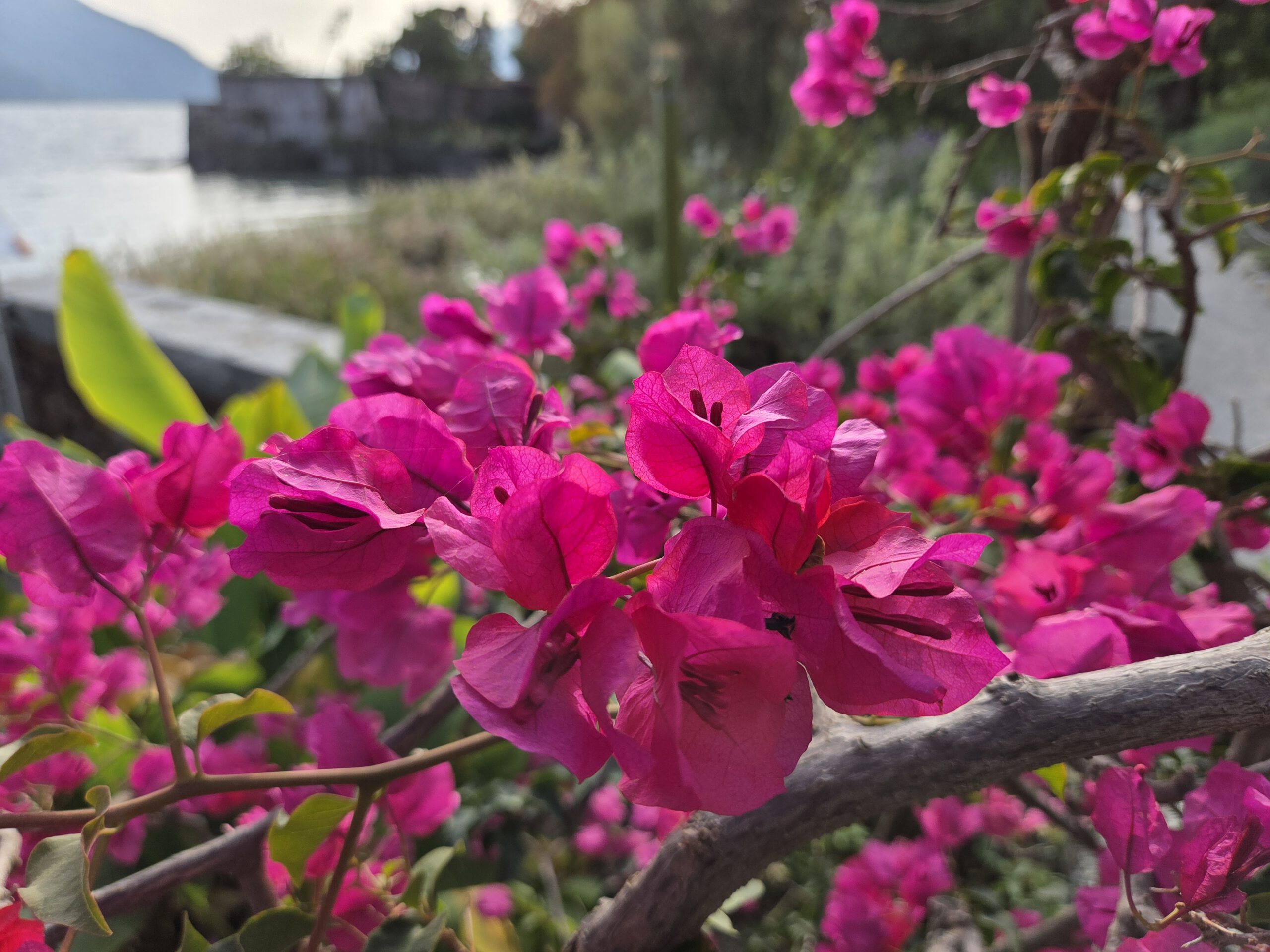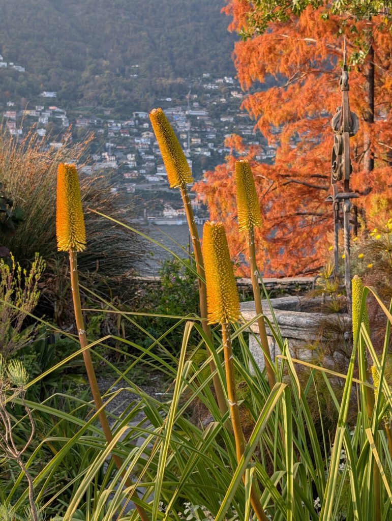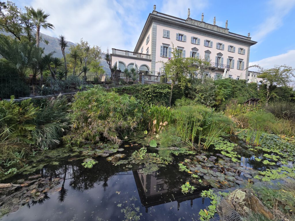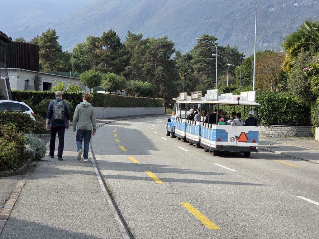 Gegen 12 Uhr ziehen wir los, in den Nachbarort Ascona, natürlich zu Fuß. Das geht deshalb so gut, weil wir am grünen Ortsrand von Locarno wohnen und von dort aus eine Fußgängerbrücke über das kleine Flußdelta führt. Der Weg durchs Grüne, die überall sprießenden Palmen und der gerade ruhige Fluss würden nicht vermuten lassen, dass wir uns zwischen zwei mondänen Seeorten bewegen. Das ist natürlich sehr angenehm. Allerdings kreuzen wir natürlich den Golfplatz, den Yachtclub und den Beachclub von Ascona und kommen nicht so leicht ans Wasser. Das Touribähnchen zuckelt wieder vorbei.