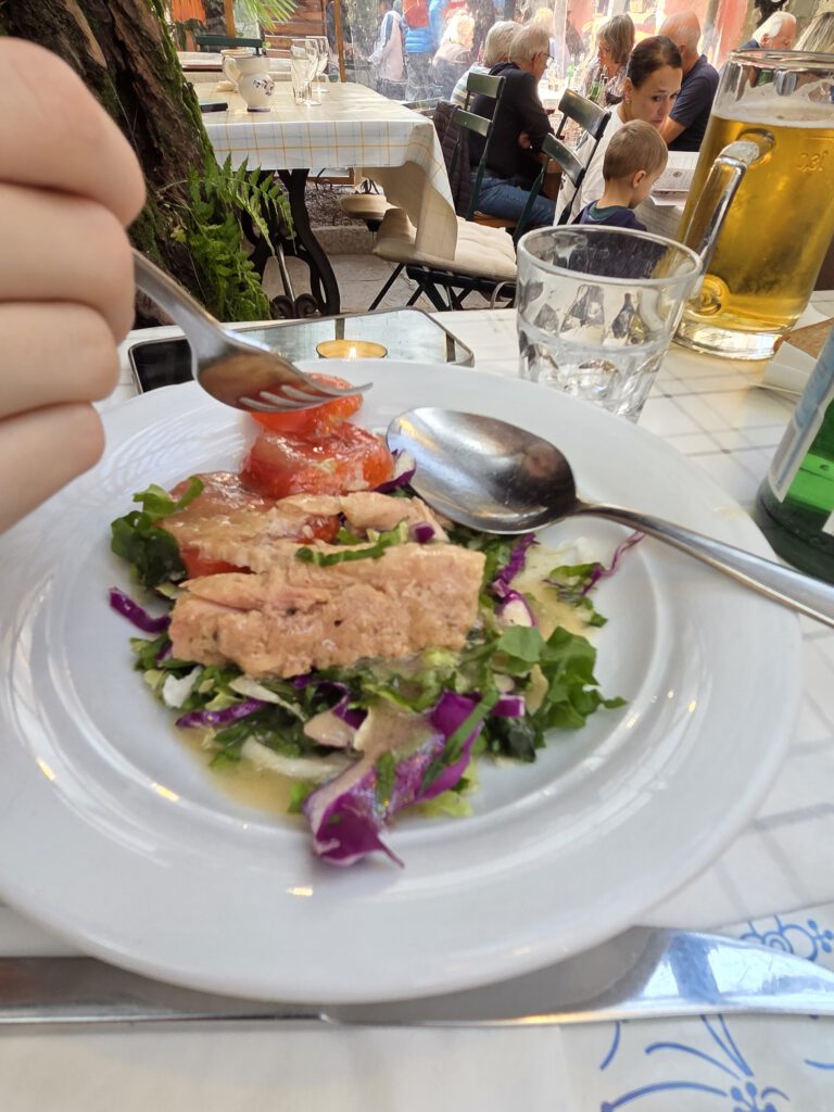 Danach geht es am See entlang zurück in die Ferienwohnung, den Auszug vorbereiten. Und zum Abschluss sind wir noch einmal im Ristorante am Campingplatz. Schön wars.