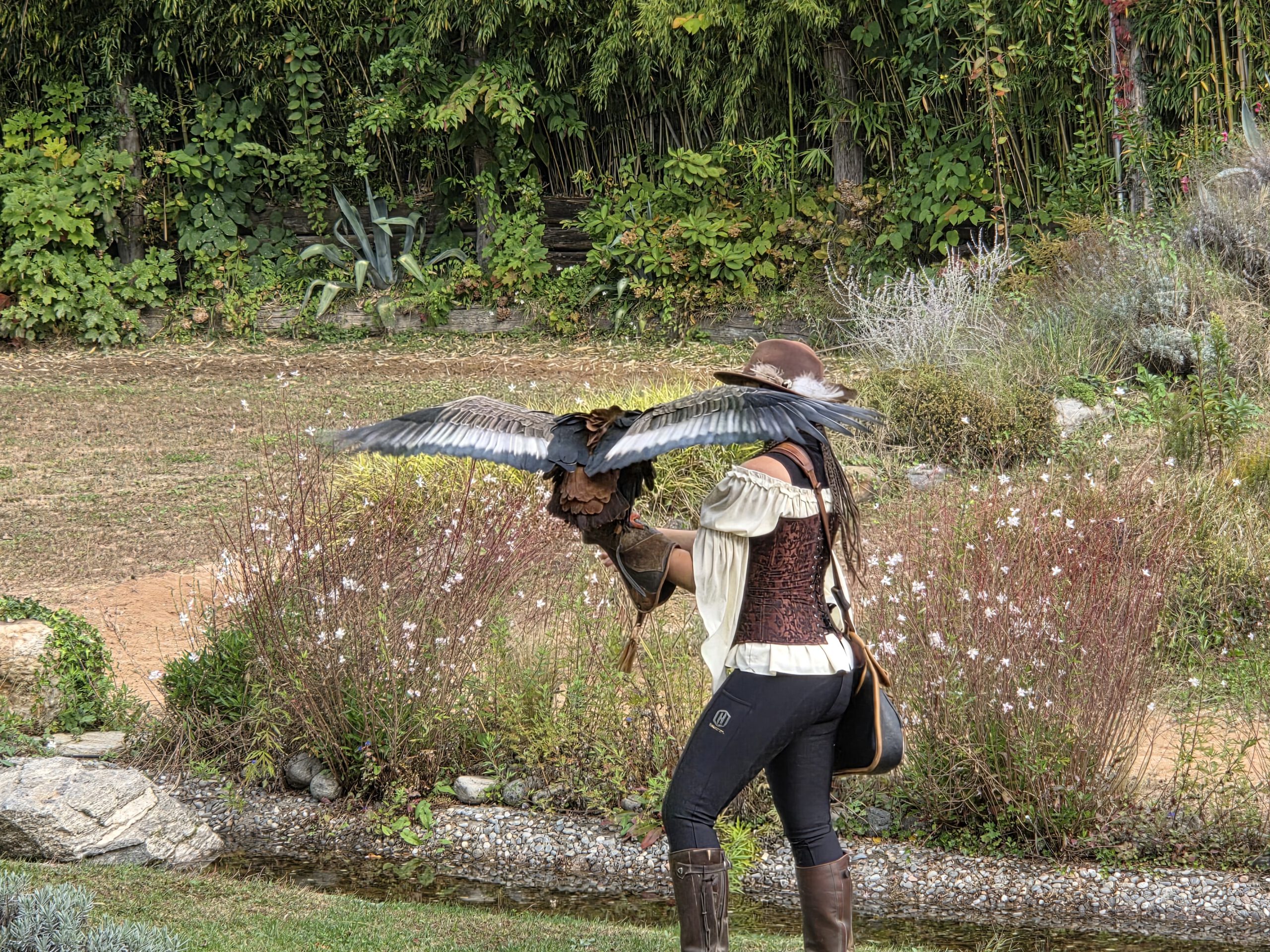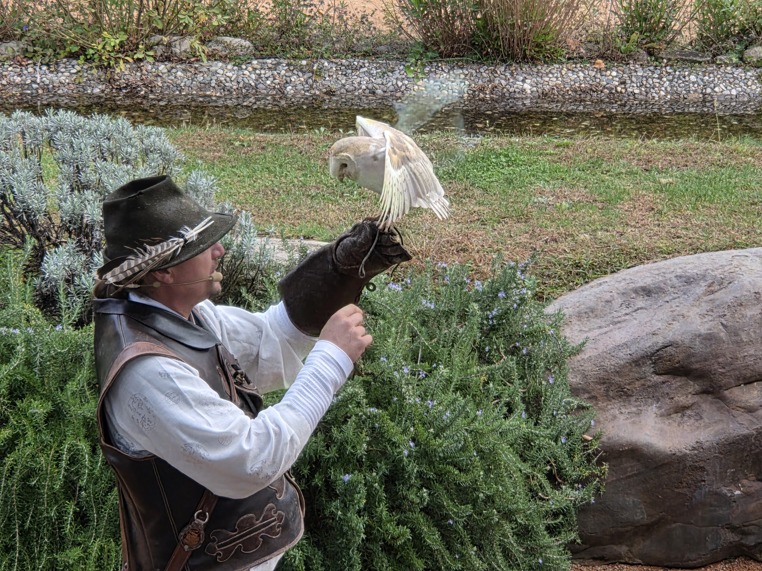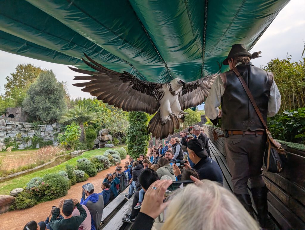 600 Sitzplätze gäbe es, davon sind heute zirka 100 besetzt. Wir haben uns in der letzten Reihe niedergelassen, eine zufällige, aber sehr gute Wahl. Denn eine knappe Stunde lang fliegen uns alle Stars der Falknerei sehr knapp über den Kopf oder sind samt Falkner ganz nah. Zu unseren Lieblingen, die wir bisher noch nicht in einer Falknerei gesehen hatten, gehören der Gaukler mit seiner roten Federpracht, der Sekretär, der gerne auch einfach mal mit seinen langen Beinen läuft und der Hornrabe. Faszinierend: Die majestätischen Vögel fliegen danach zur ihrer Klappe zu ihrer Voliere, wie daheim der Wellensittich in seinen Käfig. Danach bummeln wir noch eine Runde durch das Gelände, dann geht es für ein Kaffeepäuschen zurück.