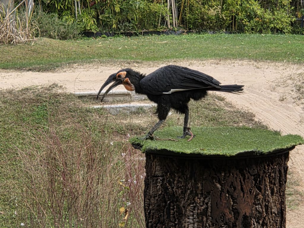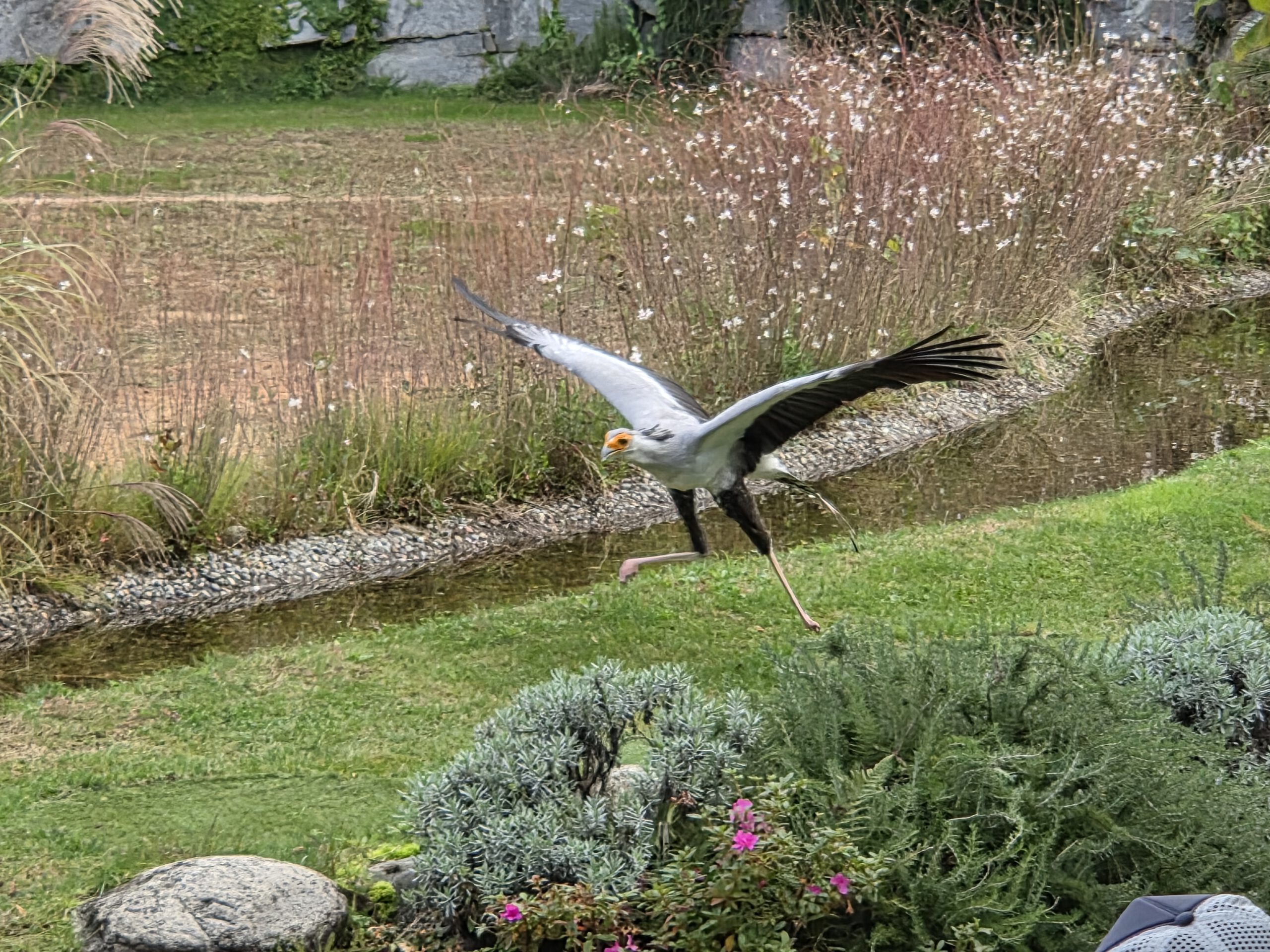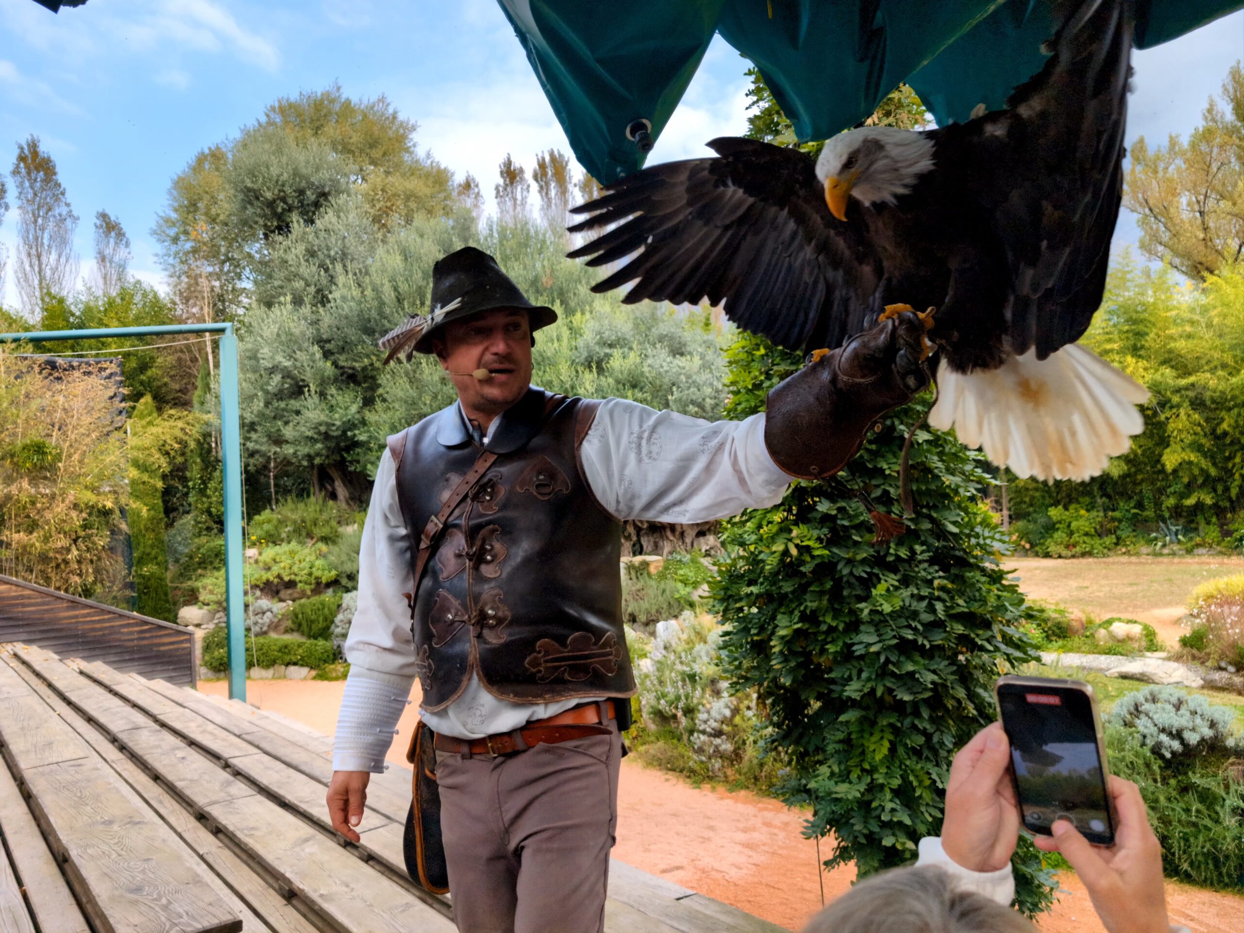 600 Sitzplätze gäbe es, davon sind heute zirka 100 besetzt. Wir haben uns in der letzten Reihe niedergelassen, eine zufällige, aber sehr gute Wahl. Denn eine knappe Stunde lang fliegen uns alle Stars der Falknerei sehr knapp über den Kopf oder sind samt Falkner ganz nah. Zu unseren Lieblingen, die wir bisher noch nicht in einer Falknerei gesehen hatten, gehören der Gaukler mit seiner roten Federpracht, der Sekretär, der gerne auch einfach mal mit seinen langen Beinen läuft und der Hornrabe. Faszinierend: Die majestätischen Vögel fliegen danach zur ihrer Klappe zu ihrer Voliere, wie daheim der Wellensittich in seinen Käfig. Danach bummeln wir noch eine Runde durch das Gelände, dann geht es für ein Kaffeepäuschen zurück.