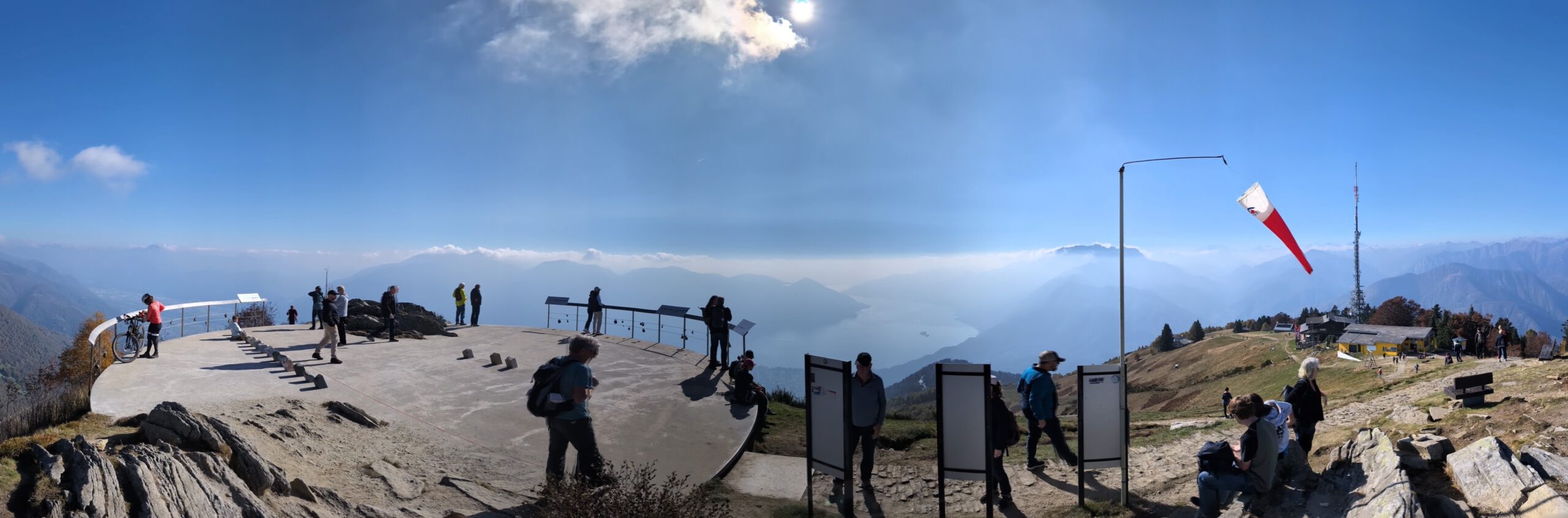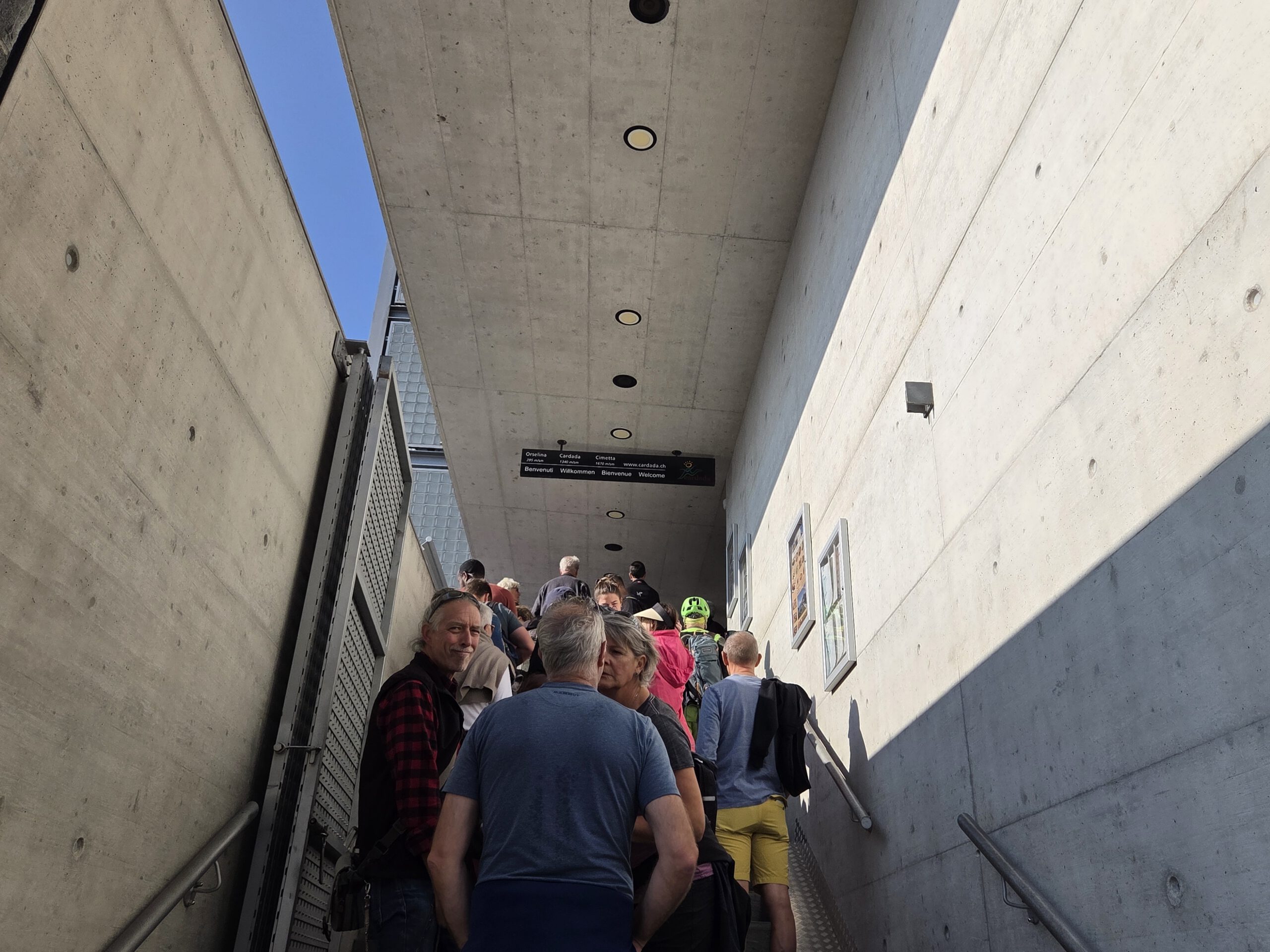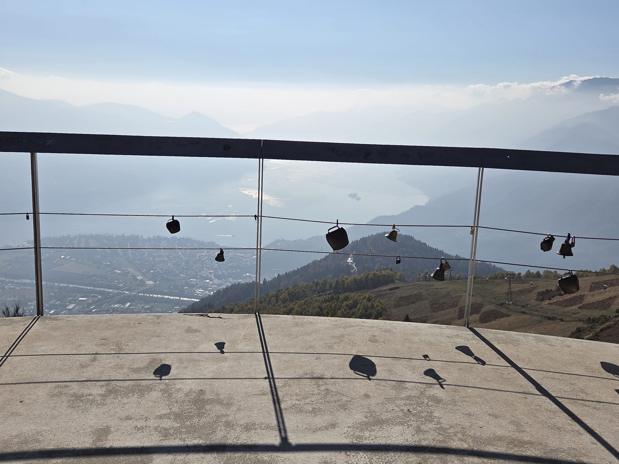 Es geht also direkt weiter zur "Luftseilbahn" zum Aussichtspunkt Cardada auf etwa 1330 Metern Höhe. Wieder Schlange stehen, zusammen mit vier Hunden. Wobei der chinesische Nackthund, der irgendwie trotzdem Fransen an Kopf und Knöcheln hat, vom Frauchen getragen wird. Seilbahn und Stationen wurden von Mario Botta entworfen, einen großen Architekten aus dem Tessin. Am Aussichtspunkt angekommen schauen wir uns kurz um, gehen natürlich zur Aussichtsplattform (Design: Botta) und werfen einen Blick auf den Lago, Locarno, Ascona und den Beginn des Centovalli. Die Sonne strahlt.