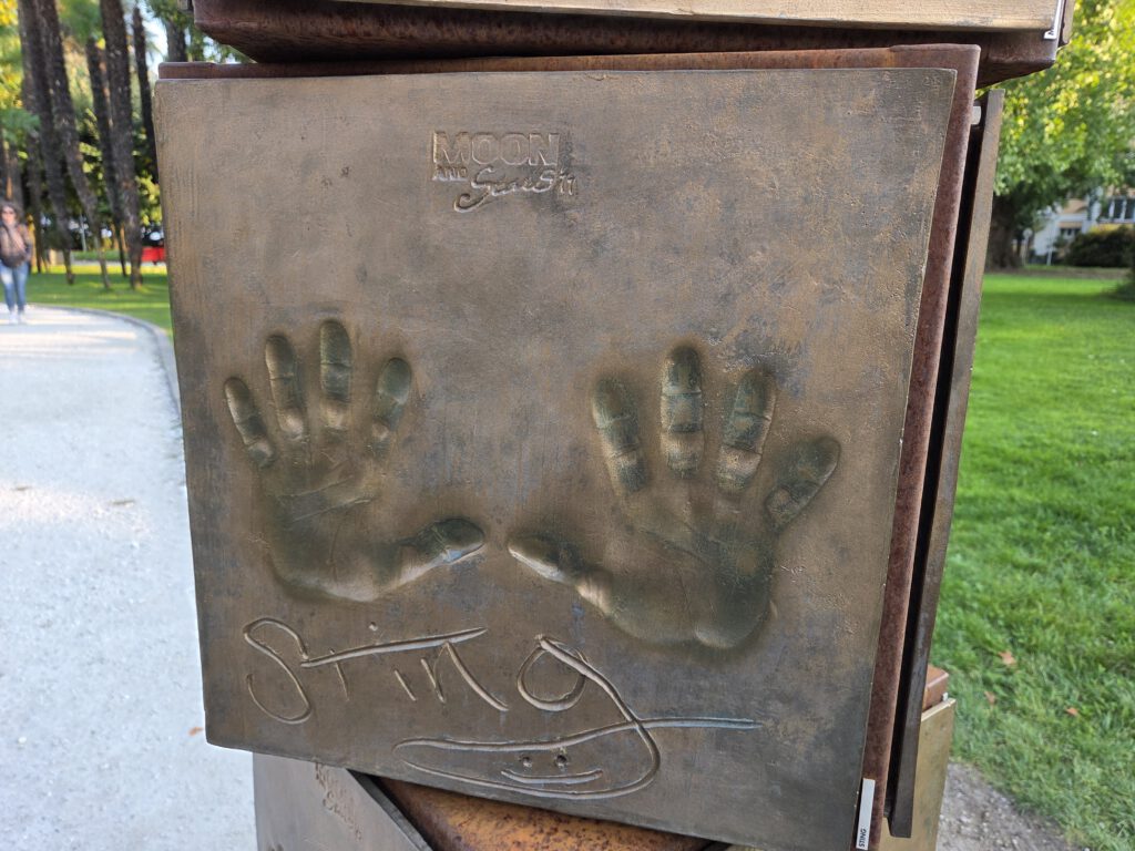 Im Ort genießen wir noch bei einem Eis die Sonne und bummeln durch den "Walk of Fame". Hier haben Musiker des Moon and Star Festivals ihre Handabdrücke hinterlassen, darunter Größen wie Sting, R.EM, die Scorpions, Zucchero, Eros Ramazzotti, die Toten Hosen ... Dann müssen wir zügig zum Migros, um Frühstück für Sonntag und noch etwas Verpflegung zu holen: Die Supermärkte haben nur bis 18.30 Uhr geöffnet, die Bäcker in den Supermärkte haben logischerweise am Sonntag zu.