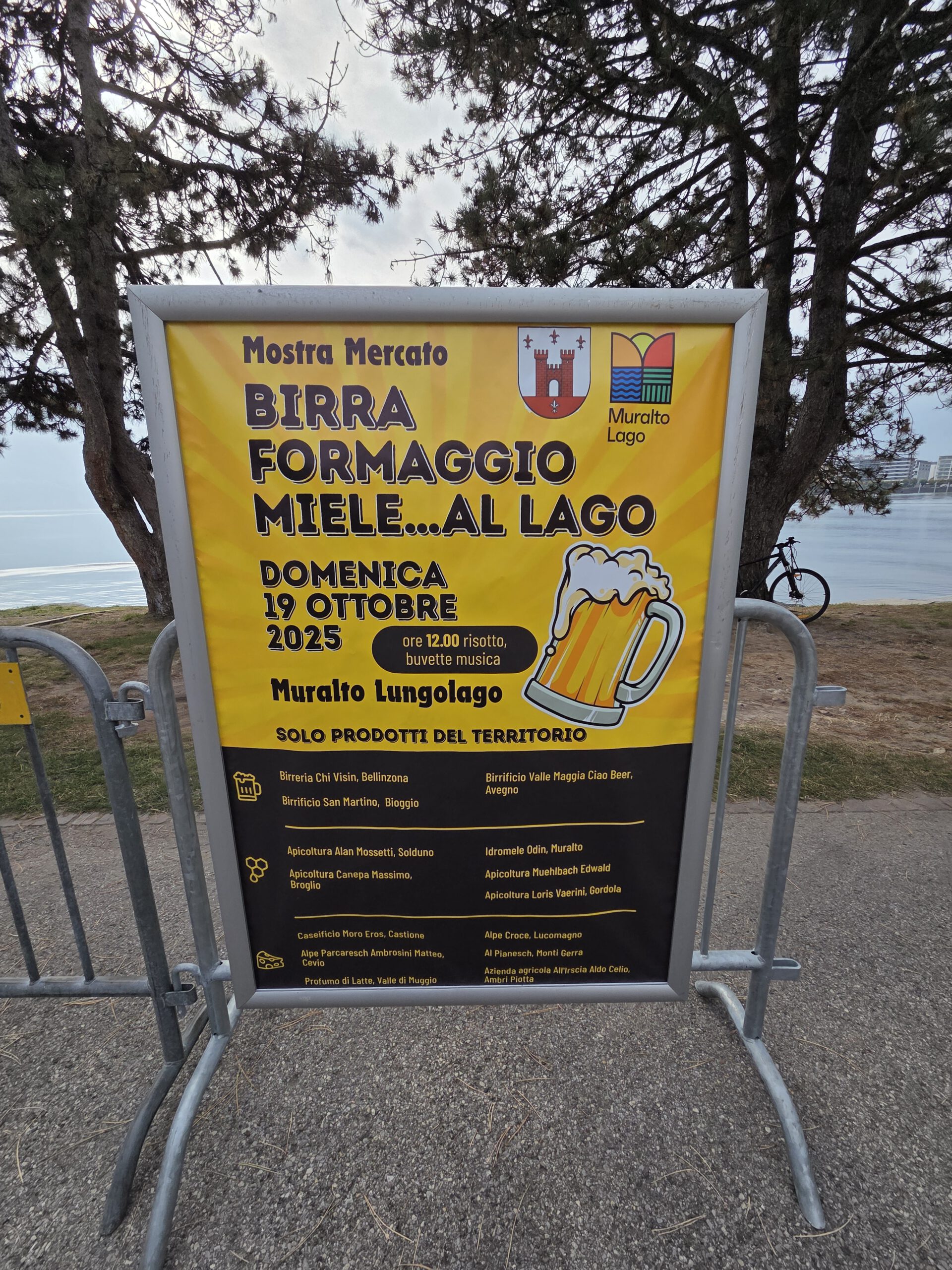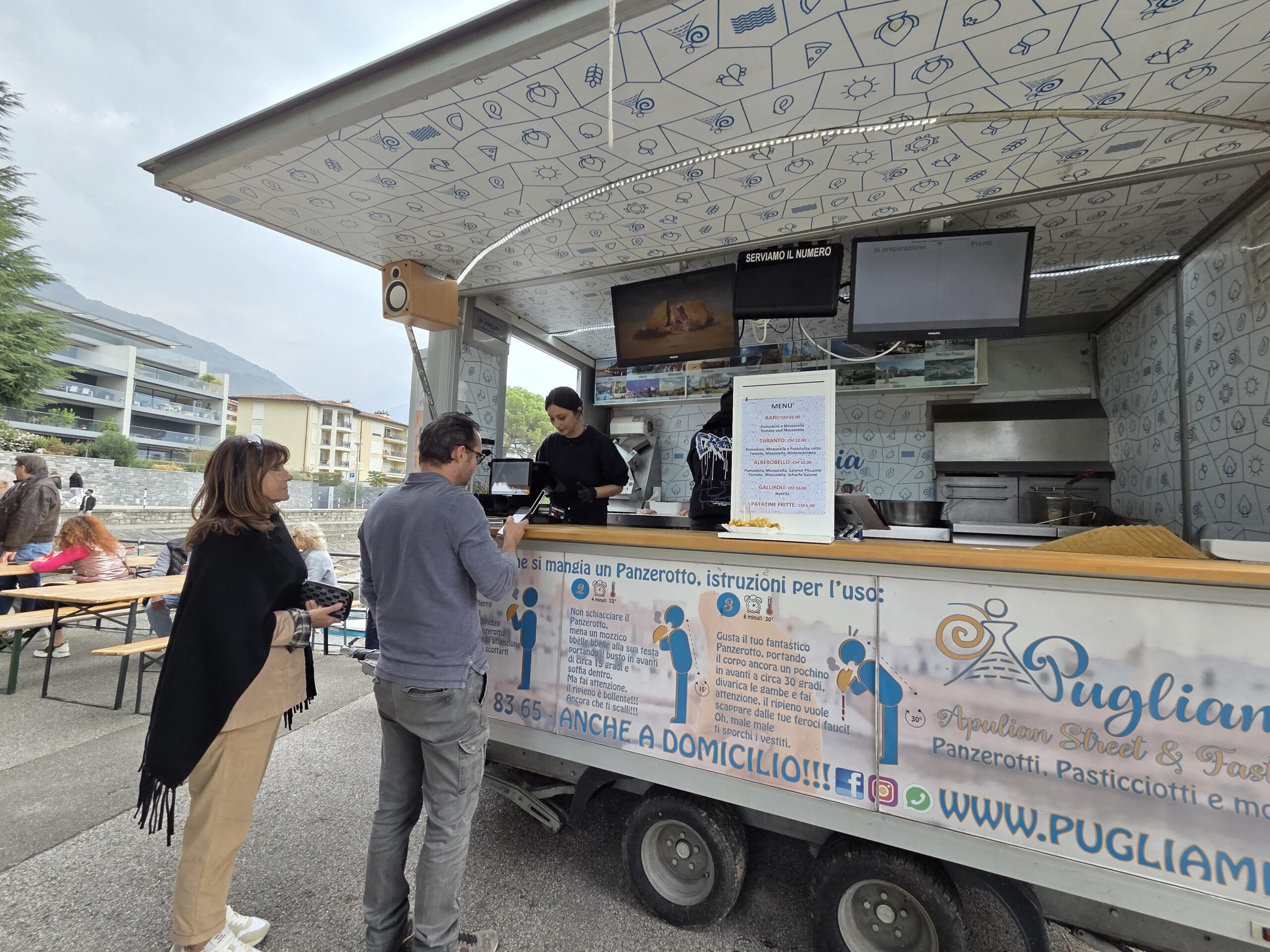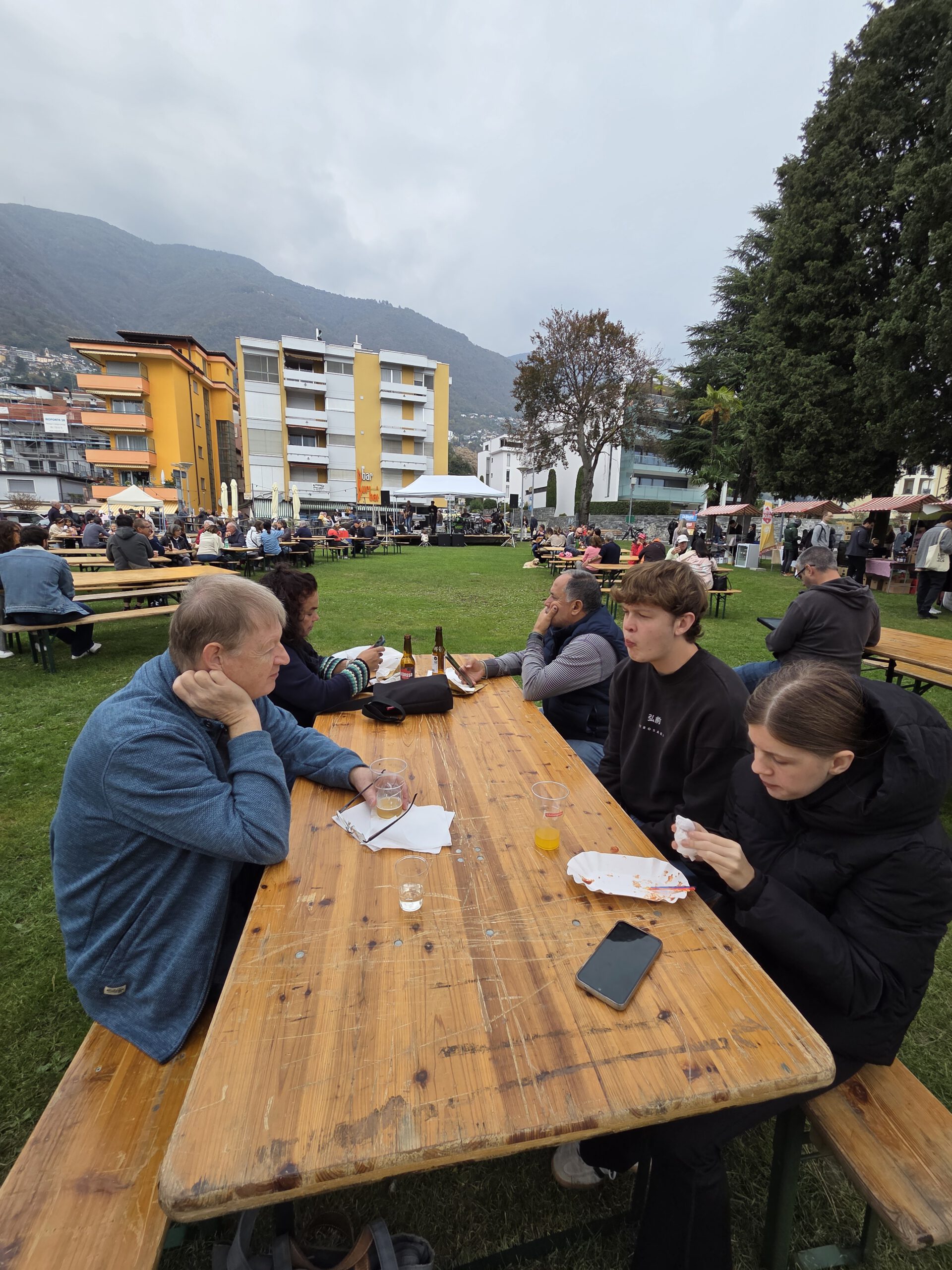 Als wir Richtung Seeufer bummeln hören wir erst einen Schlagersänger aufspielen. Doch dann wird es, quasi von einer kleinen Bühne aus als Konkurrenz, rockig: "Bier, Käse, Honig - am Meer". Viele Stände mit Honig und Käse, einige Stände mit lokalem Bier, zwei Stände mit Wein und ein Stand mit Streetfood aus Apulien, gefüllten Teigtaschen. Und da sind sie dann auch, die Locarner, viele davon gleich mit einer ganzen Flasche Rotwein auf dem Biertisch. Die Band rockt sich durch die größten Hits der letzten Jahrzehnte, manche Besucher tanzen sogar. Idealer Ort für eine kleine Mittagsrast.