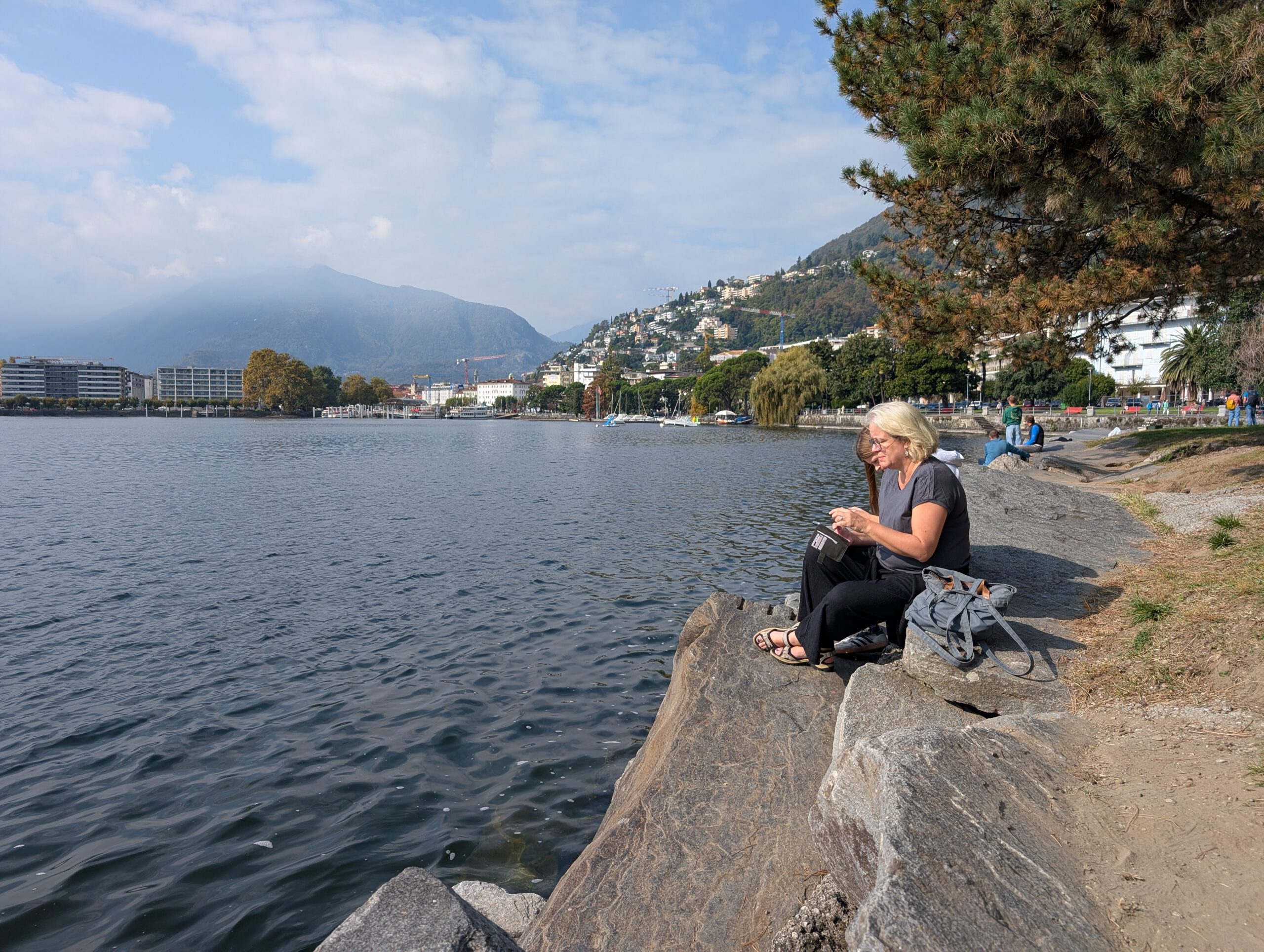 Die Uferpromenade ist sehr ansehnlich, ein altes Örtchen am Wasser, das neben Tourismus auch mit einem Jazzfestival aufwarten kann.Darauf weisen Bilder auf vielen Häusern hin. Was uns als echter Tessin-Erfahrung noch fehlt, ist der Besuch in einem Grotto, einem der alten Lokale, mit rustikalen Holztischen, Barzahlung und - was wir erst lernen, als wir uns im Grotto Baldoria niederlassen - pro Tag genau einem Menu, das jedem Gast serviert wird. Also gibt es Salami und Brot, Salat mit Thunfisch, Gulasch mit Nudeln, Käse, Kuchen, Espresso und auf Wunsch auch Schnaps. Speise pro Person 20 Franken plus Getränke, also wirklich günstig. An Ambiente gibt es viel zu gucken, vom Nachbarhunde bis zu den frechen Spatzen. Gerald und Kilian sitzen kippelig, da auch eine Erhöhung um einen Baum für Tische genutzt wird.