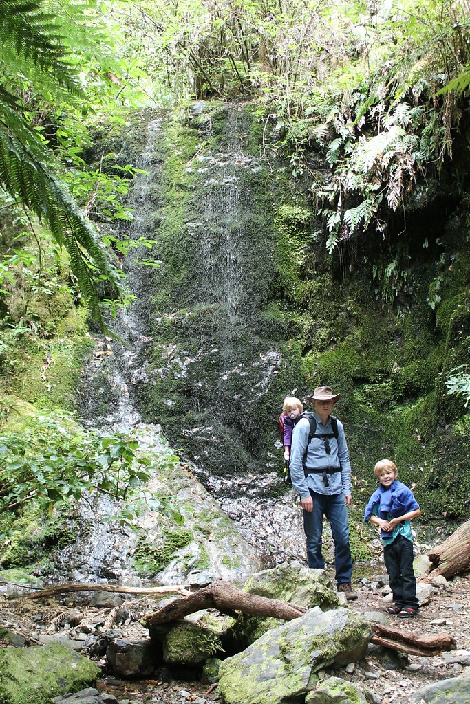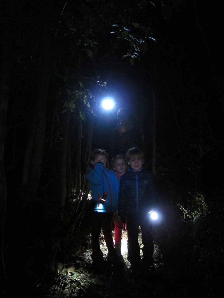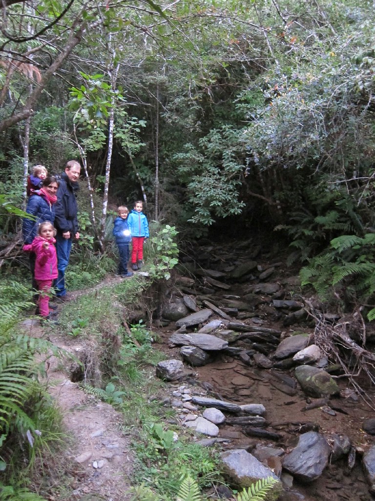 Dann heißt es. Wanderschuhe schnüren, Stirnlampen auf und Schatzkarte in die Hand nehmen. Noch vor Einbruch der Dunkelheit wollen wir den rot markierten Weg zum Schatz finden, der quer über die Schafswiese und über diverse Felder führt. Dann geht es durch ein Stück Regenwald, am Bach entlang, ziemlich schmal, ab und an glitschig, manchmal abschüssig, bis man zu einem Wasserfall gelangt. Wir sind zu acht: An Kerstins Pizzaofen hatten wir Daniela (Architektin), Jens (Managerberater). Lilo (6) und Romy (4) aus Bremen kennengelernt (dreineinhalb Monate Australien und Neuseeland, dazu eine Woche Chillen in Vietnam) und uns spontan zu einer Schatzkartengruppe zusammengeschlossen.