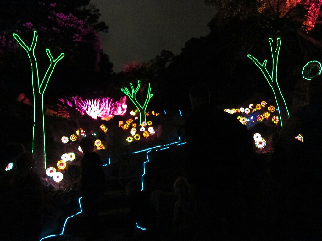Nach einem weiteren Kaffeestopp in der Bücherei und einem Bummel durch drei der unzähligen Outdoorläden in der Innenstadt gehen wir kurz zurück zum Camper und rüsten uns für den Abend, Denn wie es der glückliche Zufall will, läuft gerade das New Zealand Festival. Dazu gehört auch ¨Power Plant¨, eine Licht/Sound Installation im Botanischen Garten, die kurz nach Einbruch der Dunkelheit beginnt. Vorher versuchen wir, in den Geschäftstraßen noch etwas zu essen zu erjagen - aber da bleiben nach 18 Uhr nur McDonalds oder Burger King. Nachdem die Kinder mit Chicken Nuggets, Pommes und Eis recht zufrieden und satt sind, geht es zur Cable Car de Hügel hinauf. Dort stellen wir erstaunliches fest: Das Cafe hat noch offen! Kann aber nur am Festival liegen. Wir holen uns Karten und vertreiben uns noch eine Dreiviertelstunde Wartezeit. Bis es endlich 20.30 Uhr ist und losgeht, haben sich tatsächlich schon etwa 200 Menschen versammelt. Aber wir stehen zufällig bei der ersten Tour in der ersten Reihe.