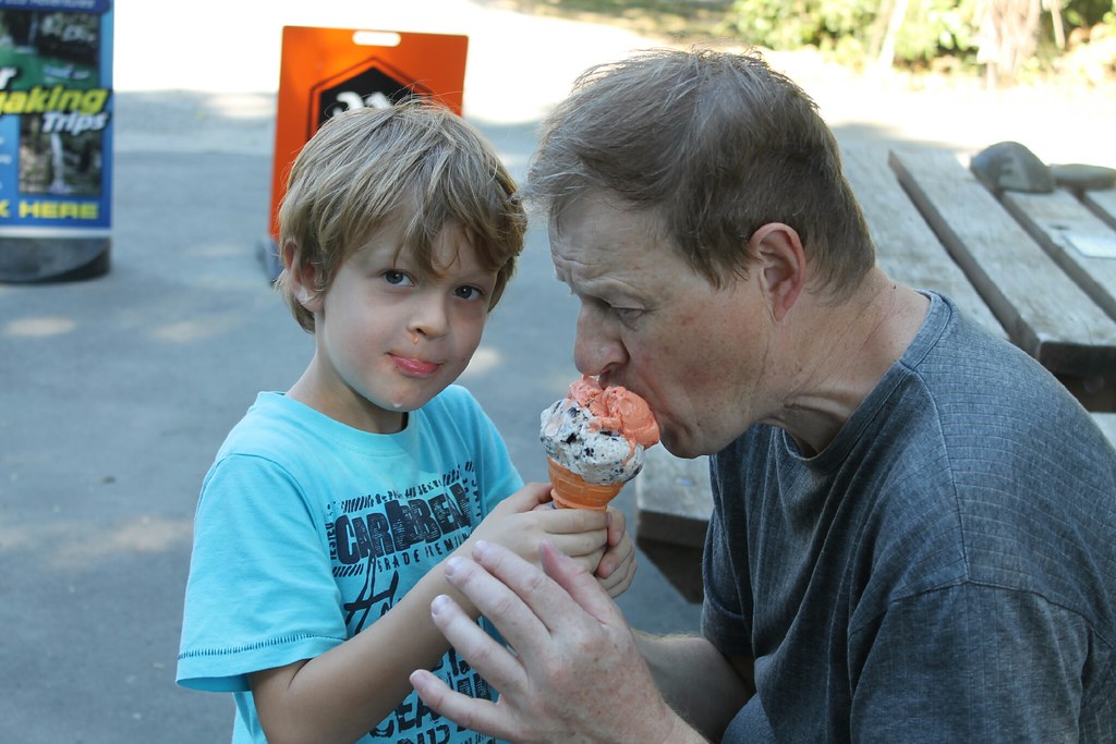 Oberhalb des Flusses geht es direkt neben dem Weg zwar steil runter, aber um Kilians Trittsicherheit müssen wir uns zum Glück ja nicht sorgen. Als Belohnung gibt es danach zwei Kugeln Eis.