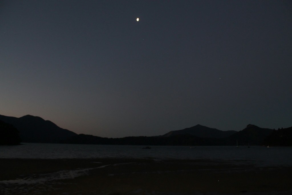 Auf dem Rückweg zum Camper legen wir noch einen Schaukelstopp am Hafen ein. Dort sehen wir schon zum wiederholten Mal Asiatinnen, die offensichtlich als Kinder nie geschaukelt sind, da sie die Bewegungen nicht verinnerlicht haben. Kilian bietet drei staunenden Touristinnen eine kurze Einlage im Turbo-Schaukeln, mit fliegendem Wechsel vom Sitzen zum Stehen. Als wir feststellen, dass im Hafenbecken wohl was zu sehen ist, eilen wir auch hin. Und bewundern einen sehr großen Seestern. Ein Pärchen zeigt uns aber dann auf dem Smartphonefoto, was die echte Sehenswürdigkeit war: Nur einen halben Meter vom Ufer entfernt war gerade ein Rochen unterwegs gewesen! Das kommt wohl garnicht so selten vor - und genau deshab sind auch garnicht selten Orcas direkt in der Bucht. Wir sind angemessen beeindruckt und blicken noch eine Weile in die Dämmerung, sehen aber nur eine schöne Hafenpromenade,