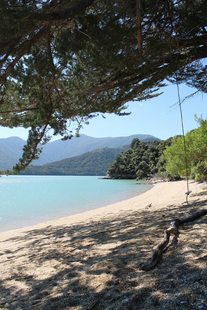 Ganz am Ende ein kurzer Stopp in einer Flußmündung und dann überlegen wir, dass eine Bucht für die Pause doch netter wäre. Also schaukeln wir zurück und halten an einer Minibucht. Aber: Mit Picknickbänken, einer Schaukel am Baum, türkisblauem Wasser und Sandstrand.