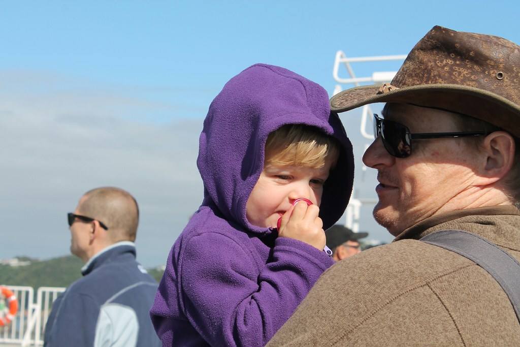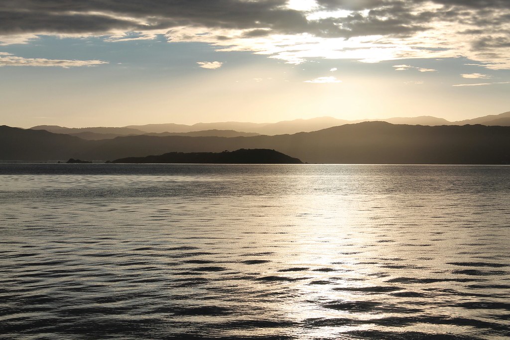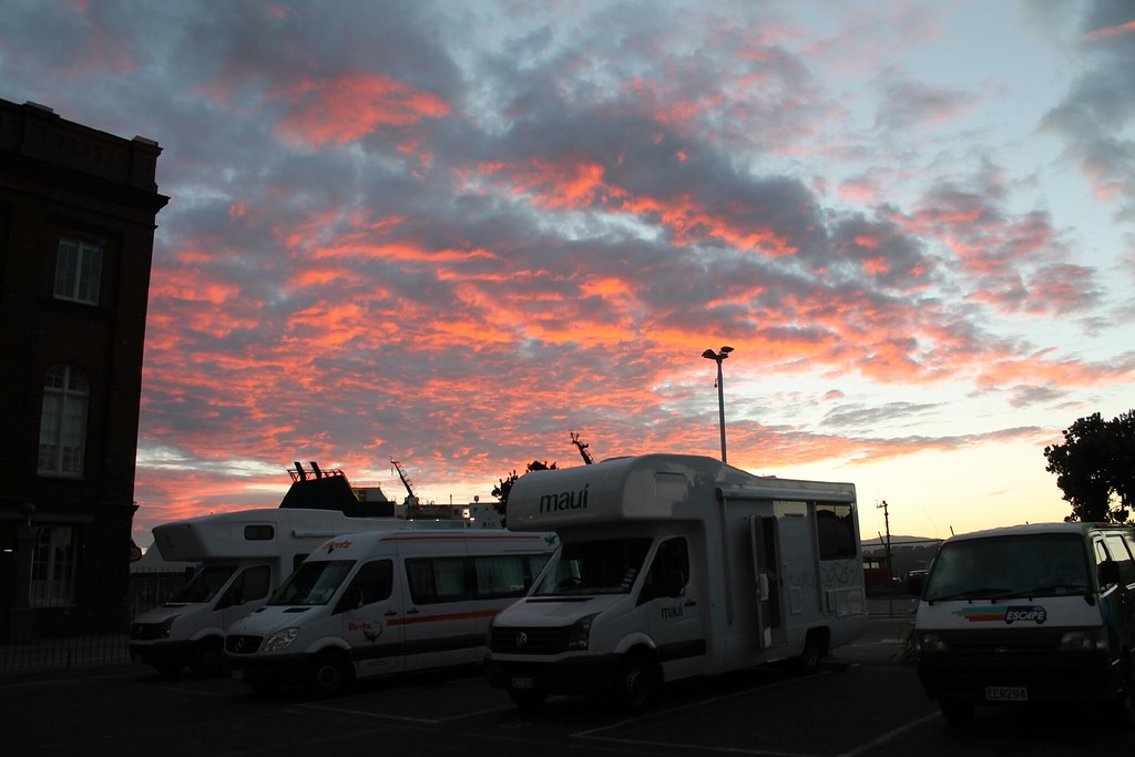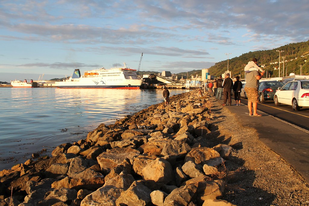 Der Wecker klingelt früh, schließlich müssen wir schon um 8 Uhr bei der Fähre sein, die um 9 Uhr ablegen soll. Wir vertrösten die Kinder mit der Aussicht auf ein baldiges Frühstück an Bord und werden mit einem schönen Sonnenaufgang in der Bucht von Wellington entschädigt.