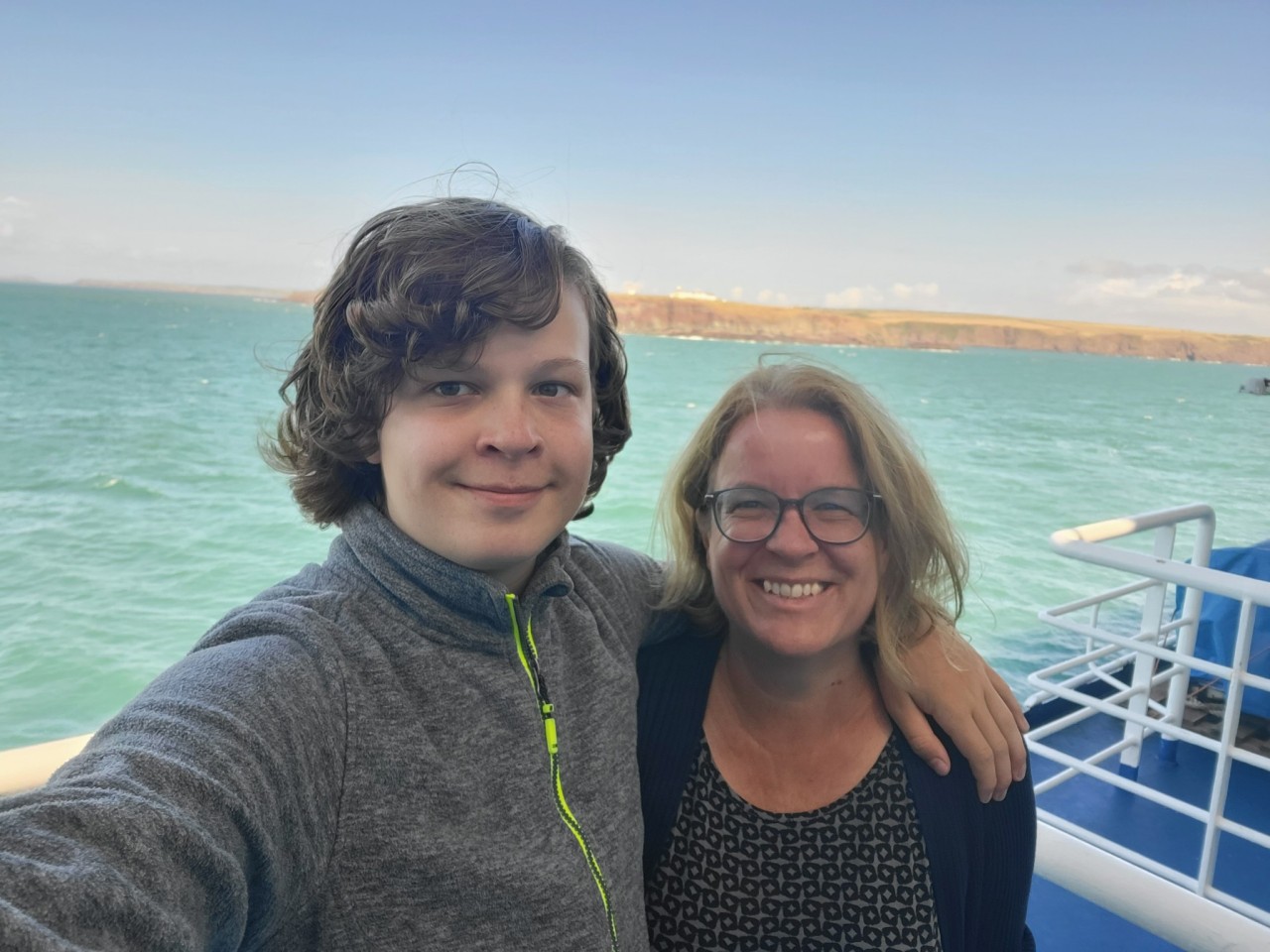 Kilian erobert Plätze mit bestem Meerblick. Da sich die Warteschlange für das teure Breakfast durch den Raum zieht, nehmen wir nur Kaffee und Croissants. Danach genießen wir vier Stunden lang spürbar den Seegang. Schlecht wird zum Glück dennoch nichtmal der Reiseleitung. Louisa erkundigt sich, ob denn auf diesem Schiff genug Rettungsboote für alle wären. Hat der Museumsbesuch doch schon was gebracht … Im Kino läuft “König der Löwen”, draußen ist feuchtwarmes Wetter, schon bald tauchen die ersten walisischen Inseln auf.