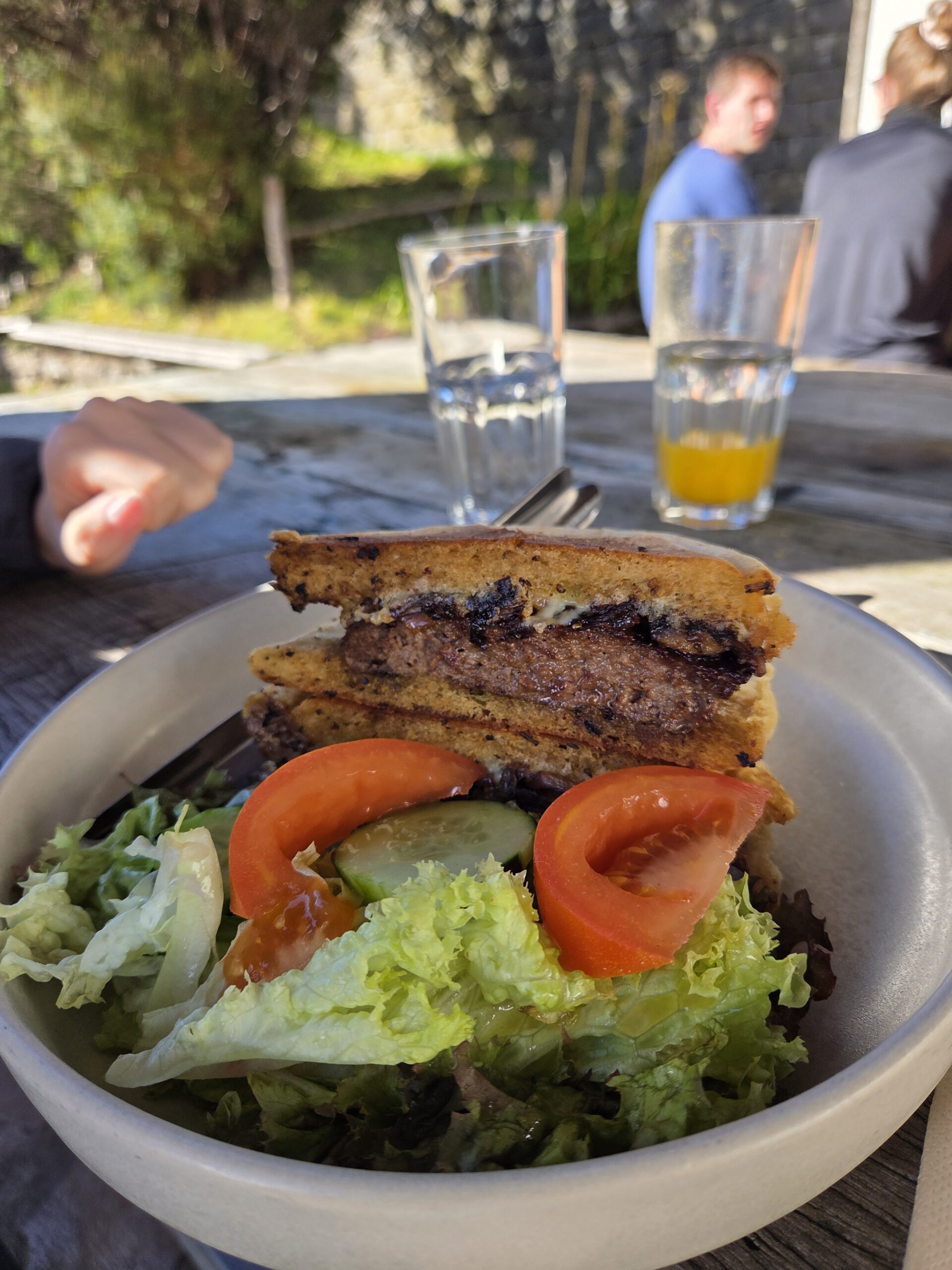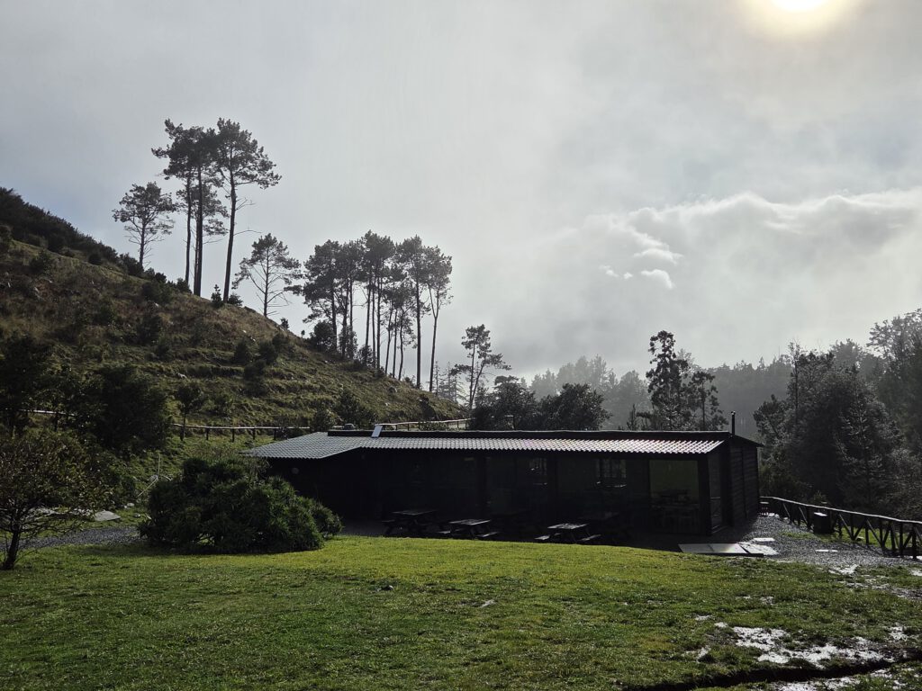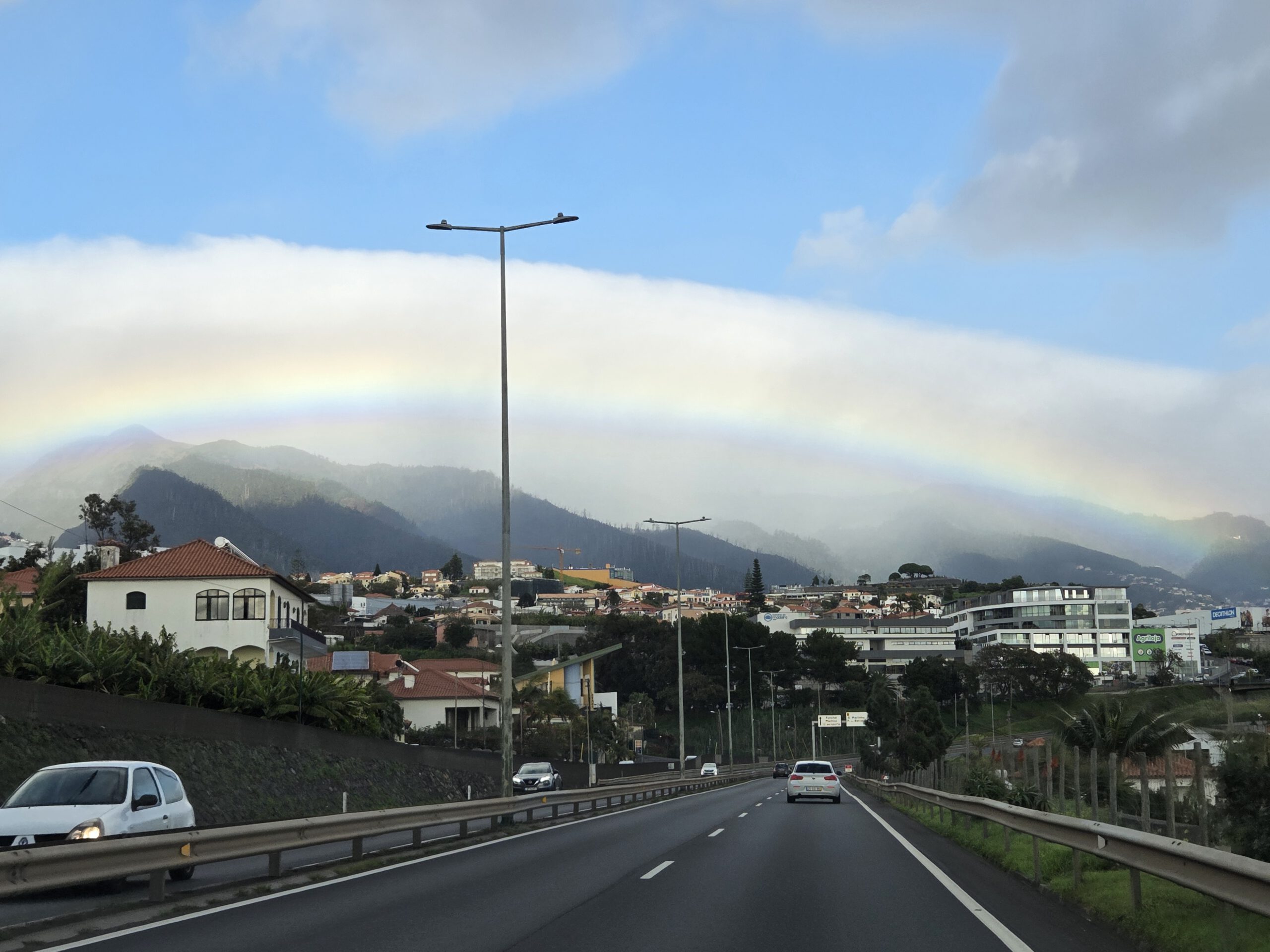 Was nun? Mit dem Mietwagen in den Innenstadt muss nicht sein. Gerald würde gerne einen Berg hoch, Nicole erinnert sich, dass ihr mal das "Forest Café" vorgeschlagen wurde, das liegt noch oberhalb vom Stadtteilt Monte. Viele Regenbogen begleiten uns auf dem Weg, jeder wird inzwischen frenetisch gefeiert. Das Navigationssystem Nicole hat wieder Tücken, Kilian nimmt sich vergnügt die Kopfhörer aus dem Ohr, "diese Comedy will ich doch nicht verpassen". Und es geht steile Wege nach oben, erst war es trocken, dann nieselt es, schließlich Graupel. Wir witzeln schon, ob es da wirklich ein Café gibt - aber tatsächlich. Im strömenden kühlen Regen bei 6 Grad wartet auf uns eine gemütliche Holzhütte mit leckeren Burgern.