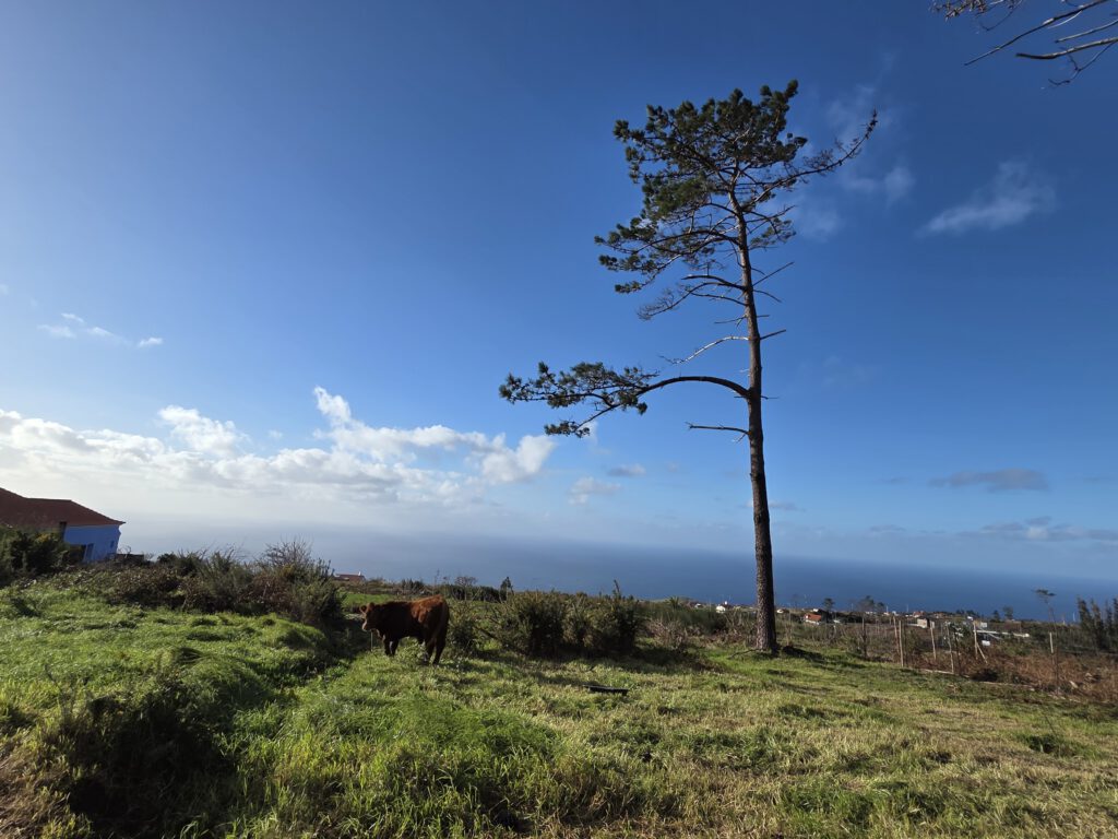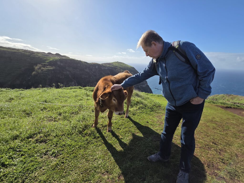 Und: Es gibt blauen Himmel! Sonnenschein! Dazu zwar eine steife Brise, aber da sind wir unkritisch. Zuerst geht es zum höchstgelegenen Leuchtturm Portugals, auf 312 Metern. Wir blicken Richtung Azoren und Kanada und bestaunen das aufgewühlte Meer. Dann, ebenfalls ohne echten Plan, nur wegen des Schildes, zum Aussichtspunkt Garganta Funda - mit 140 Metern Höhe einer der höchstgelegenen Wasserfälle der Insel. Auf dem Weg dahin wird eine Kuh geknuddelt, wir bewundern die Aussicht - langsam wird das was.