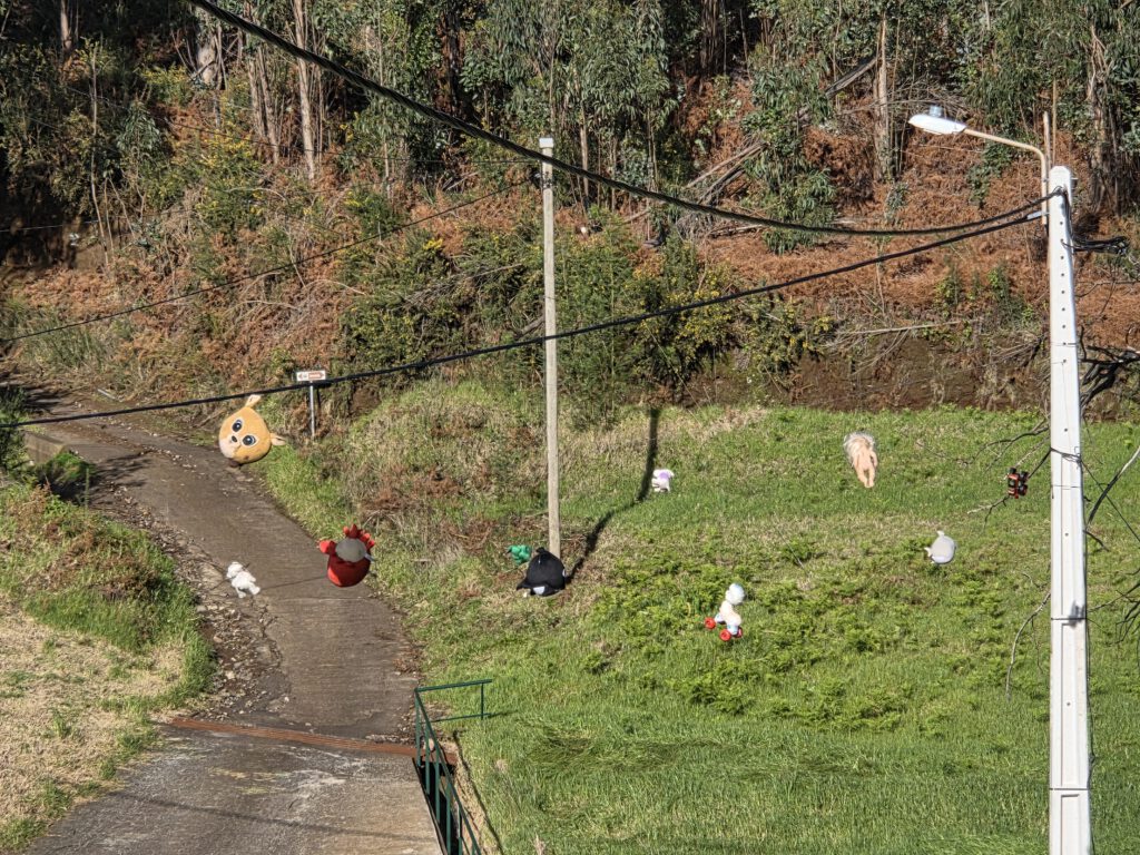 Dann geht es zu einer einfachen Levadawanderung, die komplett übe 17 Kilometer lang wäre. Aber wir ziehen einfach mal los und drehen dann wieder um - was auch nicht so schmerzt, es ist einer der blasseren Wanderungen. Trotzdem faszinierend: Der Anfang führt durch ein ehemaliges Waldbrandgebiet und mutet dank Farn und Eukalyptusbäumen sehr australisch an. Dann geht es an einem der neueren Wasserkanäle entlang - vorbei an einem kläffenden Hund, der sich wie ein aggressives Stofftier in der Tür verbeißt. Über/Unter einen störrischen Baumstamm, unterhalb einer sehr gruseligen Leine, an der Stofftiere baumeln. Der Wind ist langsam doch etwas lästig, aber wir wollen nicht klagen. Nach knapp eineinhalb Stunden drehen wir wieder um.
